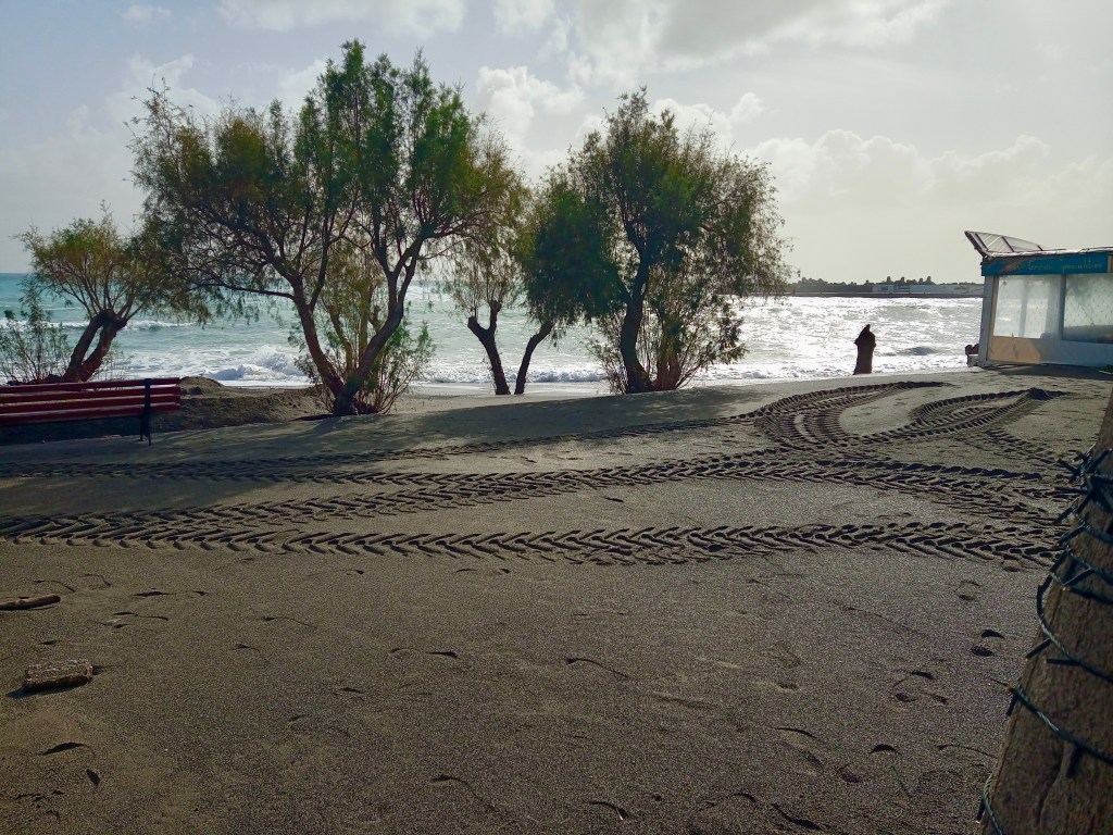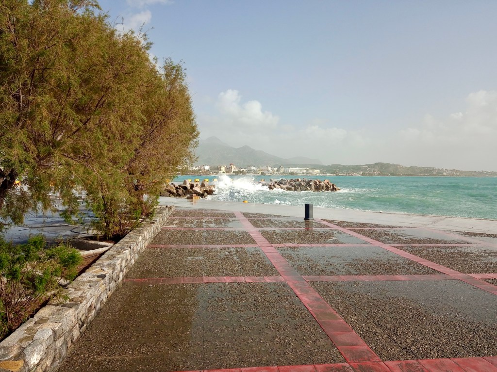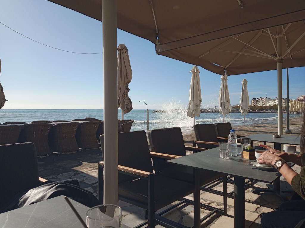 OK, so one of the above shots shows the sea creating a spume of spray along the promenade, but that doesn’t cause all that much bother there. The beach where all the damage has been done is a few hundred yards to the right of this area. Spare a thought for the likes of Yianni, and let’s hope that the winds will soon swing around to their prevailing direction, which is north to northwest, soon.