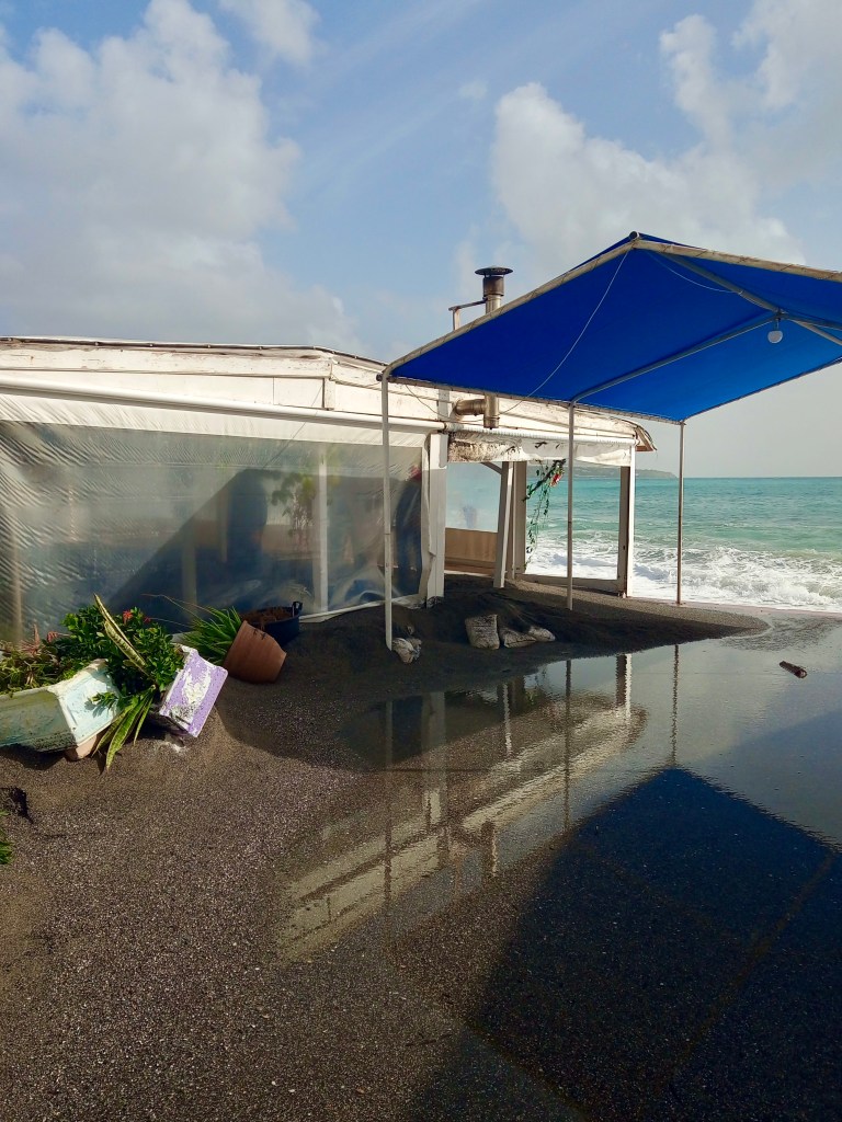What you’re looking at there is a pile of sand at least a metre high, and it was all deposited there by the sea. As we stood and gaped at this awful scene, Yiannis approached us from the restaurant building across the road. He looked extremely flustered and very dirty, as he was in the middle of trying to shovel all those tons of sand back on to the beach. What he needed in there was a mini JCB, but he didn’t have one and, anyway, whilst it may have helped with the sand extraction, it would have caused other issues with the structure of the ‘pergola,’ as they call these covered terraces along the back of the beach.