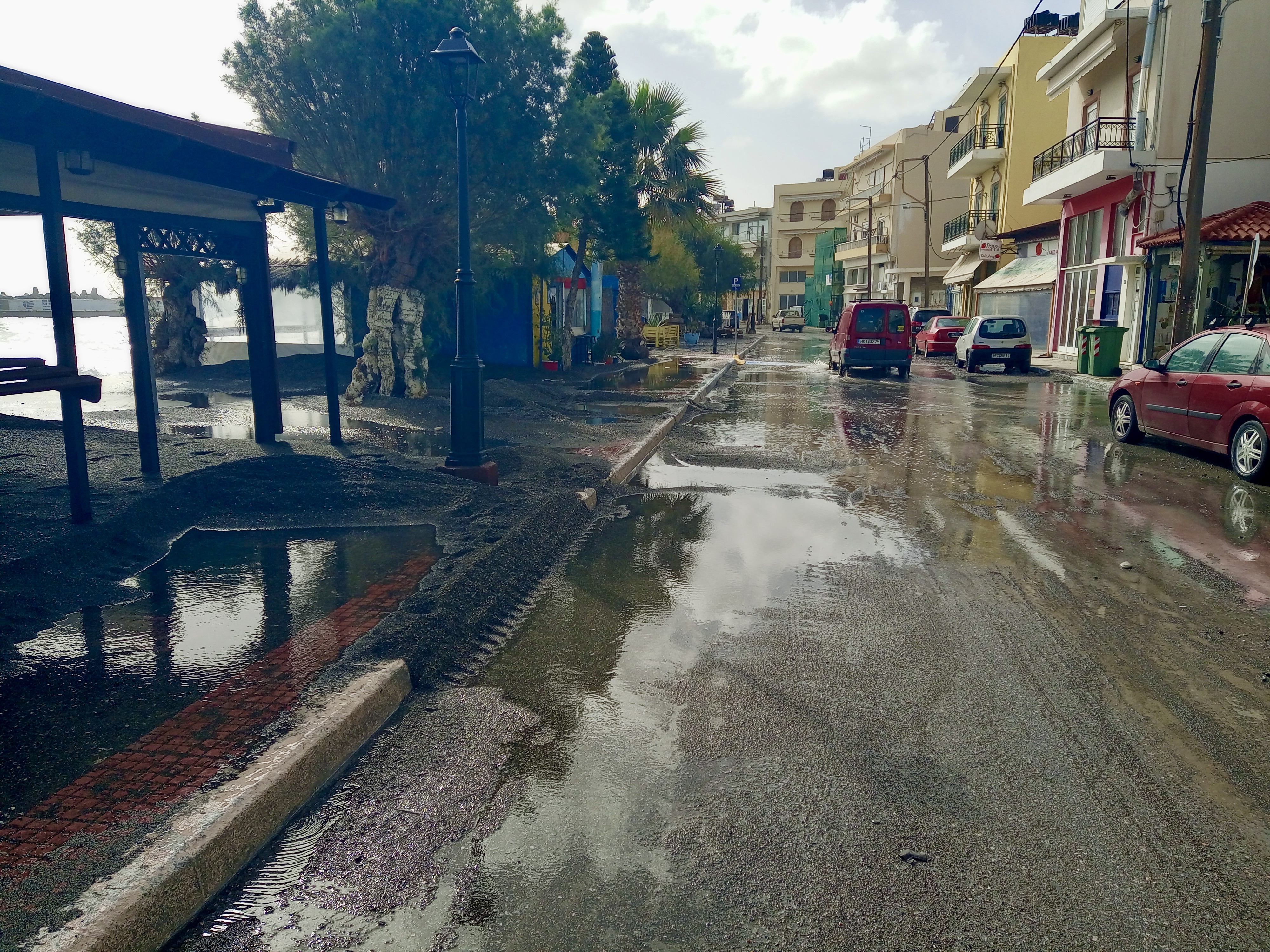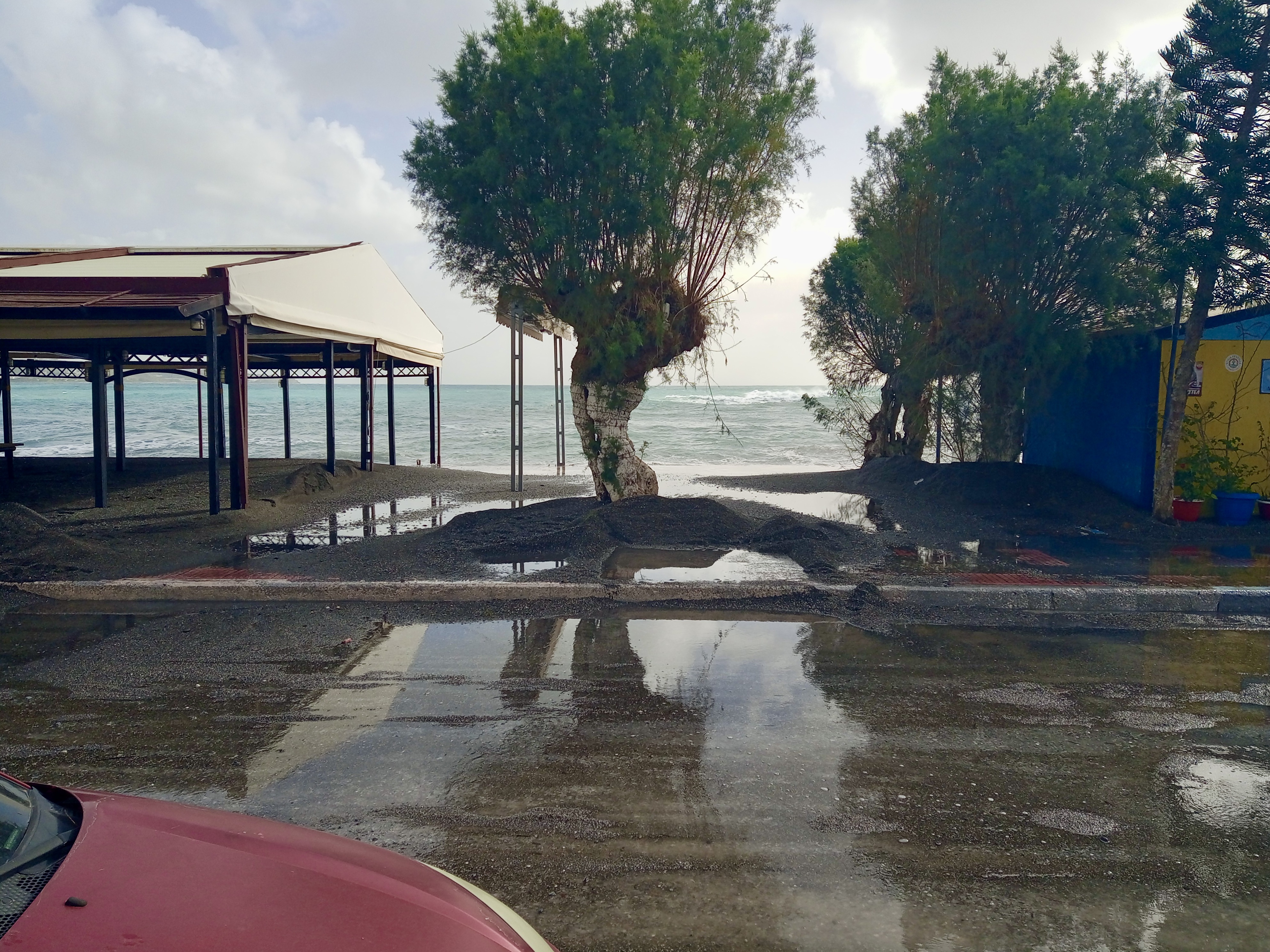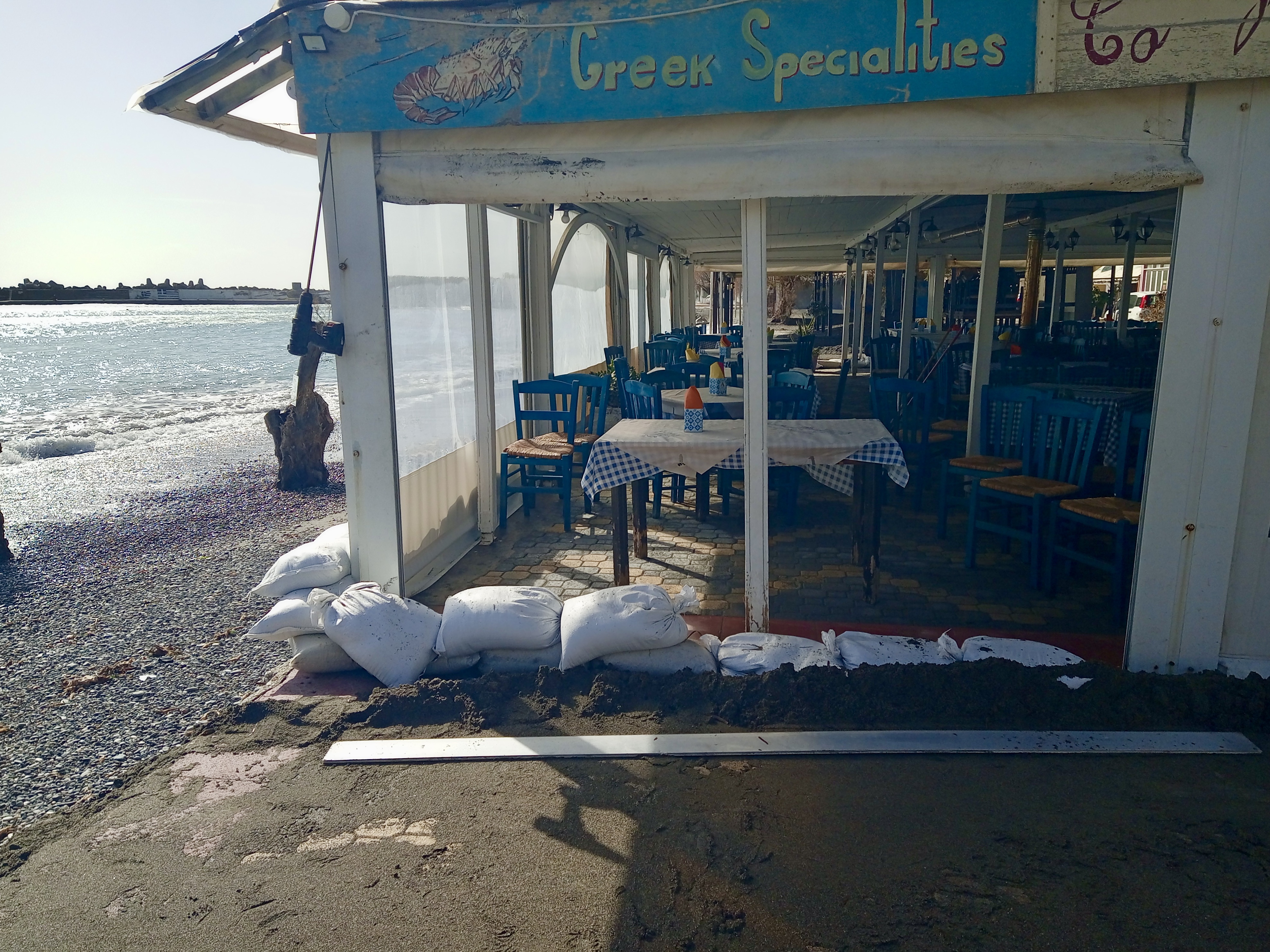 OK, so one of the above shots shows the sea creating a spume of spray along the promenade, but that doesn’t cause all that much bother there. The beach where all the damage has been done is a few hundred yards to the right of this area. Spare a thought for the likes of Yianni, and let’s hope that the winds will soon swing around to their prevailing direction, which is north to northwest, soon.