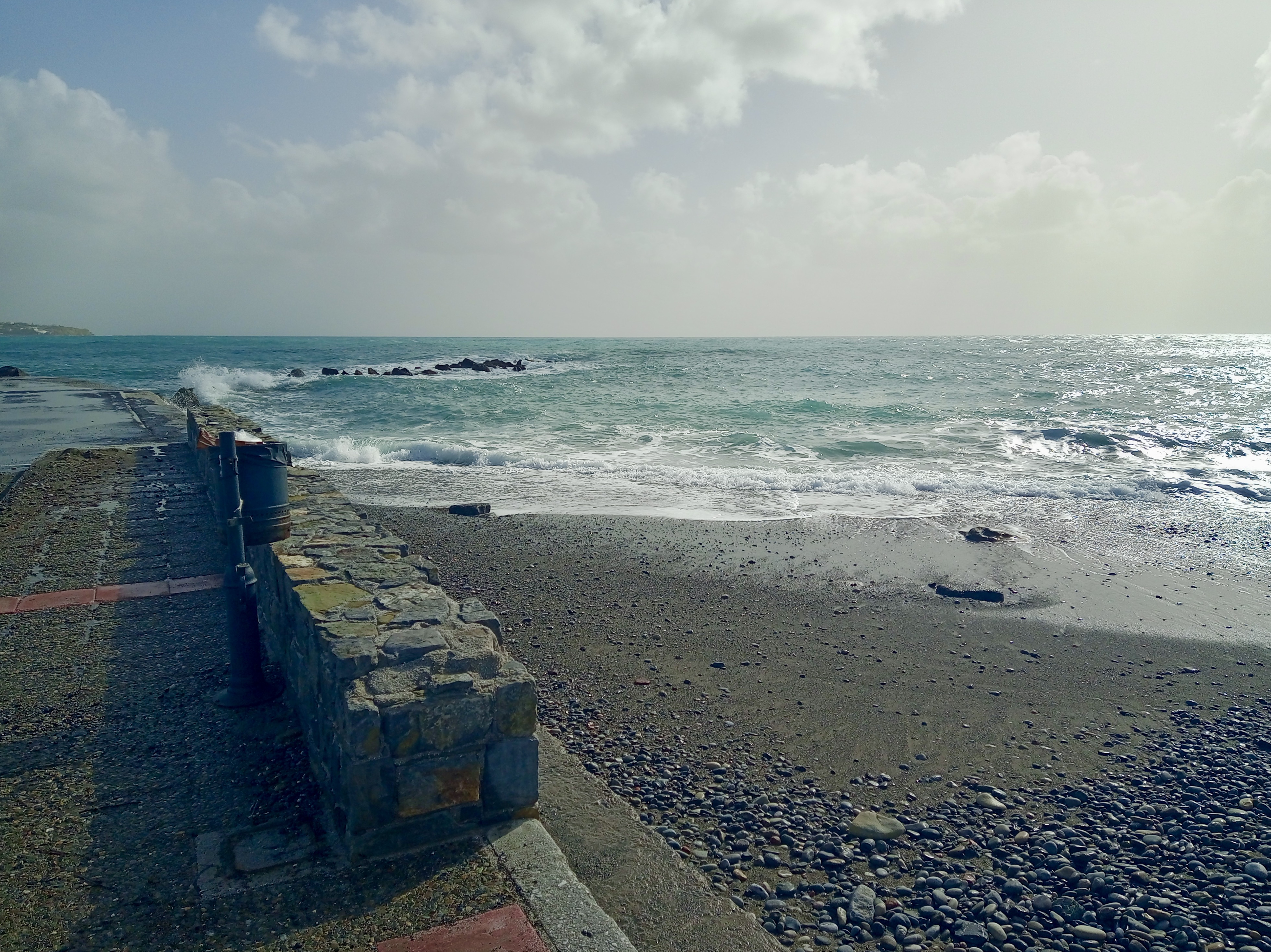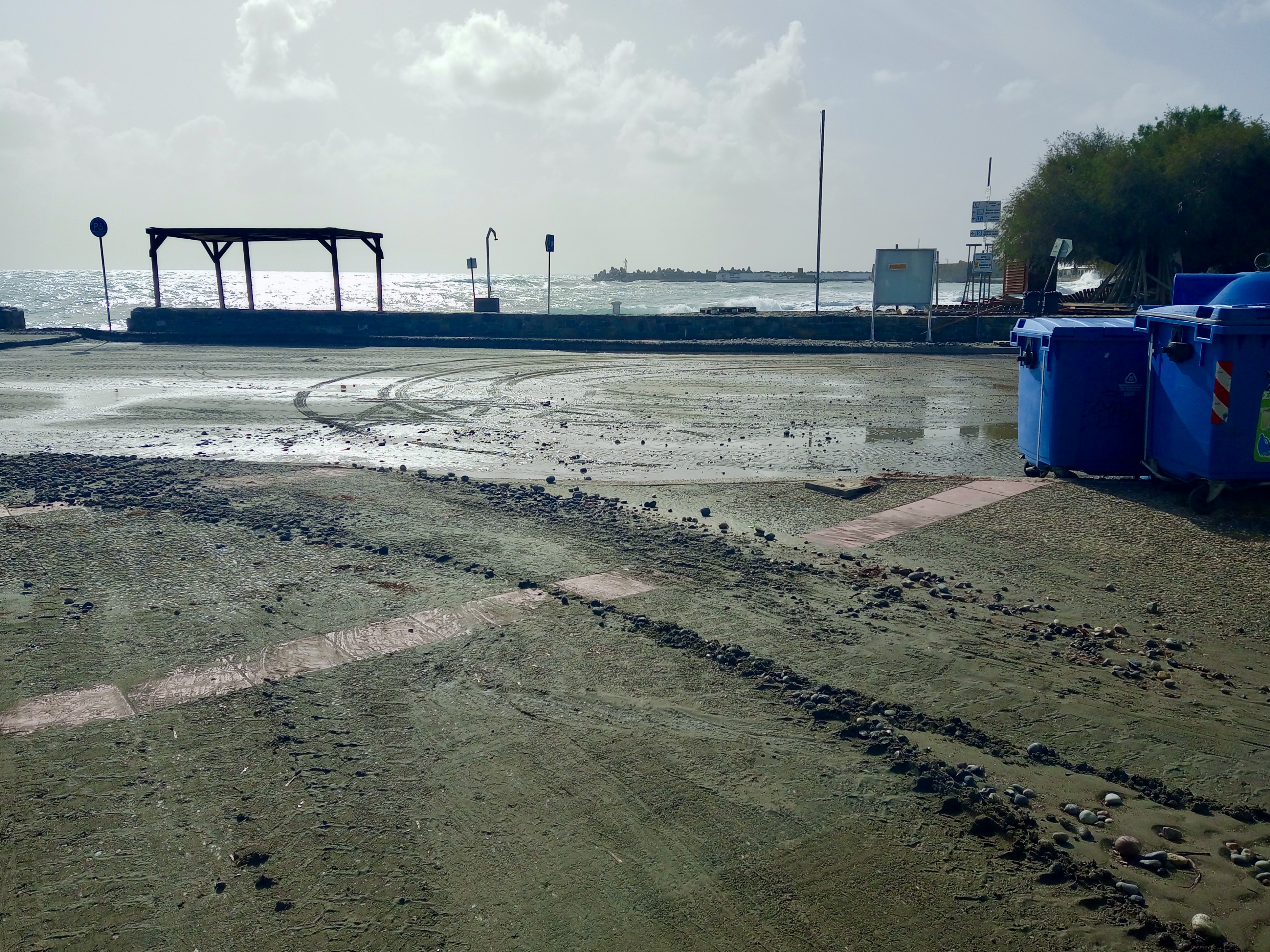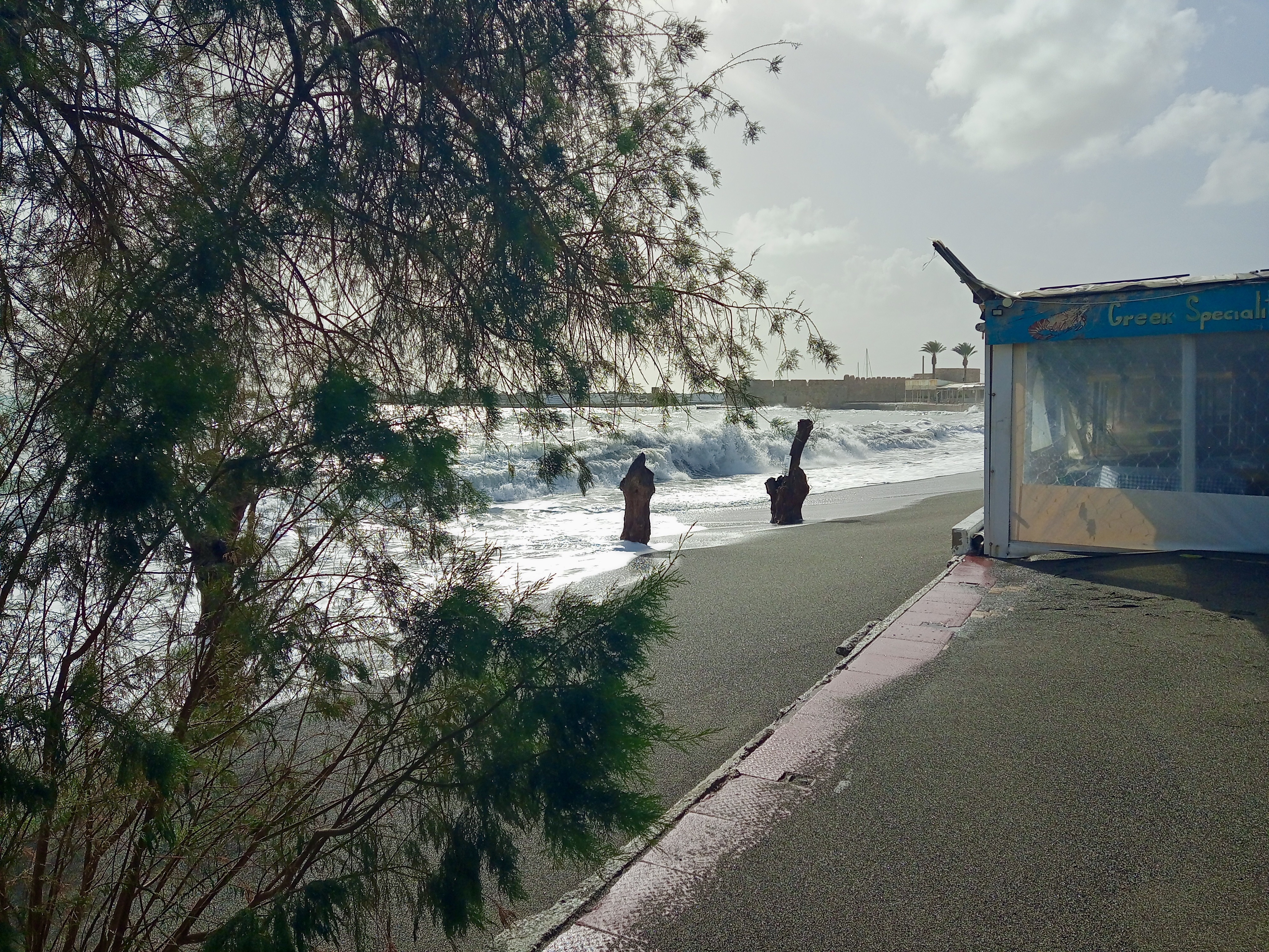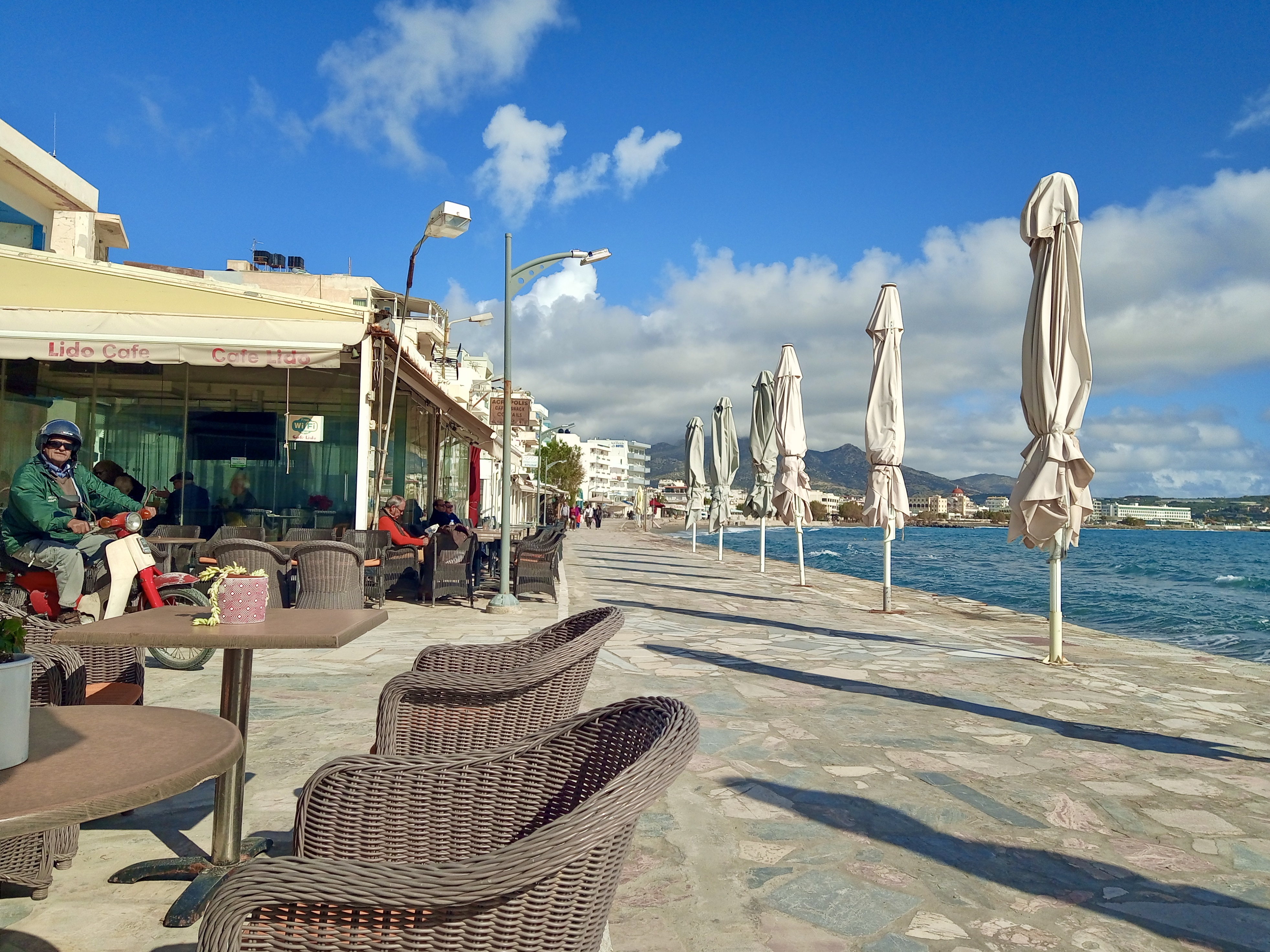 OK, so one of the above shots shows the sea creating a spume of spray along the promenade, but that doesn’t cause all that much bother there. The beach where all the damage has been done is a few hundred yards to the right of this area. Spare a thought for the likes of Yianni, and let’s hope that the winds will soon swing around to their prevailing direction, which is north to northwest, soon.