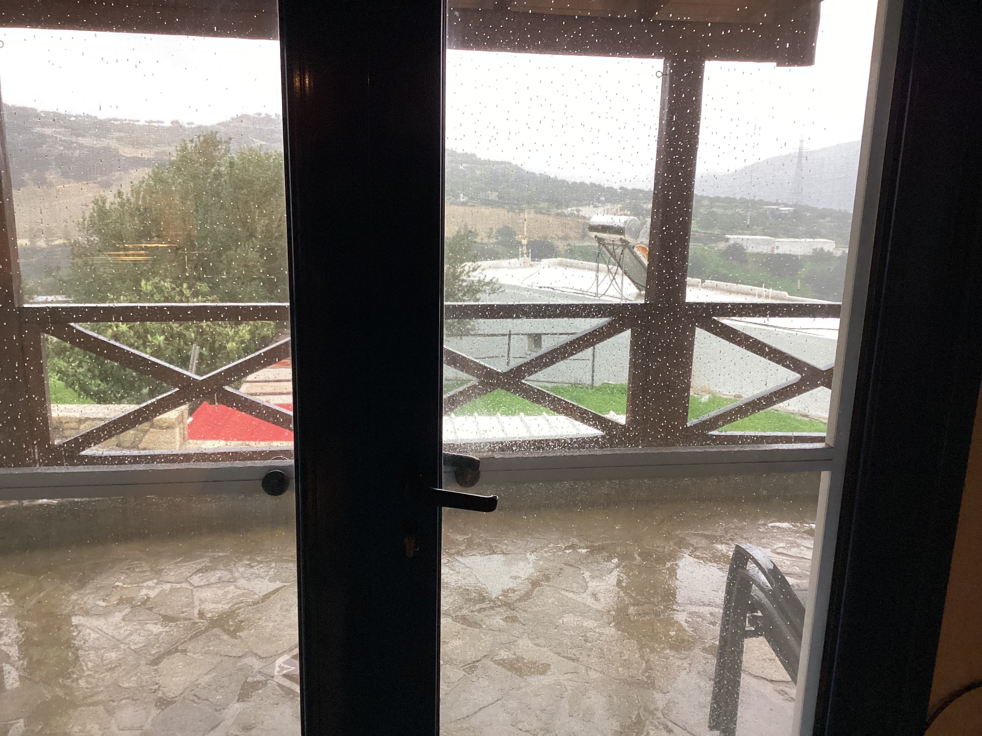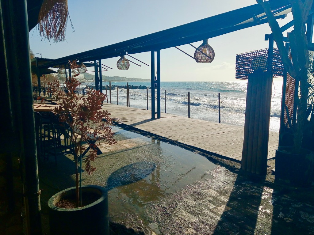 What you’re looking at there is a pile of sand at least a metre high, and it was all deposited there by the sea. As we stood and gaped at this awful scene, Yiannis approached us from the restaurant building across the road. He looked extremely flustered and very dirty, as he was in the middle of trying to shovel all those tons of sand back on to the beach. What he needed in there was a mini JCB, but he didn’t have one and, anyway, whilst it may have helped with the sand extraction, it would have caused other issues with the structure of the ‘pergola,’ as they call these covered terraces along the back of the beach.