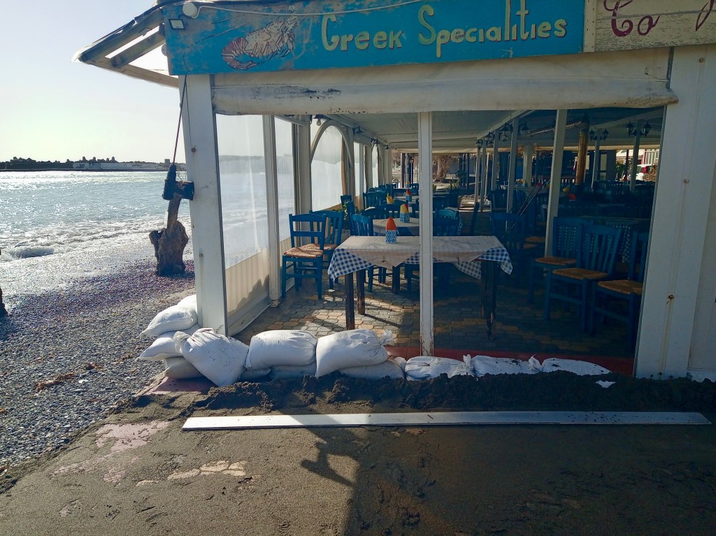 The photo at the top of this post shows just how close to the sea Yianni’s place is, and in the foreground, where you see all that sand, well that’s actually a paved terrace normally. All that sand was deposited there by an angry sea on Thursday, January 22nd. During that day the sea charged right through the restaurant and on to to the road behind it, which subsequently had to be closed for a day or two as a result…