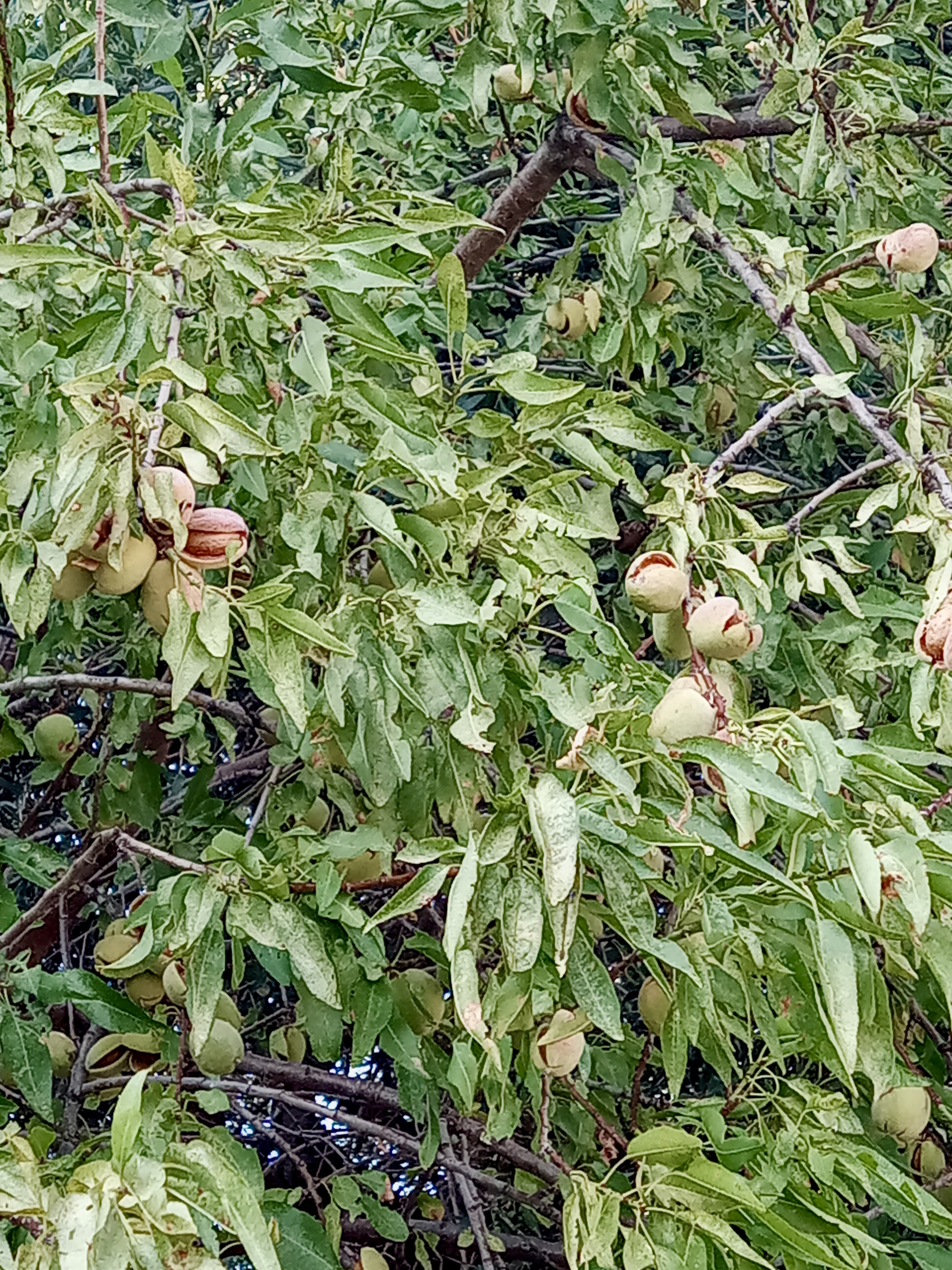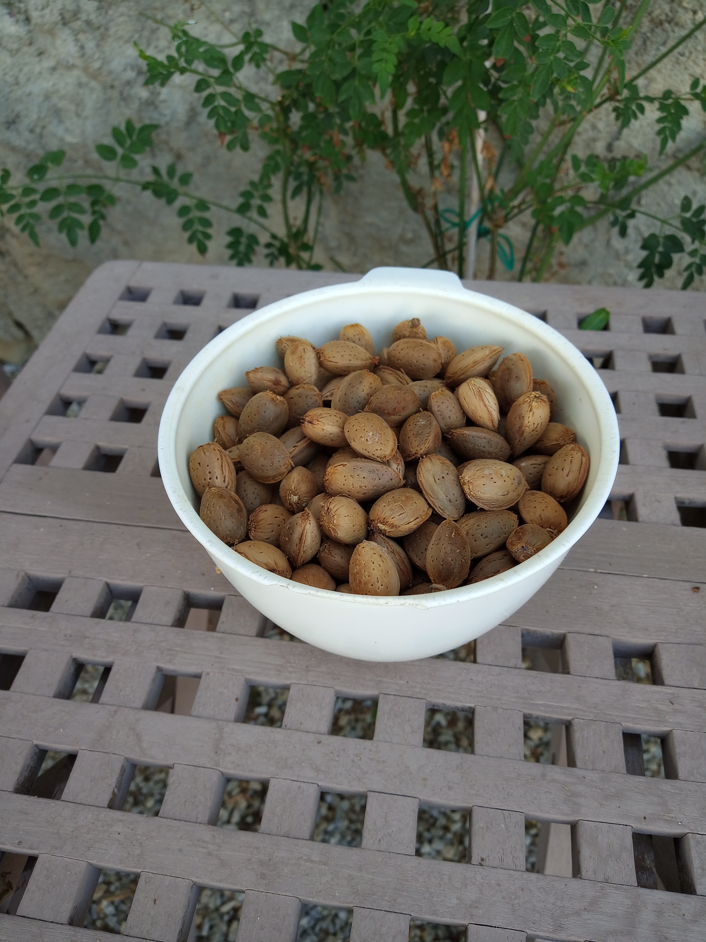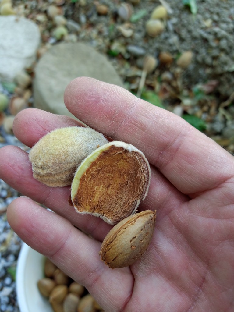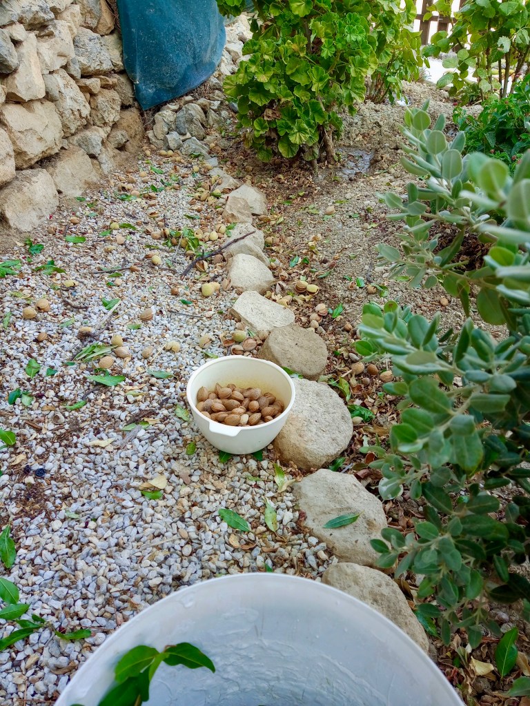 It’s the season of the almond harvest, apparently. Almonds are a bit amazing, really. If you check on any ‘expert’ listings of what are the very best things to eat, the ‘superfoods’ if you like, almonds will always be in that list. One of the greatest benefits of eating them is that they help the body to reduce harmful cholesterol, while also helping with the retention of the ‘good’ cholesterol. There are so many other benefits of eating almonds that I can’t go into them all here. If you go searching on-line, you can discover them all for yourself anyway. Greece isn’t often listed among the top almond-producing countries of the world, which always strikes me as odd, because everyone’s got almond trees here. We found this to be so on Rhodes, and we see it’s the case here in south eastern Crete too. In fact, Giannis, our nearest neighbour whose house is behind ours and whose veranda sits above our ‘top’ garden, has several trees, two of which have branches that (fortunately for us) can be reached from over our fence.