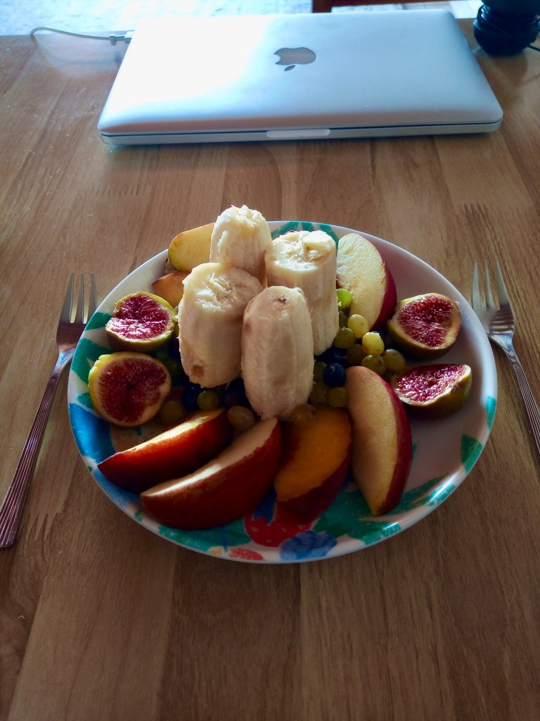 Above: Most mornings we have our chopped fruit piled up on top of our muesli, but when we opt for porridge we place the fruit on a plate like this. I took this photo because I got the distinct impression that my wife had been thinking back to that movie “Close Encounters of the Third Kind.” You get it [think: Devils Tower]? The figs, BTW, are from our own little fig tree. The grapes too, we picked ourselves.