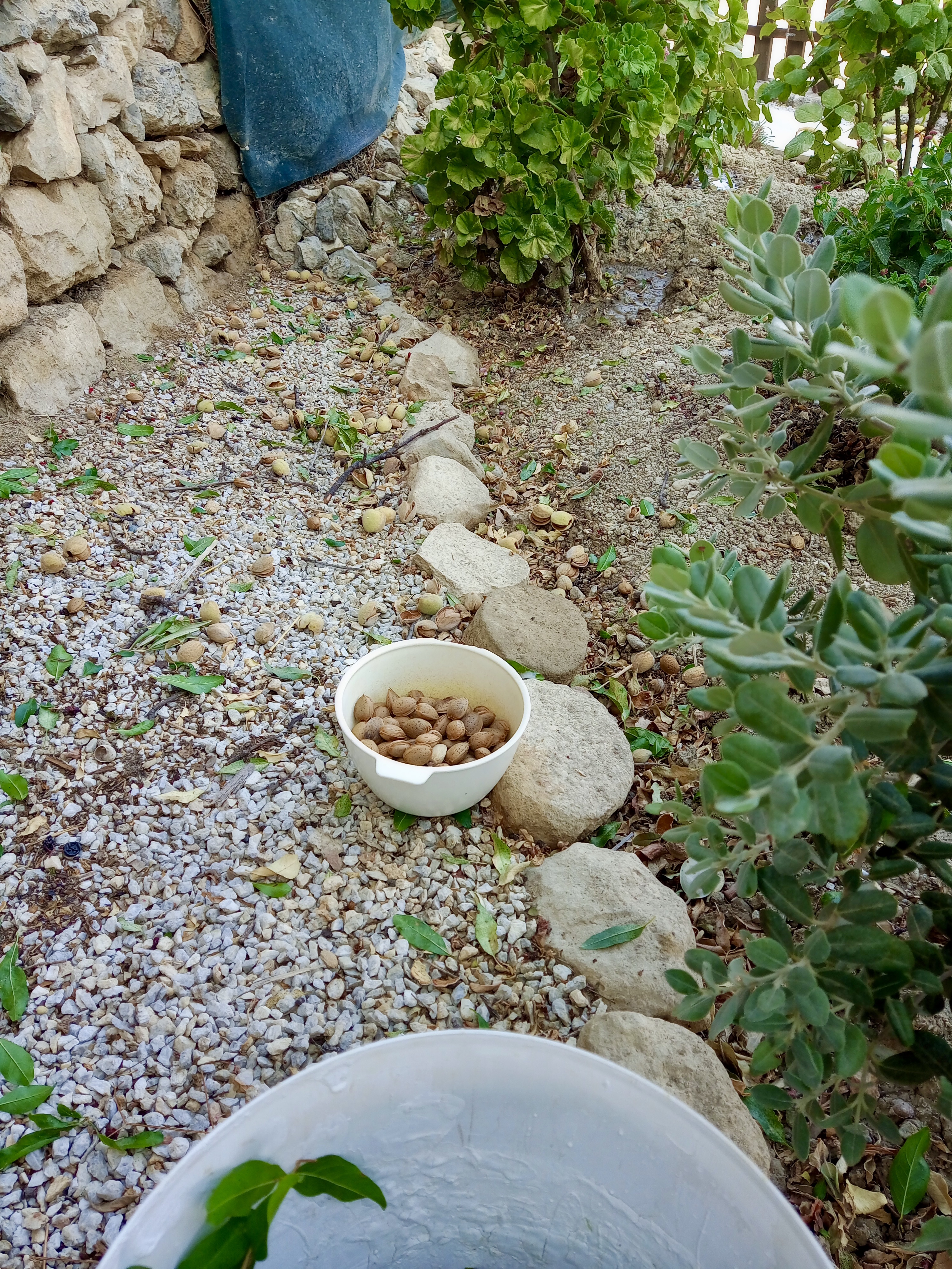 I said that they were delighted when I began gathering up the almonds that fell in our garden and placing them in a bowl, and truly they were. Giannis said from further up the slope, woodsaw in hand where he was lopping some of the more slender branches, “Excellent! yes, Gianni, any that fall on your side, you must gather up, with our compliments!” Not that I needed much encouragement.