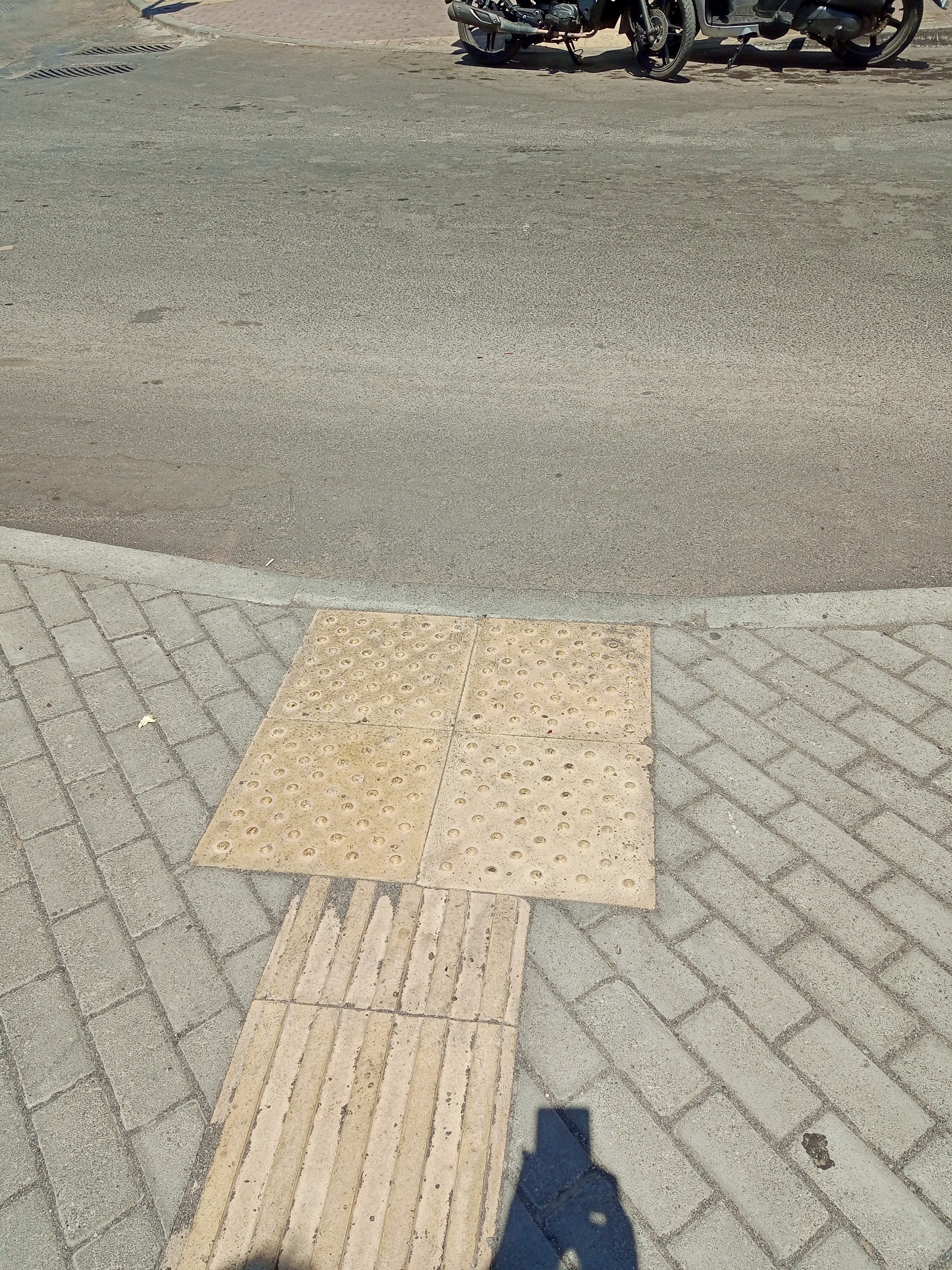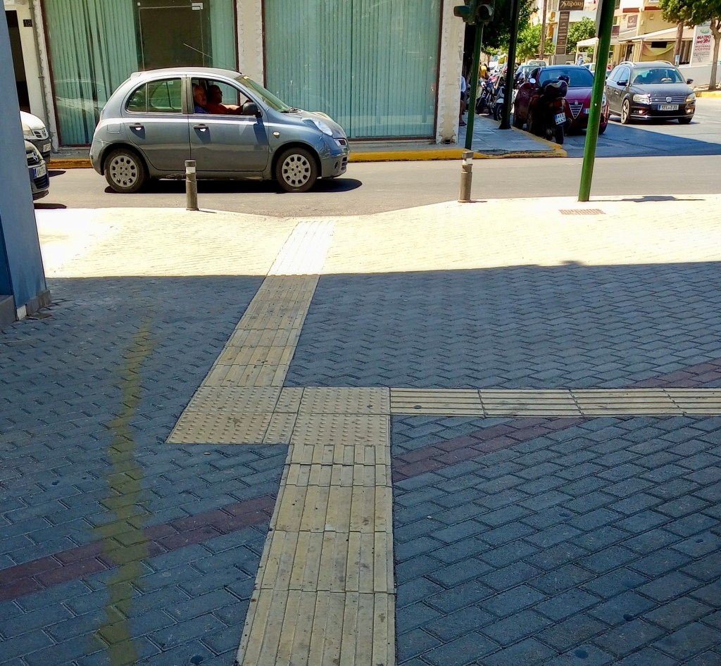 Above: Now here’s something that I’ll bet you didn’t know. If you walked any streets in a Greek town or city lately, you’ll have seen these grooved or dimpled paving slabs around the place, I’m sure. I always thought that they were a rather daft attempt at making the pavements (sidewalks, guys) more interesting and nothing more. I now know different. A Greek friend of ours who walked us around when we were looking for somewhere recently was able to enlighten us. Those slabs serve a specific purpose for those who are visually impaired. The grooved ones tell the walker that they can proceed without worry (I’d qualify that here in Greece though!), and the dimpled ones tell the blind person that they’ve reached a junction, often a roadside kerb, so that they will know to stop and check before proceeding.