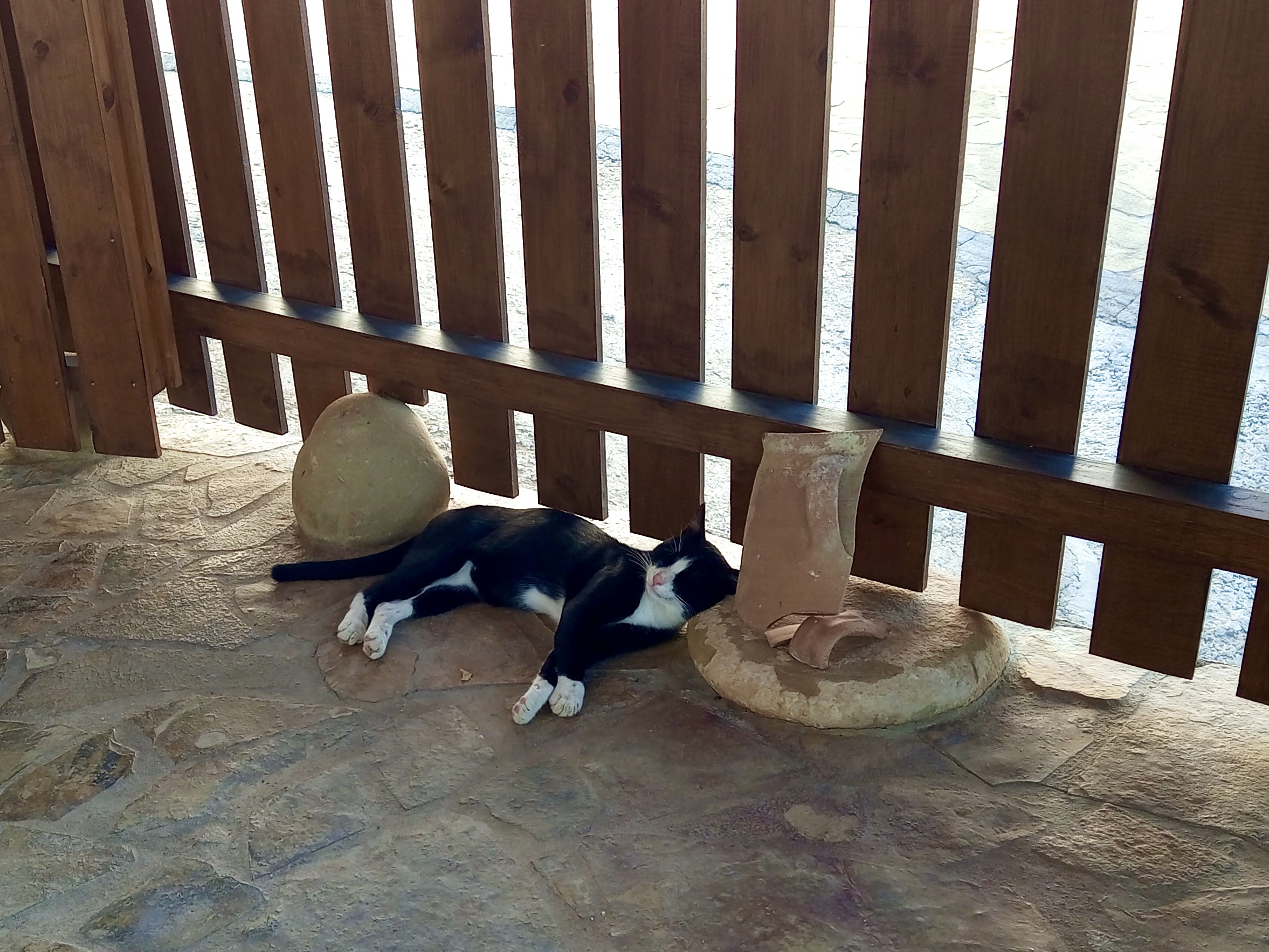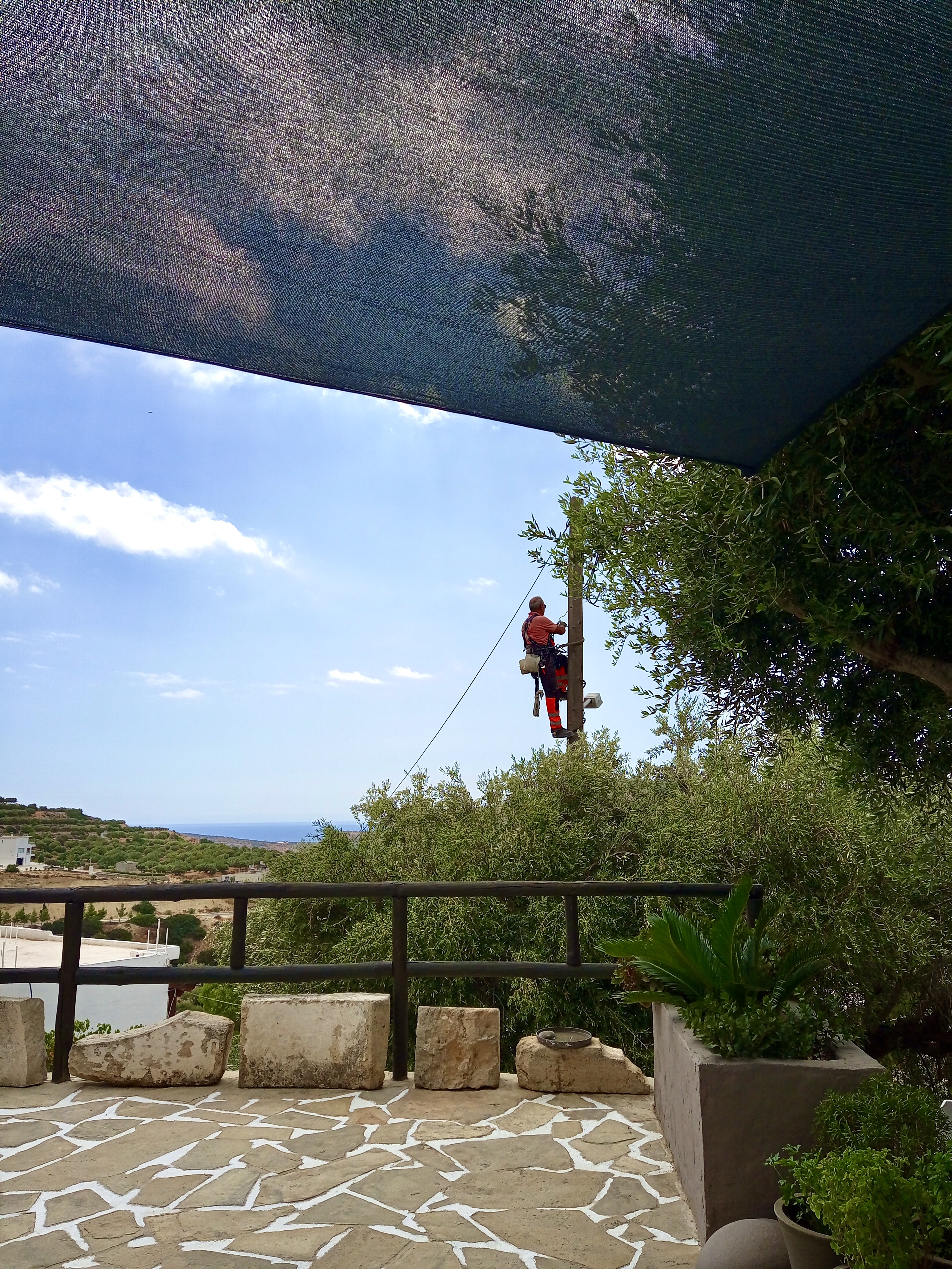 Above: Going up the pole, eh? There we were sitting under our ‘sail’ (that’s the large grey thing in the top of the photo) enjoying our iced coffees on our terrace the day before yesterday, admiring the progress we’re making in “Naxos-izing” the floor area, when this truck pulled up beneath us, and a couple of council workers got out. I asked them if they needed any help, to which they replied, “No, we’re just fixing streetlamps, thanks.” Next thing, this chap’s shinning up that pole with what looked like a couple of shark’s jaws attached to his feet. They’re very nifty gadgets and quite fascinating watch. Anyway, no sooner had he gone up there, than he was on his way back down, job done, and they were off.