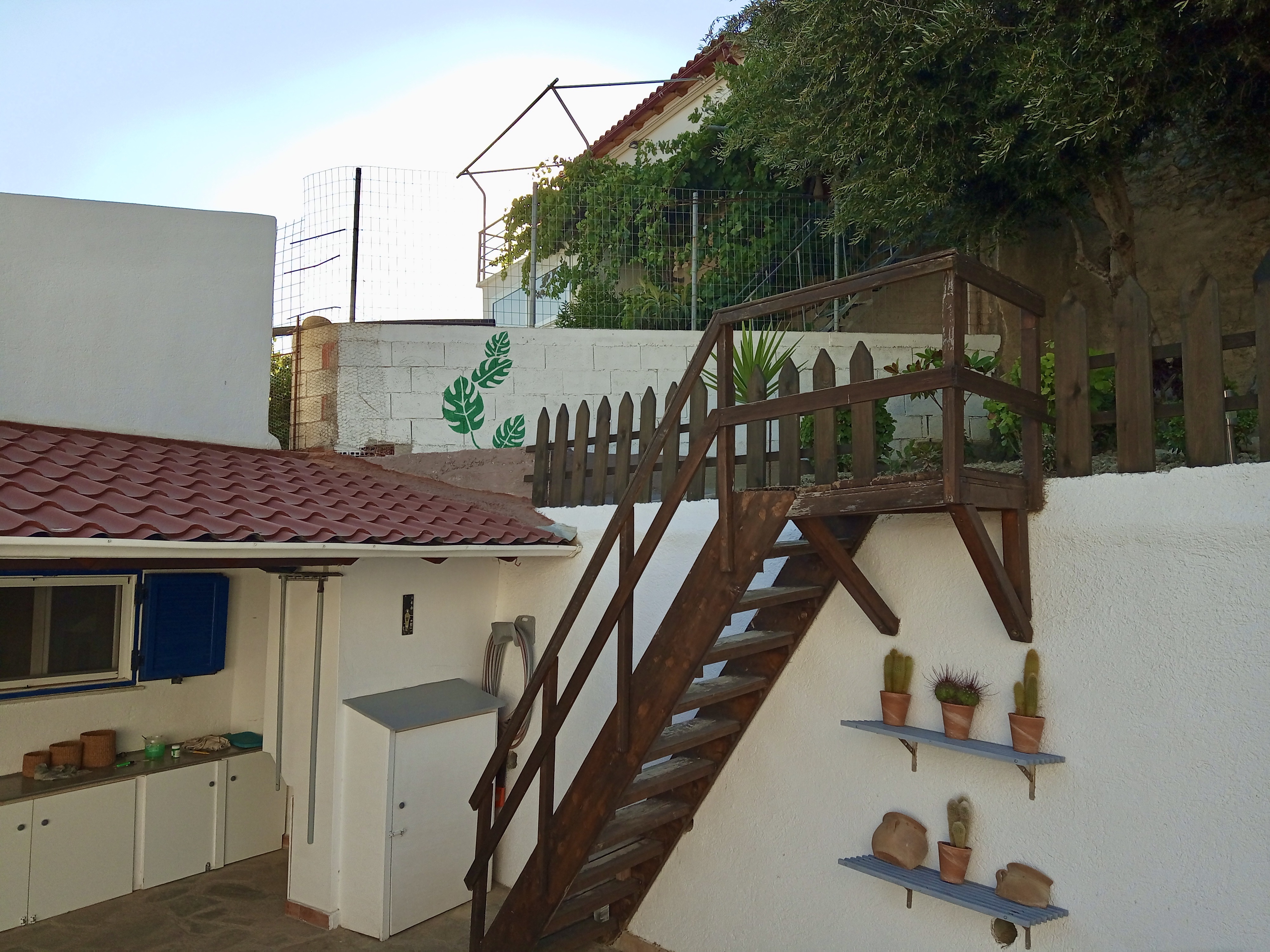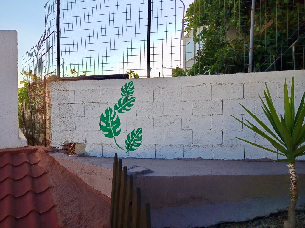 Above: What do you think of my leaves? Yvonne decided that the wall was too plain and suggested that I add something just to make it slightly more interesting. It’s the wall that boundaries the small yard of Giorgo, who lives in the house above that vine, partially obscured by our olive tree.