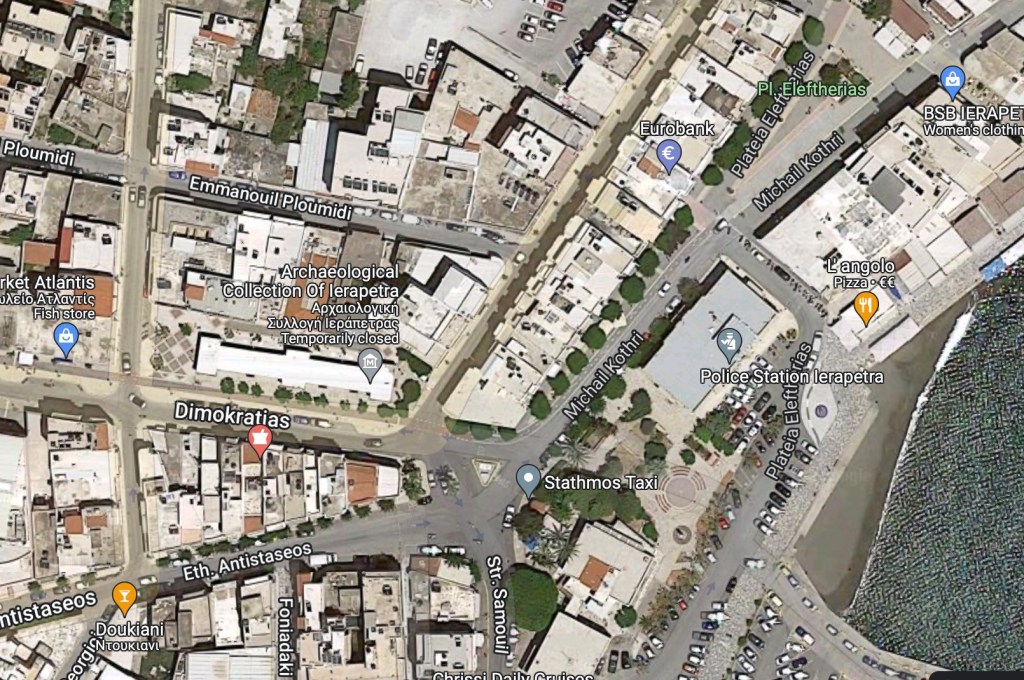 Above: ‘Behind’ the newly renovated and reopened Archeological Museum in Ierapetra late at night. I’ve added a satellite image below so you can see the Museum’s location in the town…