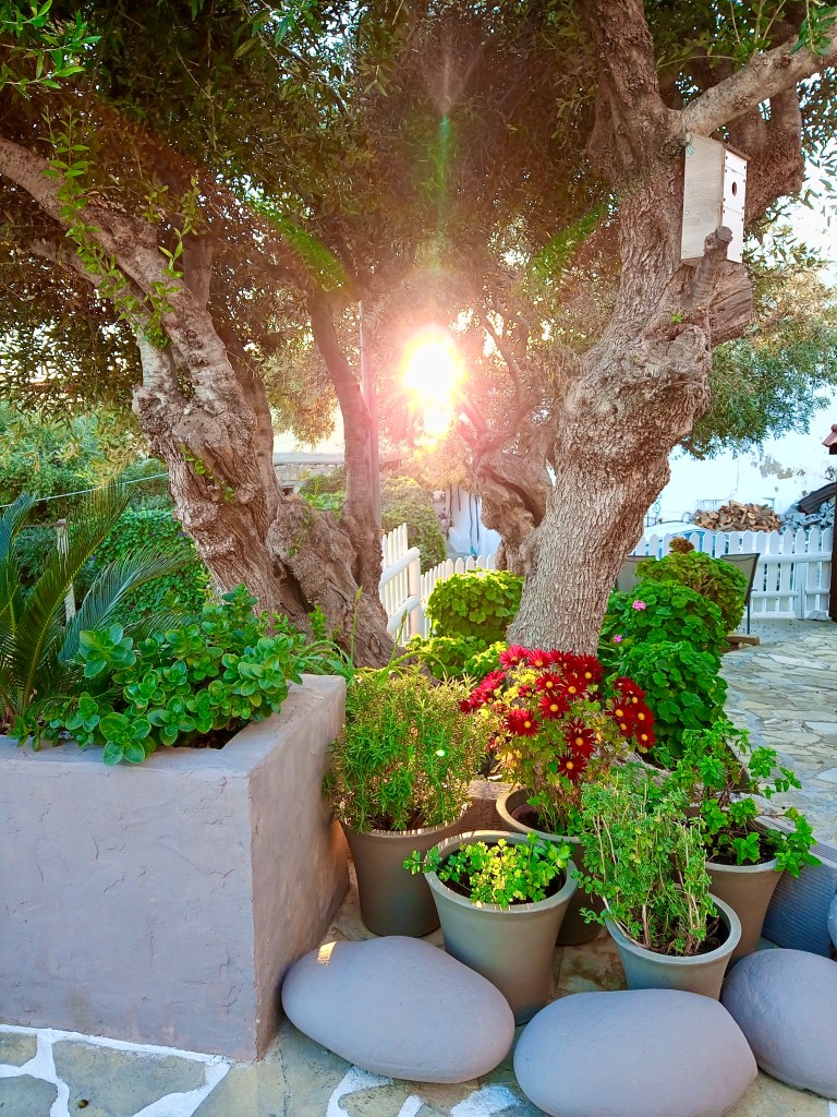 Right from our veranda this past couple of days we’ve seen early olive harvesters getting stuck into the work from soon after dawn (see photo at the top of this post). At around eleven in the morning the women arrived from the village with a packed lunch and some drinks, and the team doing the harvesting took a while to sit on upturned crates or the back of the pickup while they chewed on their bread, cheese, olives, tomatoes etc and drank coffee, or even raki or retsina. We often see whole families harvesting together too, where the men set about the trees with chainsaws and agitators, and the women get busy collecting the olives that have plummeted to the nets below and either pour them into crates or sacks for transportation to the mill.