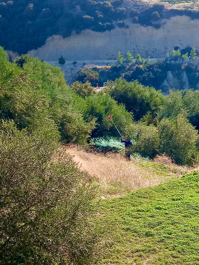 The olive harvest is a joyous time, even though it’s extremely tough work. When Yvonne and I did it back on Rhodes, we seldom got home in the late afternoon without a selection of scratches and scrapes along both of our forearms, and our limbs would ache from the exertion. Olive harvesting is not for the physically feeble. As I write this on Tuesday November 15th, it’s a month to the day since we last had rain, and that was the horrendous storm that wreaked havoc across many of the towns and villages mainly to the west and north of the island.