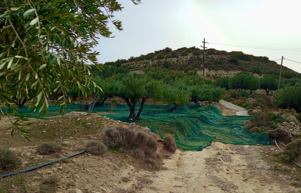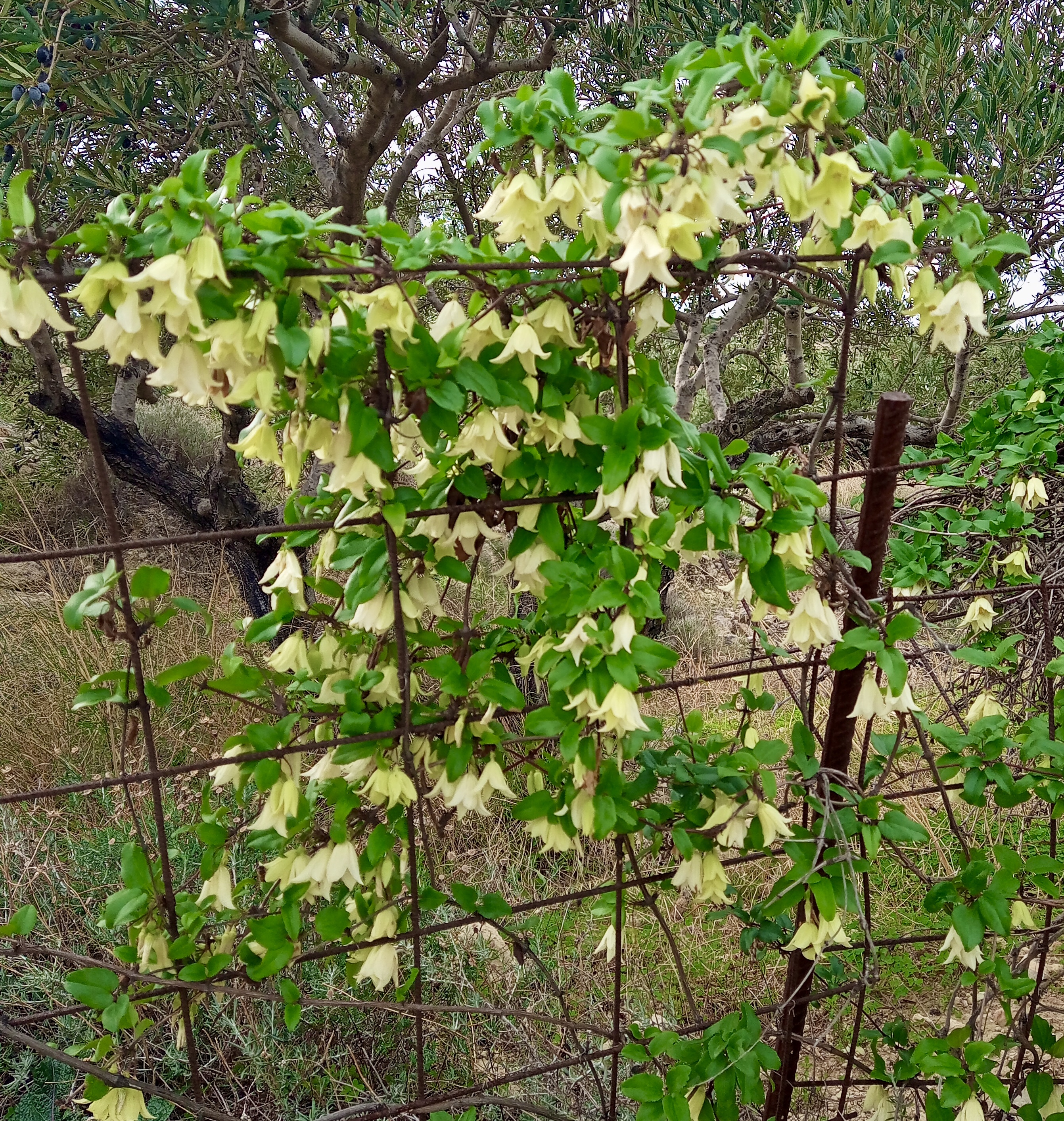 That plant with the creamy bell-shaped flowers was really lovely and it adorned a metal fence around one of the olive groves. If anyone can tell me what that plant is, I’d be very grateful, thanks. I did have an app on my phone which was supposed to tell you what a plant was when you pointed the camera at a flower, but the thing got on my nerves and was cluttering my phone up to be honest, so it got trashed, and then, of course, I found a need for it! The nets, of course, are a dead give-away regarding what time of year it is, as we passed a family group busily harvesting their olives during that particular morning walk. They’re not in the shot because as we passed they were all hanging around their 4×4 pickup taking their morning break.