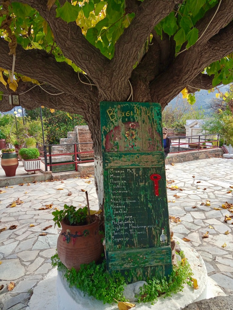 This past few days we’ve had quite a lot of interaction between ourselves and our neighbours in the village and its environs. We did a walk up the mountain on the opposite side of the valley, where we encountered Evgenia, wife of Manoli, the couple we met whilst walking there last winter. They have a house in the town, but usually weekend in the house on the hillside, across the way from the village. Evgenia was in one of the olive groves beside the lane, and was harvesting olives by hand, literally picking them like cherries. She realised that we were slightly nonplussed at the sight of the method she was employing, since it would mean that to harvest even the one tree would take about six months. Holding up the receptacle into which she was chucking the olives she’d picked, she explained that she was simply collecting enough to prepare some jars of ‘eating olives’ and that their proper harvest was carrying on apace over the hill, where hubby Manolis was currently labouring away. We asked her how many trees they have, to which she replied, “Oooh, about a thousand.”