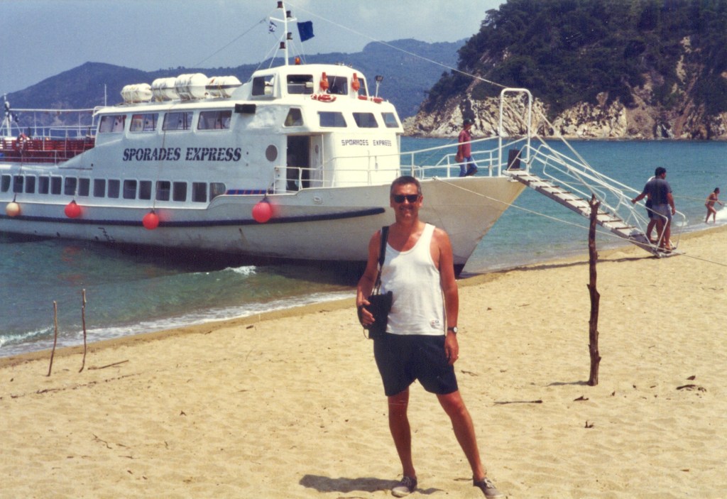 Before I start sounding off, this time I thought I’d begin with a photo that’s a blast from the past. The shot above was taken on a Skiathos beach in 1998. Actually, since moving to Greece I’ve been in better physical shape than I was in this picture, mainly owing to the more active lifestyle we lead here, whereas back then I was a graphic designer sitting most of the time at a drawing board and, at about that time too (circa 1998) the Macintosh came into the studio and we began pushing mice around instead of moving the parallel up and down the board. The hair actually still had some colour then too, and it wasn’t out of a bottle. That rather large black thing in my right hand, complete with shoulder strap, was my video camera. Blimey, things have moved on a bit haven’t they? I can take infinitely better quality video now with my phone, that’s hardly much bigger than a playing card, than with that VHS contraption that we used to think was the bee’s knees back then.