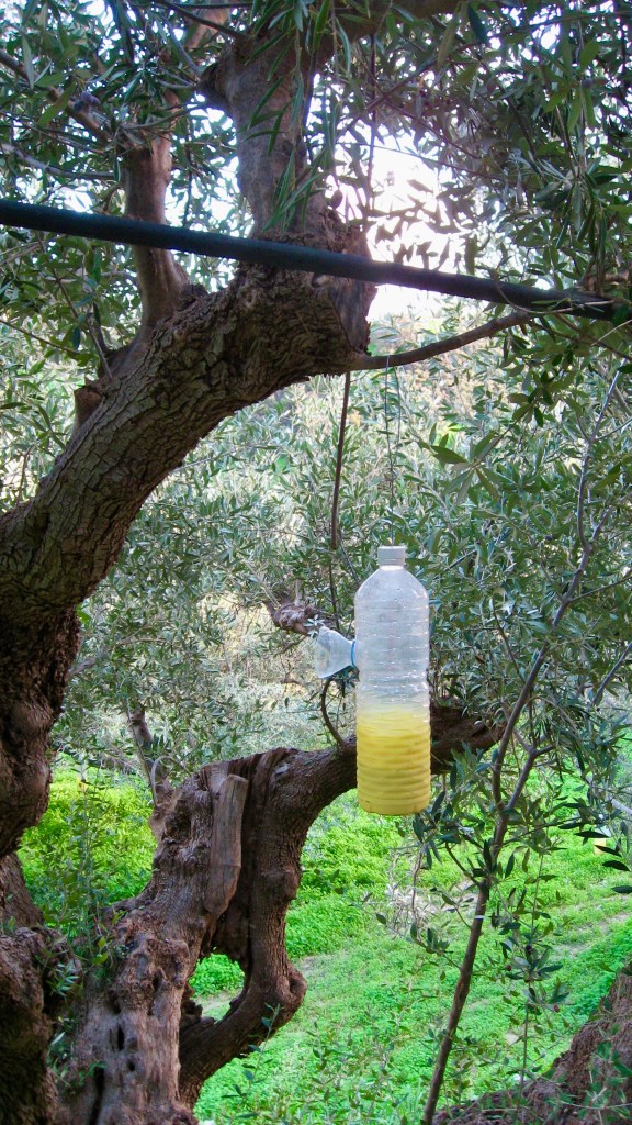 In the zoomed shot of the village, with the sun’s last rays illuminating all the walls, our house is clearly visible. It’s the one right above and behind the gleaming white house just right of centre. If you look closely, you can see the square mural of a white background with a Greek urn and a little piece of climbing vine wrapped around it, which I painted on the back wall of our upper garden, below Gianni’s terrace, which is just to the right of the stone balustrading (Giorgo’s place next door). Our veranda is easily discernible, and there is a picture hanging on the house wall to the right of our full-length bedroom window. Our balustrading is wooden, with that ‘x’ effect design. The bottles hanging from the olive trees in the other shots are insect traps, thus showing that these farmers aren’t using chemical sprays, but rather a mixture of fruit juice and jam, which does the job well enough. Once the insects get inside that bottle, they won’t be coming out again.