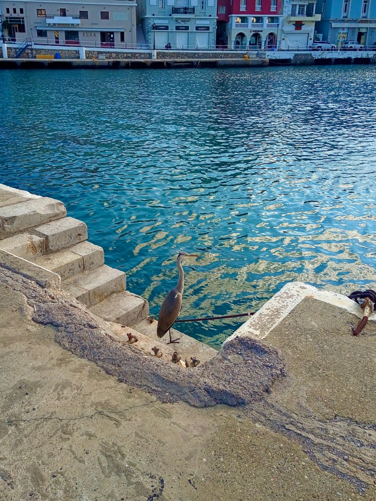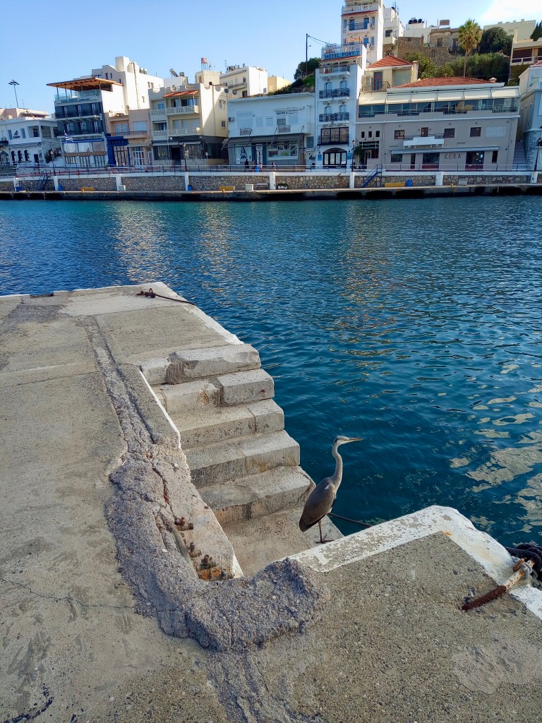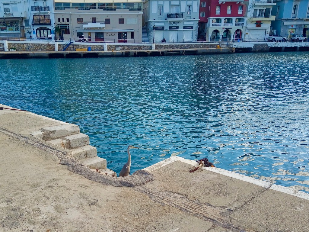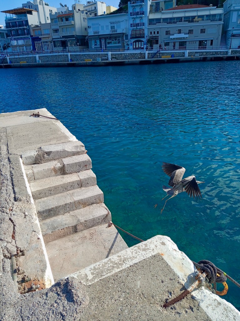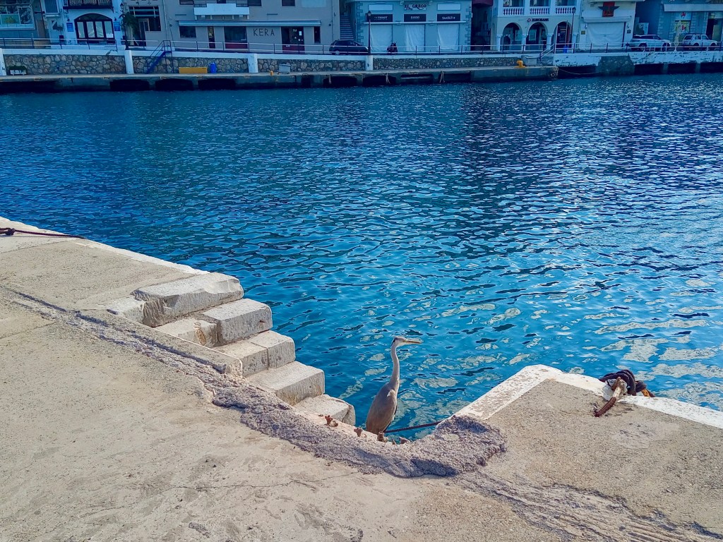 Taking the route over the mountain from here, passing the villages of Meseleri and then Kalo Xorio, we hit the main road at Istros, where we turned left and headed up the by-pass towards our destination, Agios Nikolaos, bent on simply walking the town, enjoying a coffee out and then coming home for lunch after a couple of hours. If you’ve studied the photo at the top of this post, you’ll no doubt have spotted the grey heron flying away from me across the Ag. Nik harbour. That photo was taken at around 12.30pm, and it’s usually about as close as one ever gets to such a gloriously grand bird. Grey herons usually don’t let you get within about fifty metres of them before doing what that one’s doing – fleeing; but hold on, don’t go away, because if you love birds, as we do, though I may say so myself, I have some truly remarkable photos for you just a little further down.
