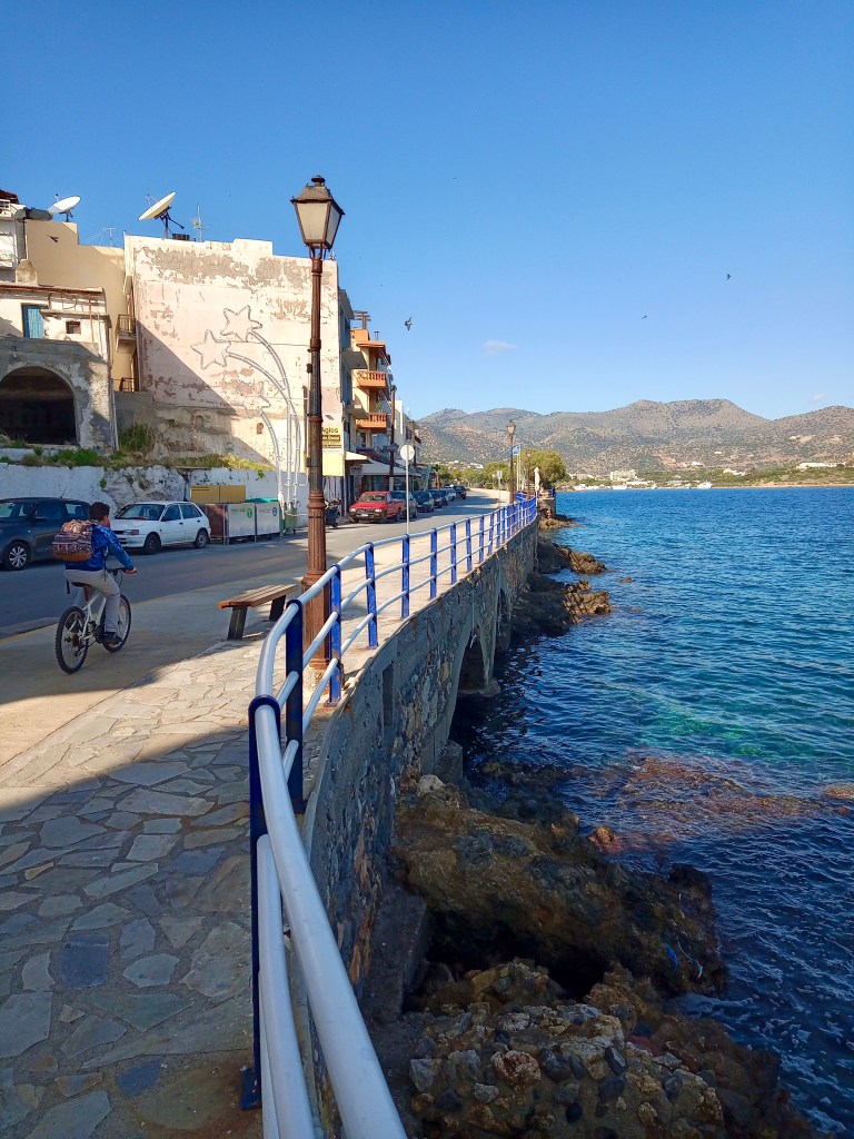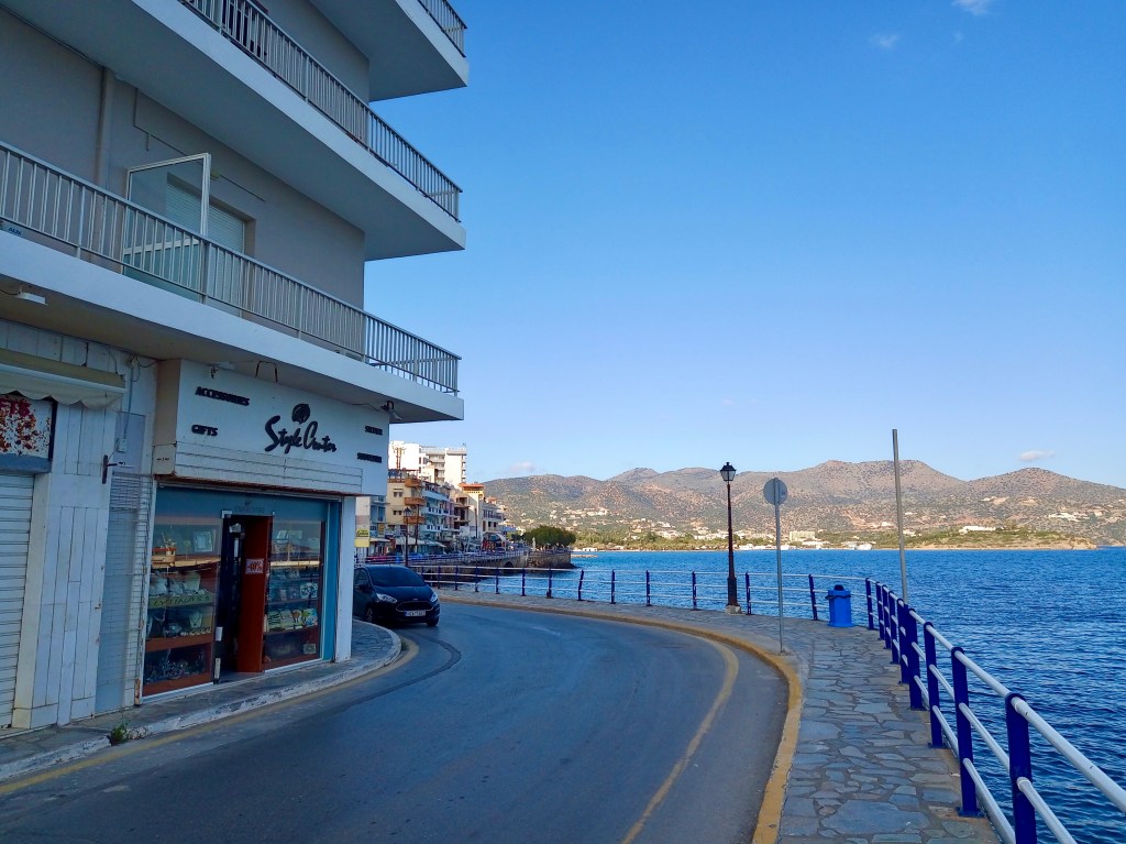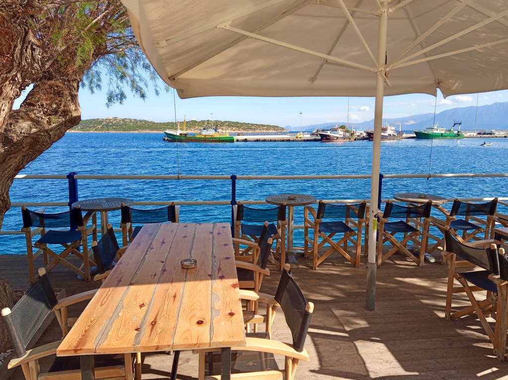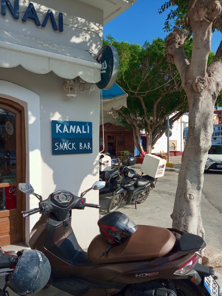 We took coffee (our regular freddo espressos, since it was hot in the December sunshine) at the beautifully located Kosa Café beside Ag. Nik. lake…