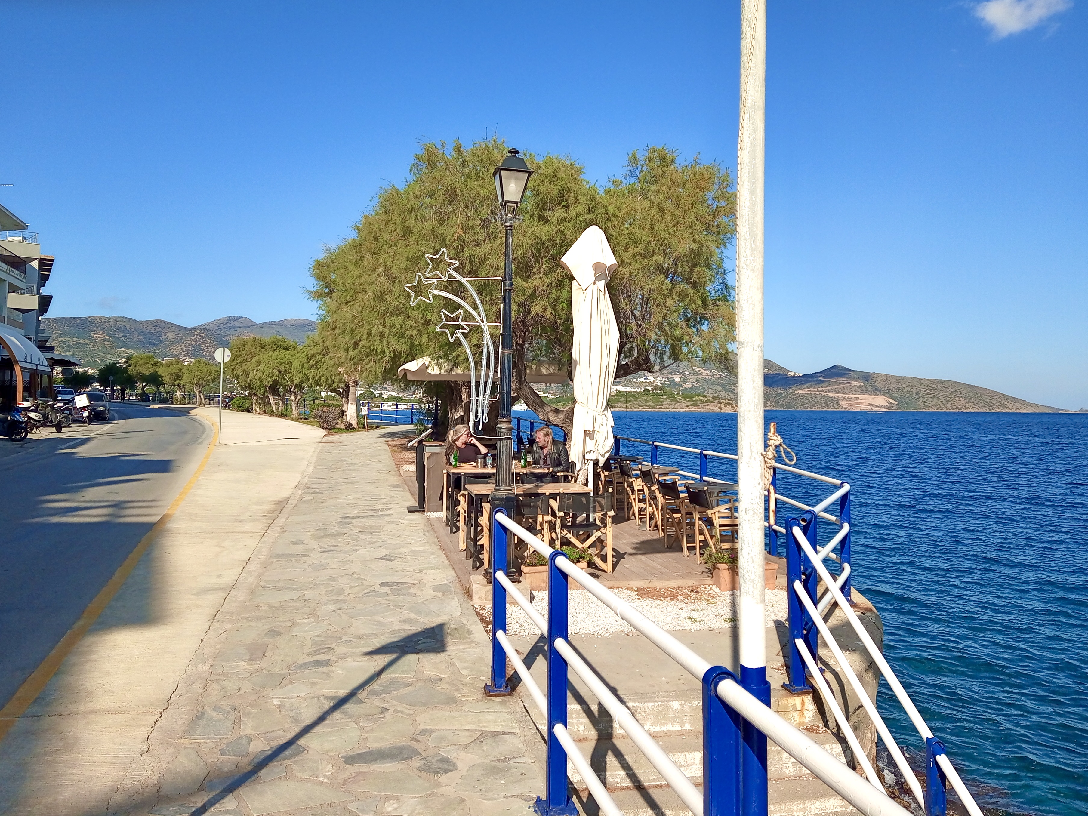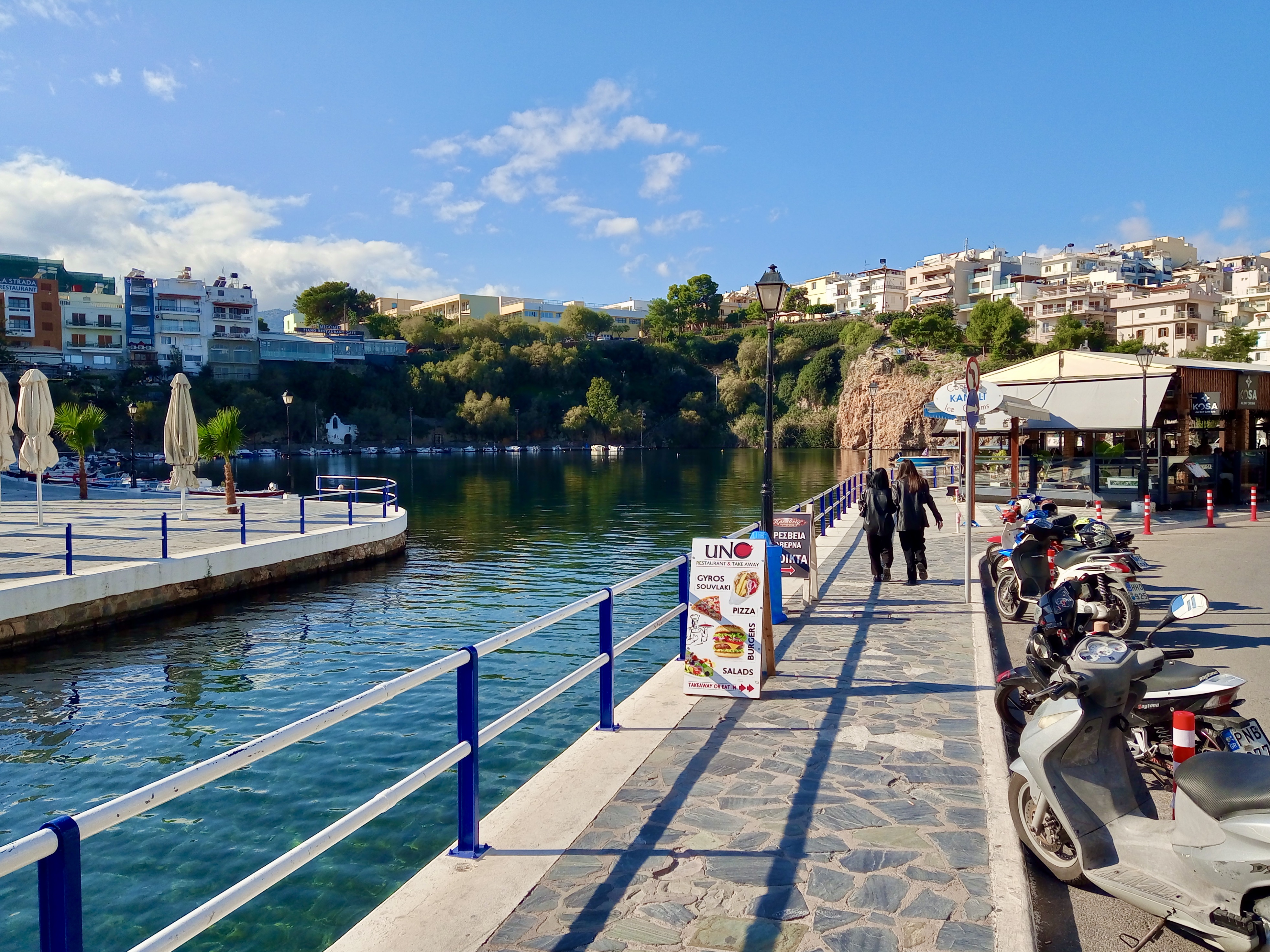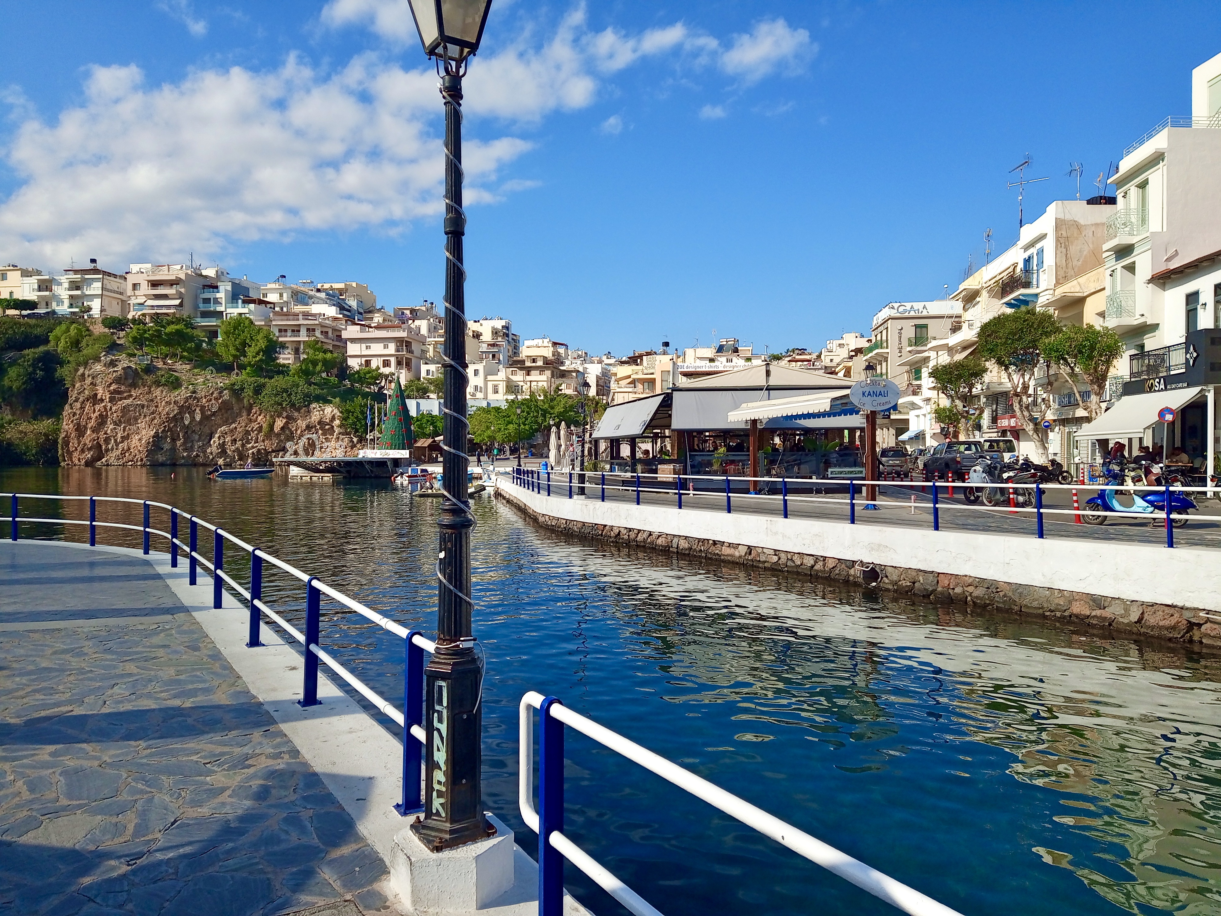 We took coffee (our regular freddo espressos, since it was hot in the December sunshine) at the beautifully located Kosa Café beside Ag. Nik. lake…