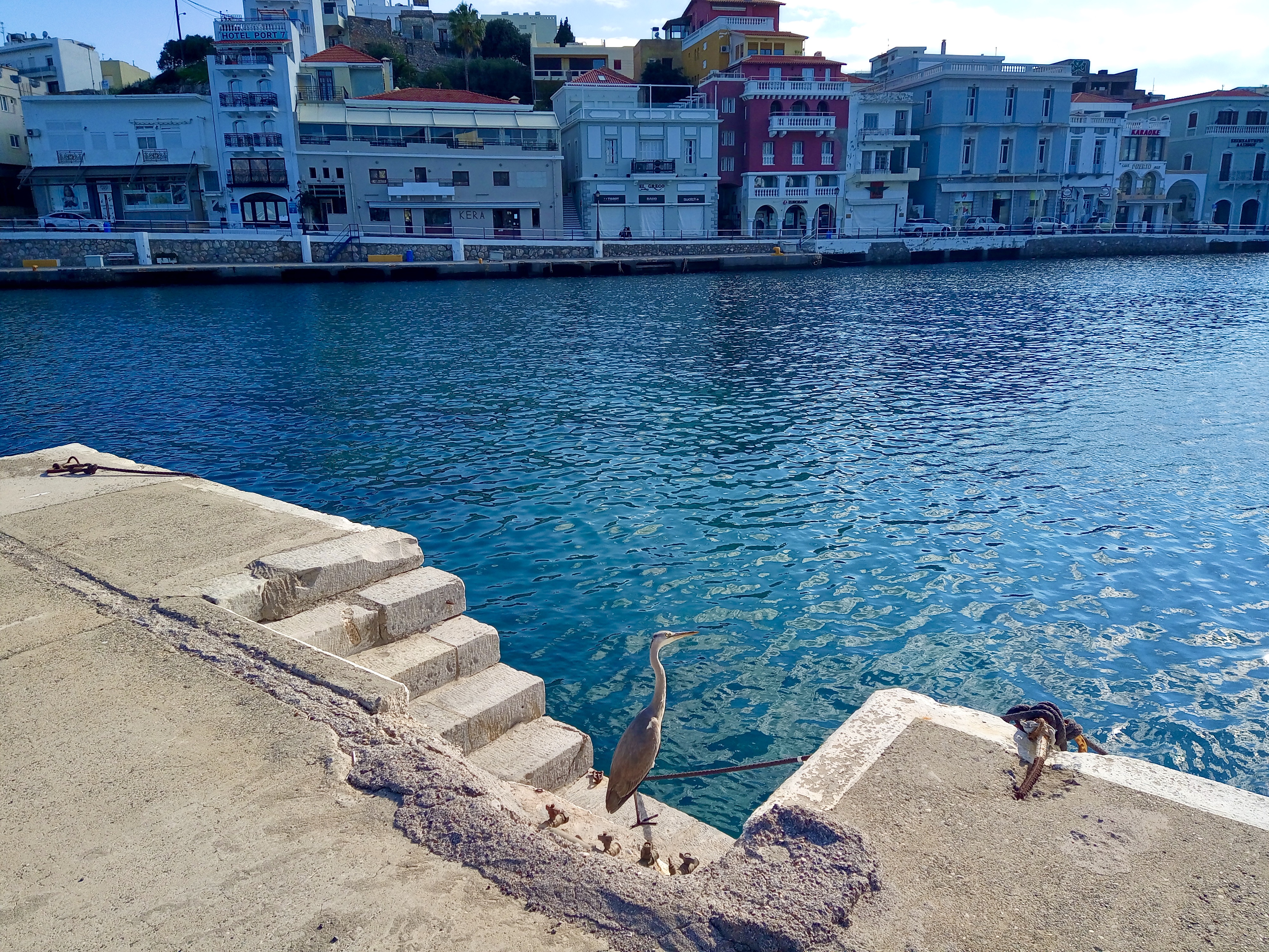 Taking the route over the mountain from here, passing the villages of Meseleri and then Kalo Xorio, we hit the main road at Istros, where we turned left and headed up the by-pass towards our destination, Agios Nikolaos, bent on simply walking the town, enjoying a coffee out and then coming home for lunch after a couple of hours. If you’ve studied the photo at the top of this post, you’ll no doubt have spotted the grey heron flying away from me across the Ag. Nik harbour. That photo was taken at around 12.30pm, and it’s usually about as close as one ever gets to such a gloriously grand bird. Grey herons usually don’t let you get within about fifty metres of them before doing what that one’s doing – fleeing; but hold on, don’t go away, because if you love birds, as we do, though I may say so myself, I have some truly remarkable photos for you just a little further down.