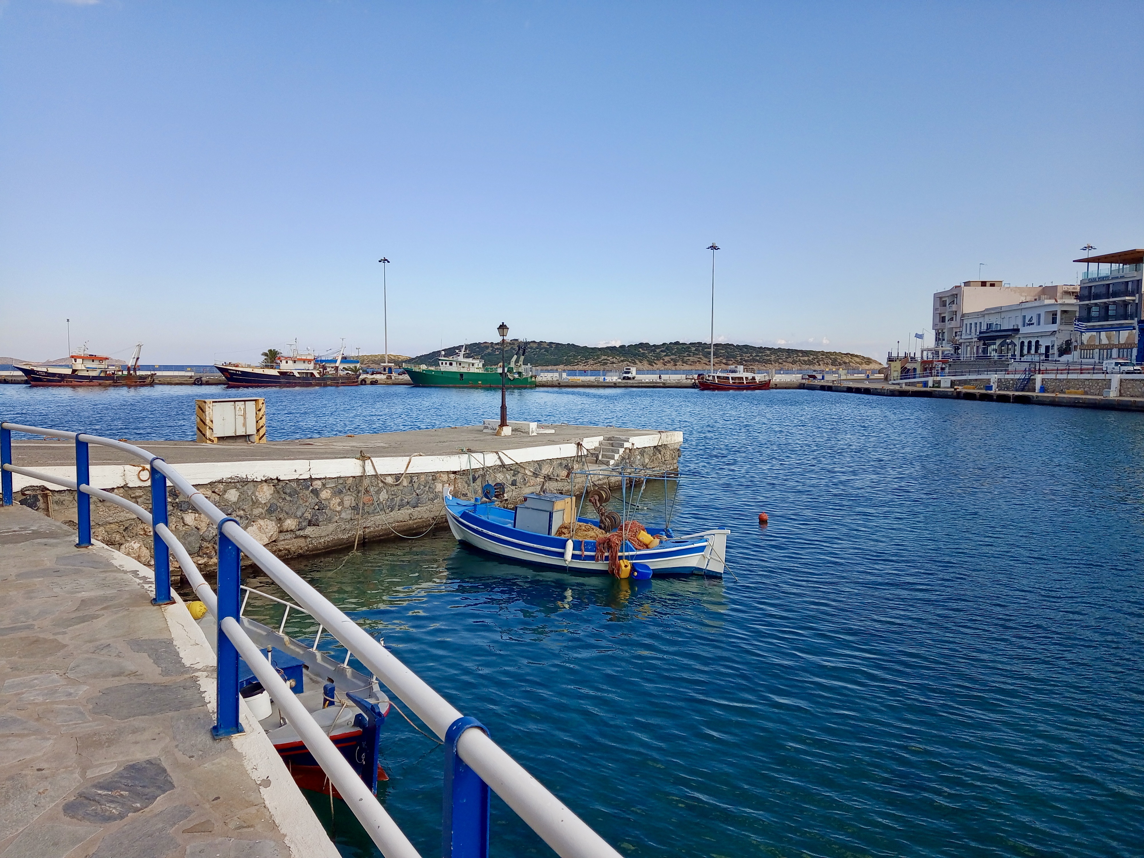 Leaving the Café and crossing the famous bridge that separates the lake from the outer harbour, we headed around to the left to walk along the very pleasant promenade that heads north, skirting the rocks and sea below. But first you pass along the northern side of the harbour, at the far end of which is a concrete jetty that you can walk down to, and where a couple of fishing caiques were tied up. I took the photo below as we approached that jetty…