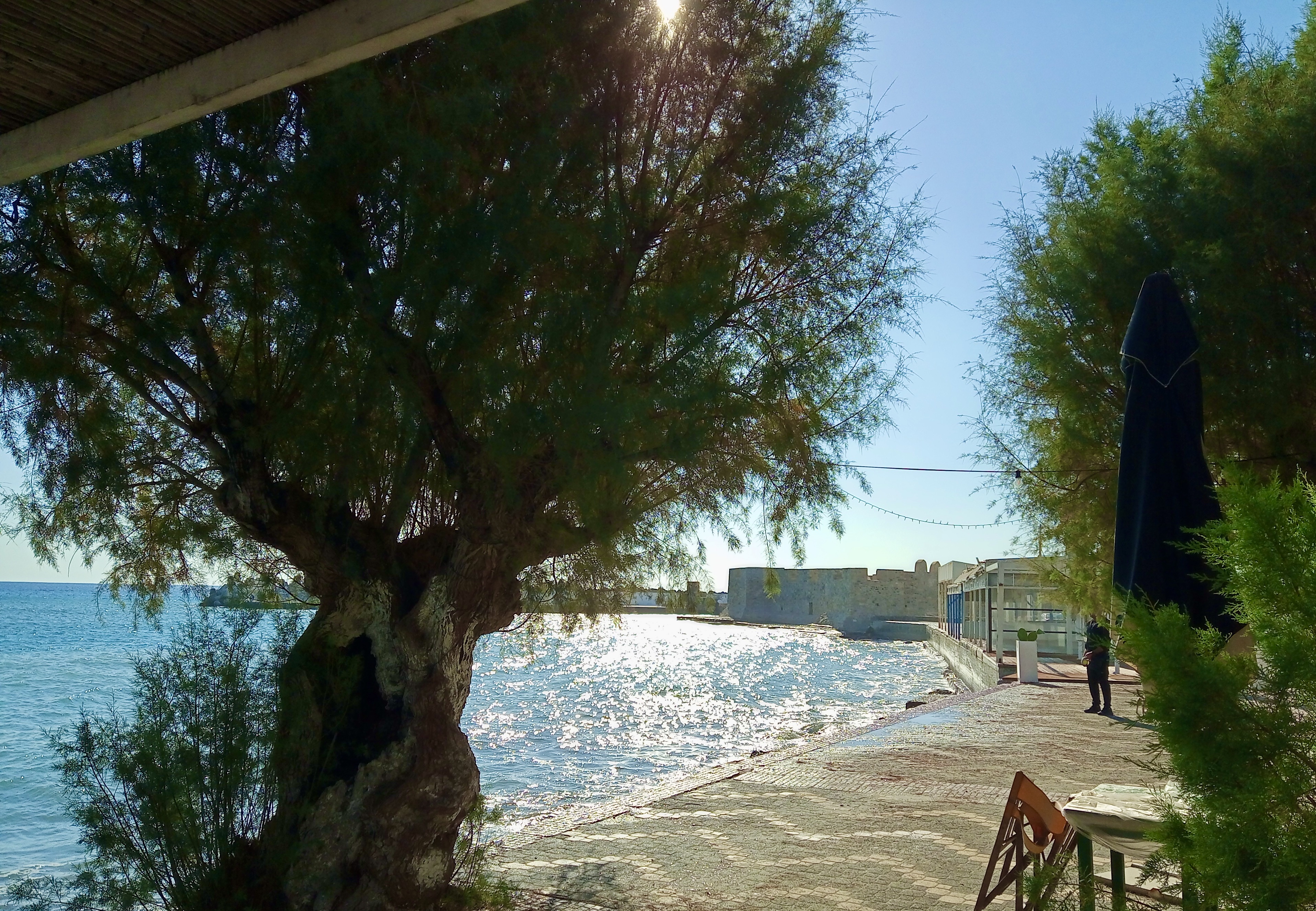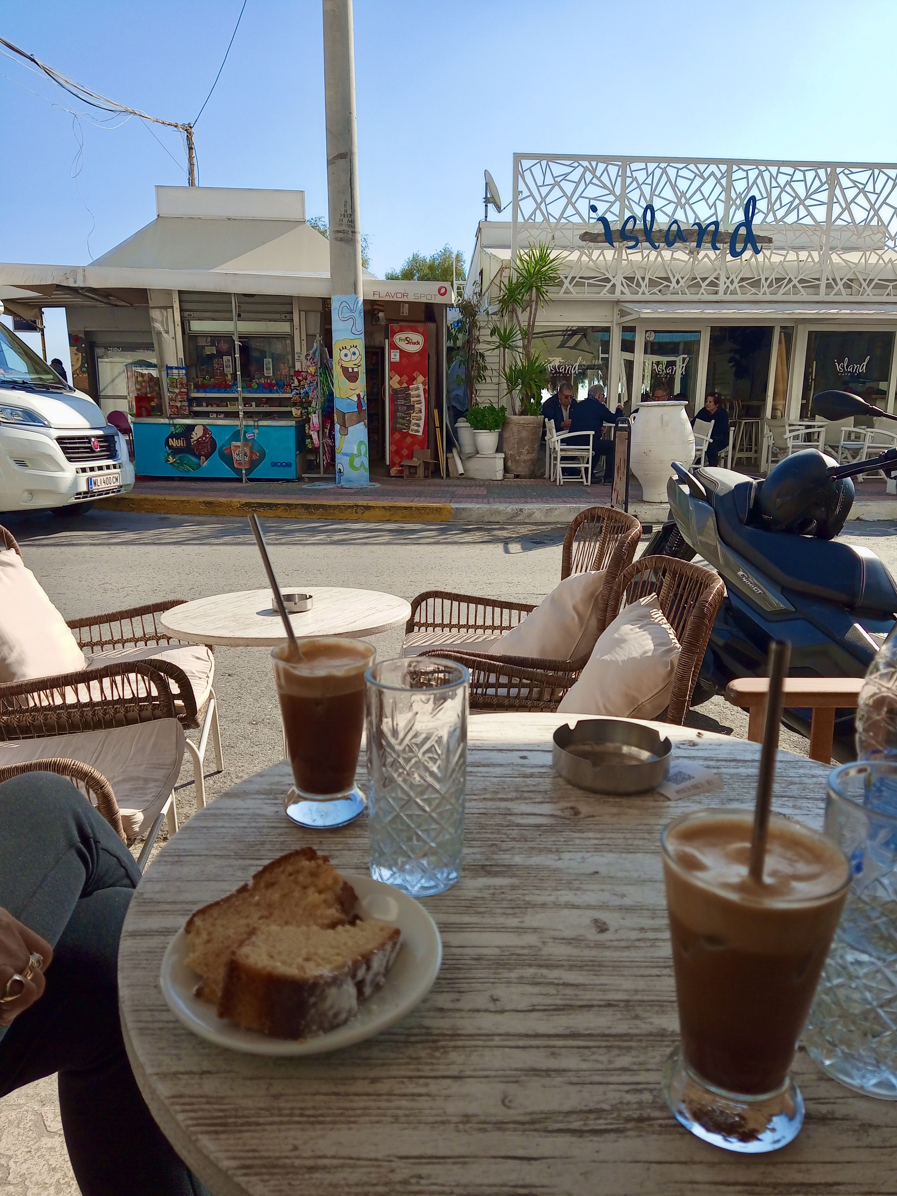 Above: This little bunch were all taken during a lovely stroll along the waterfront, including the taking of coffee (of course) at the Island café/bar, where the guy also gave us that cake as a freebie. It was deliciously moist and not at all too sweet. We very often take our coffee on the Island’s sunbeds (on the beach, the other side of that building across the road) during the summer season, but this time we sat just outside the main building, against the wall, in order to do some serious people-watching. If you study the photo in which Yvonne’s left arm features heavily, you can just make out the old green moped that now serves as a handy plant-stand. The orange directional indicator on the handlebars is easy to spot. Like I’ve so often said, the Greeks were into recycling (or should that be re-motorcycling?) long before we caught on.