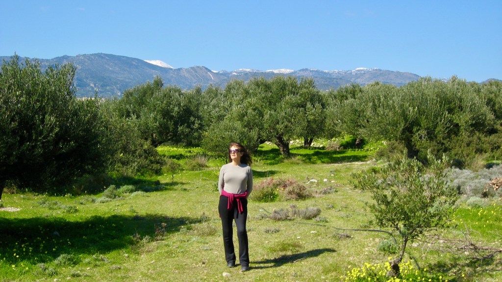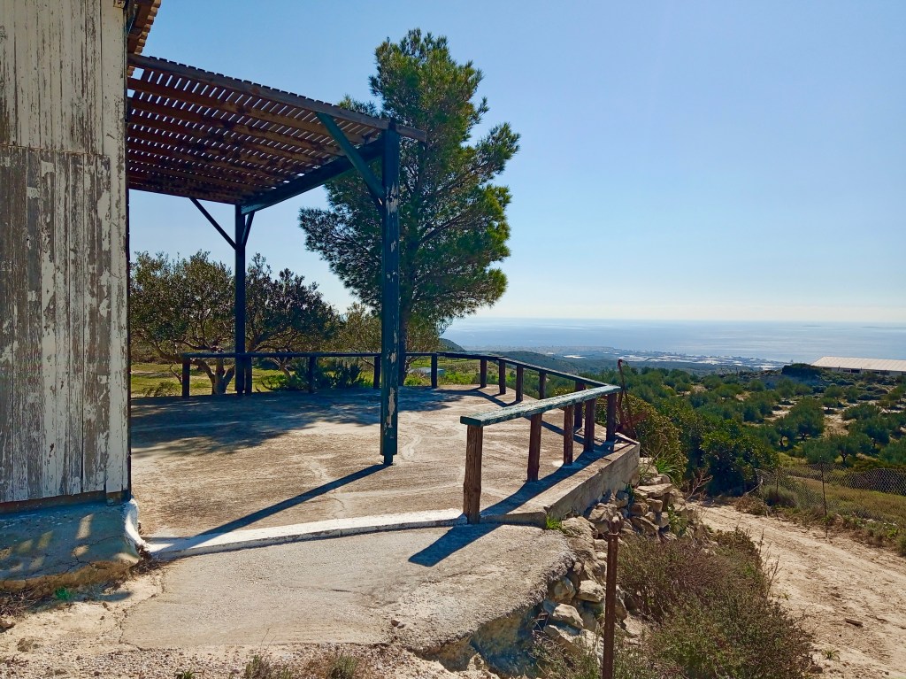 On Friday we went for a long walk up the right hand of the two mountains that face us across the valley, as seen from our veranda. Both are clad in olive groves and both partially obscure our view of the sea about seven kilometres below us to the south. We’ve reached the top of the mountain on the left on several occasions and yet, so far, we’d not made it to the top of the other one. This time we were going to try, armed with a screenshot stored in my phone from Google Earth showing the most likely lanes and pathways we could take in order to succeed.