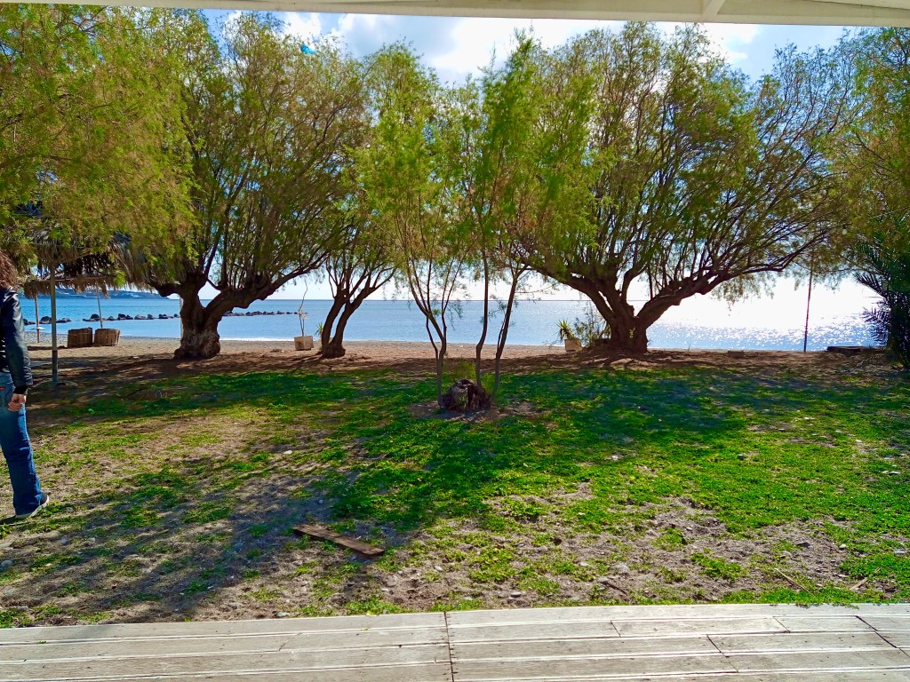 Above: Behind the town beach, 16th February at 11.00am. Yvonne was going to check out the sea to decide whether to take a dip or not. On this occasion she decided against it. The idea of sitting out front of The Island Café, in the partial shade against the wall of the building, and sipping a coffee whilst watching the world go by was just a tad more appealing and won the competition hands down.