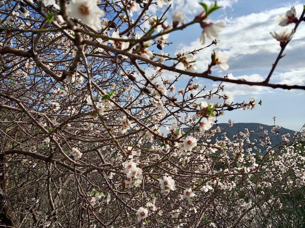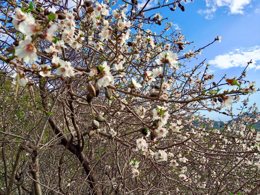 The photo at the top of this post was taken during that walk. We came across an almond tree that’s already in full flower, and as well as the flowers it still had a lot of last year’s crop of almonds attached to the branches…