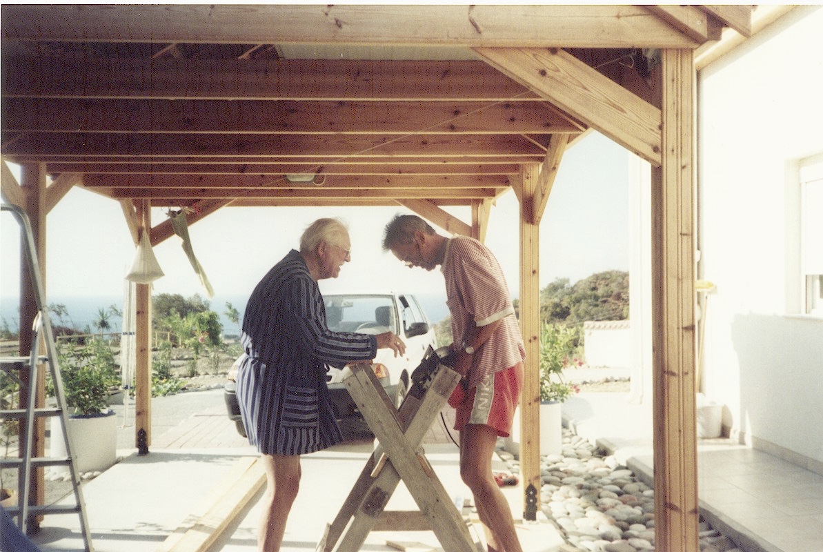 Finally, below is another nostalgia pic. My dear dad has been gone for 14 years now, I can hardly believe it. But when he and my mum came over to stay with us on Rhodes, Dad soon made himself useful and helped me build a gate for a fence I was constructing to section the orchard off from our garden. The fence and gate were made entirely of reprocessed wooden pallets, and dad, ever the resourceful one when it came to using his hands, built me a 90º square out of three pieces of wood. I wouldn’t have had the faintest idea how to do that, but he did, and it served its purpose well while we built that gate. The photo was taken while dad was wearing his ancient (and much too short) dressing gown. He came outside to see what I was up to and soon got involved, without bothering to go back inside to get dressed properly. Yvonne took the photo as she loved to see father and son working together as a team…