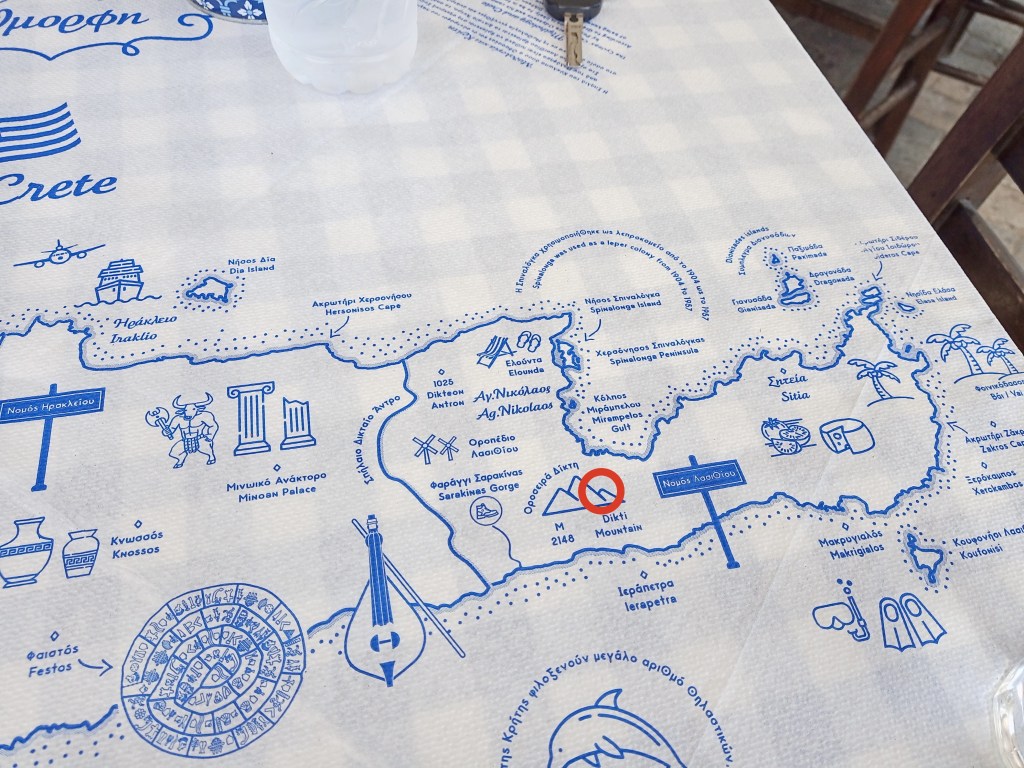 While I’m on the subject of appreciation for what we have in life, the paper tablecloths in the Konaki show a simplified map of the island, and so I snapped a photo before the food arrived. I’ve since added a small red circle (Photoshop, I freely admit. Well, actually, since I gave up work, I’ve switched from the extremely expensive Photoshop to a brilliant alternative called Pixelmator Pro, which I can thoroughly recommend) and it shows where we are very privileged to be living this past three and half years and counting…