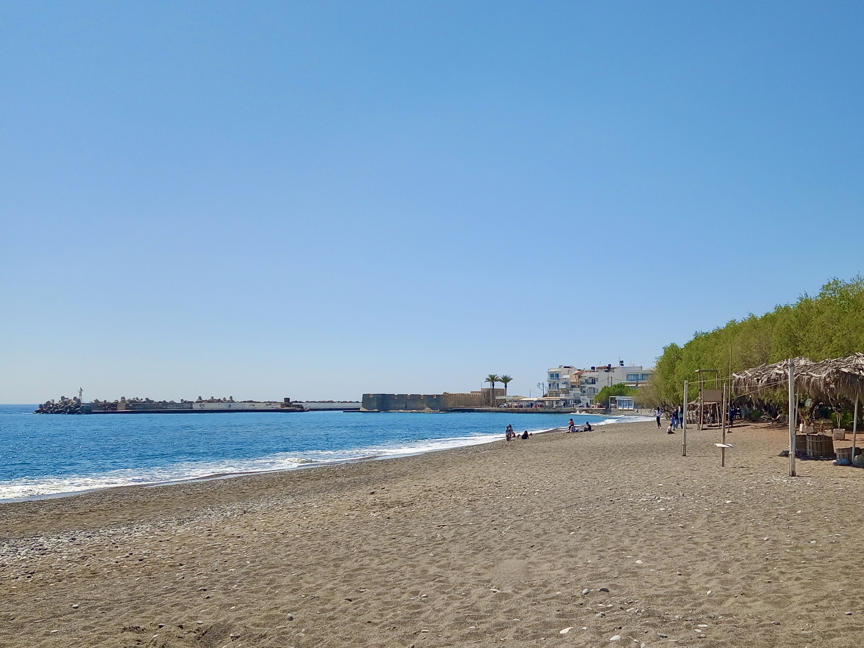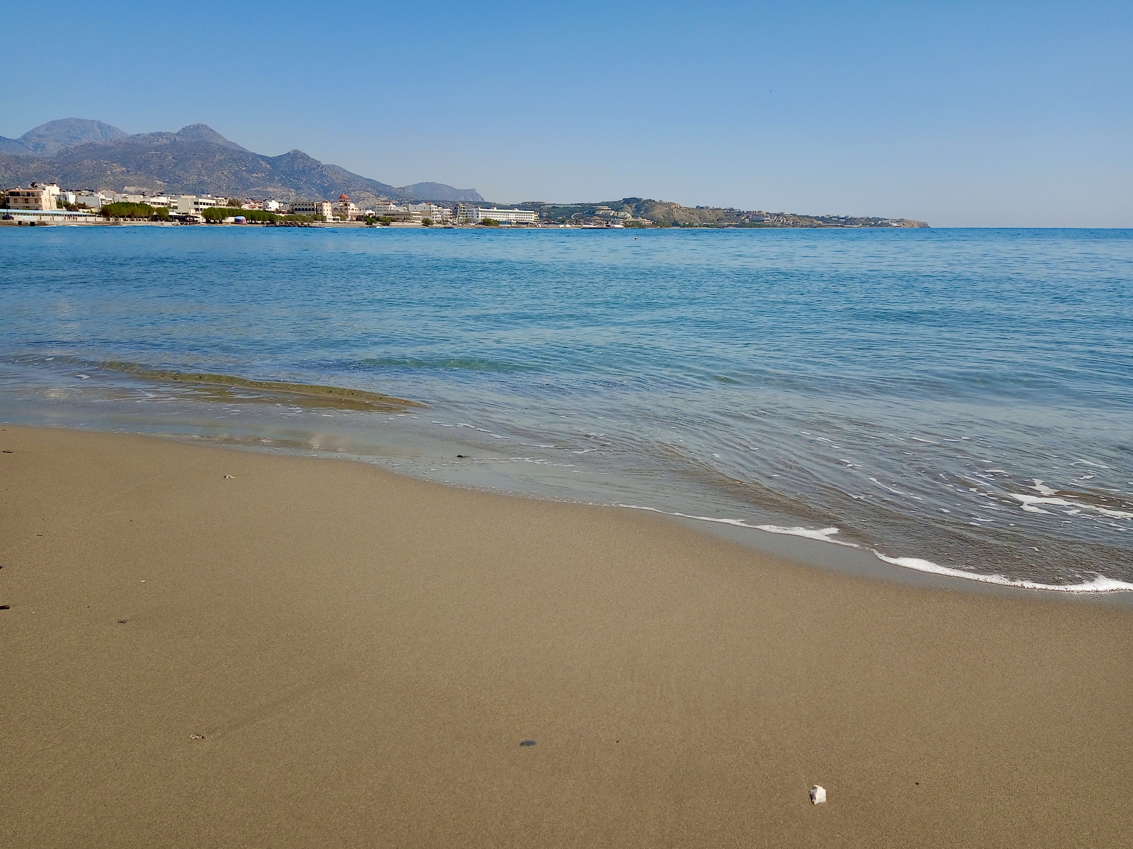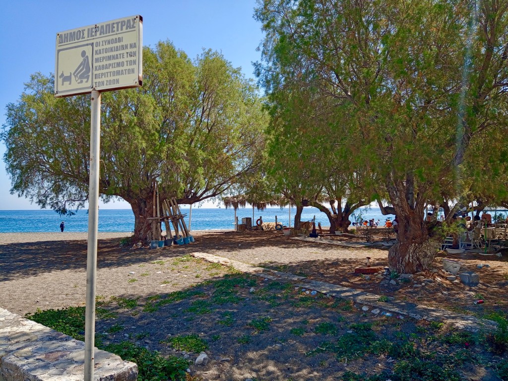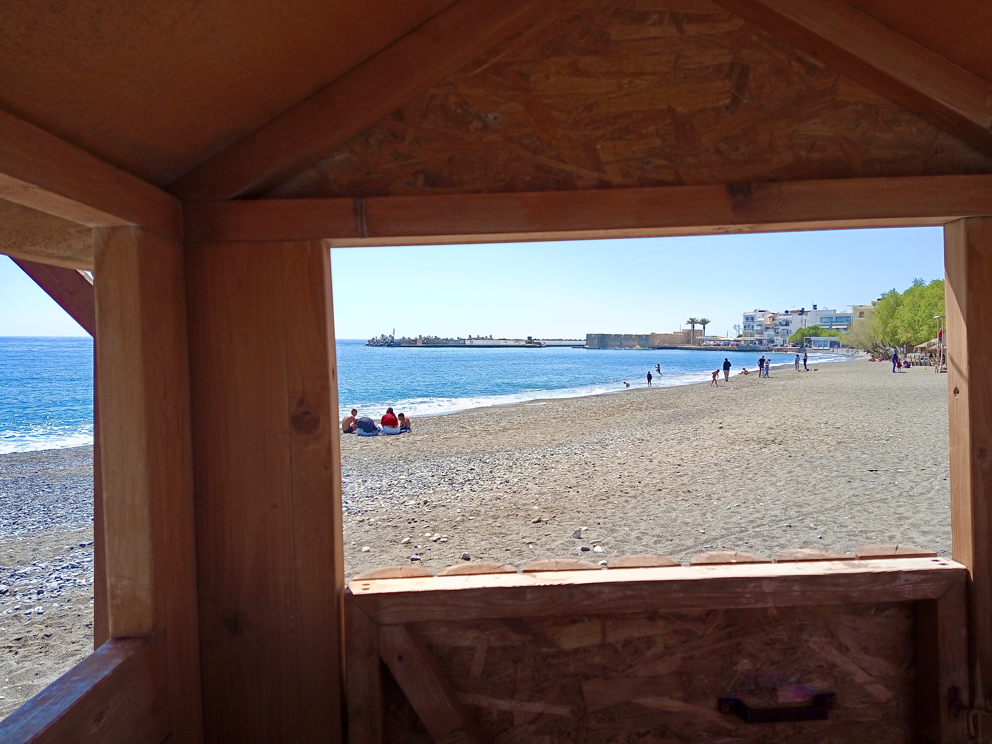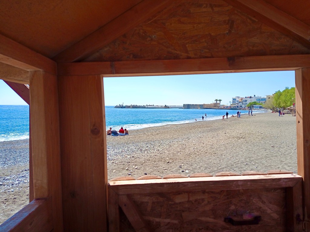As you can see from the above photo, more by luck than judgement we’ve ended up living in the narrowest part of the entire island of Crete, which we’ve come to appreciate all the more as the time’s passed since we found our cozy little house. That red circle is about where we live. Setting out in either direction from home, we can be on a beach, or at least at the coast, within ten minutes, north or south. It’s such a bonus, because if the wind’s strong from the north (the prevailing direction), we can head south, and if it’s in the south (much less often) we can head north, if we’re looking to have a swim in flat-calm waters or drink a coffee or eat out without everything being blown off the table. We never planned it that way, but it’s yet another aspect of living here that we’re grateful for.