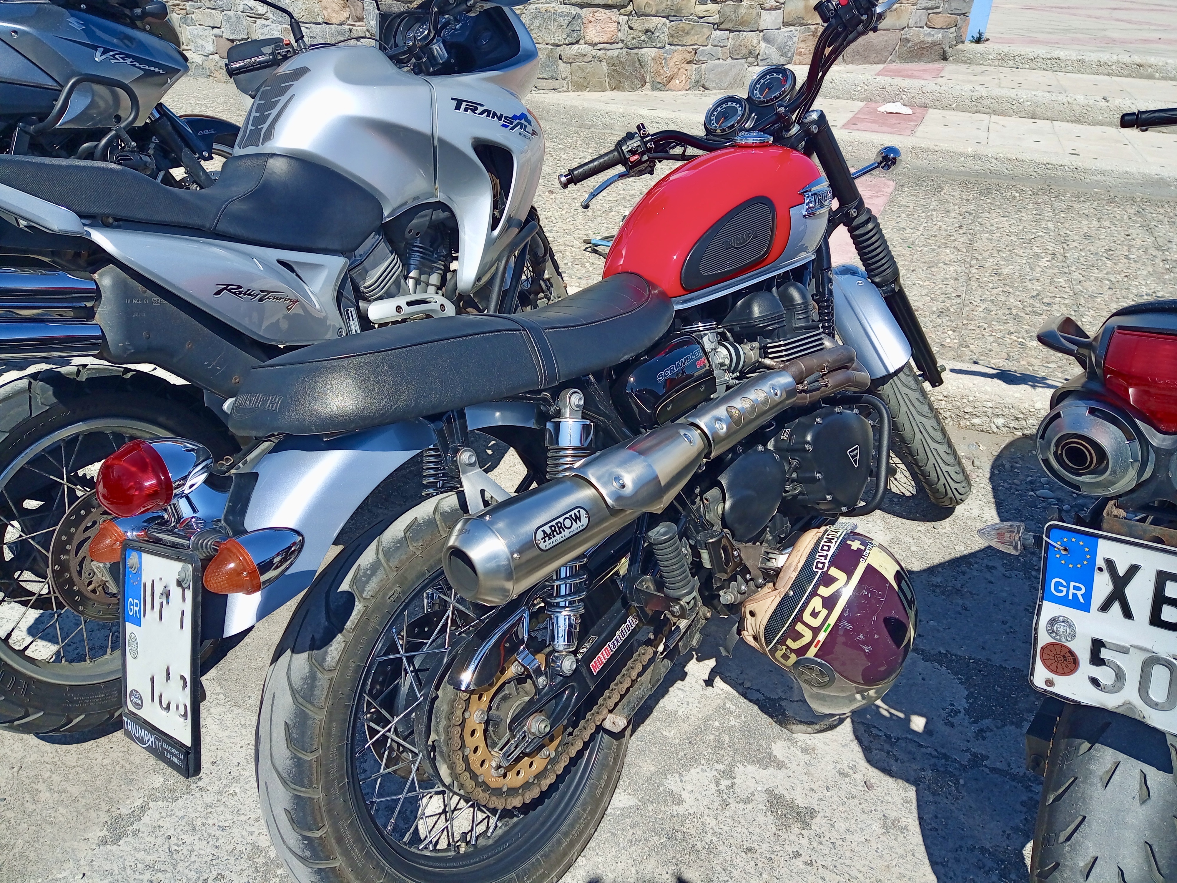 Many moons ago, back in the UK, I was a fairly keen motorcyclist. I don’t have the kind of cash these days that I’d need to buy the kind of bike I’d like, so we stick with four wheels, but on Sundays the Greek motorbikers usually get out on the road and go for a jolly, and the weather today was perfect for that purpose. Back on Rhodes they used to do a complete island tour quite often, and even from a kilometer up the track where we used to live, you could, if you were out in the garden, hear some of them thundering past on the road through Kiotari, sometimes going a tad too fast, if I’m going to express my view. Anyway, as I was waiting for my very courageous wife to get changed after her swim, a few Greek bikers arrived beside where I was standing and parked up, in order to go off for something to eat. My attention was immediately drawn to a very classic-looking machine that soon had me salivating. Among the huge Japanese bikes (nice, but two-a-penny), there was one bloke who evidently had some excellent taste and discernment. He parked up his Triumph 900, which I took to be a Bonneville, and on close inspection saw that it was decalled with the name “Scrambler,” which I believe is a variant in the Bonneville range. Anyway, it was quite evidently tenderly cared for and immaculately clean and sported some very impressive ventilated disk brakes front and rear. So, just for those very few who read this who might just appreciate it…