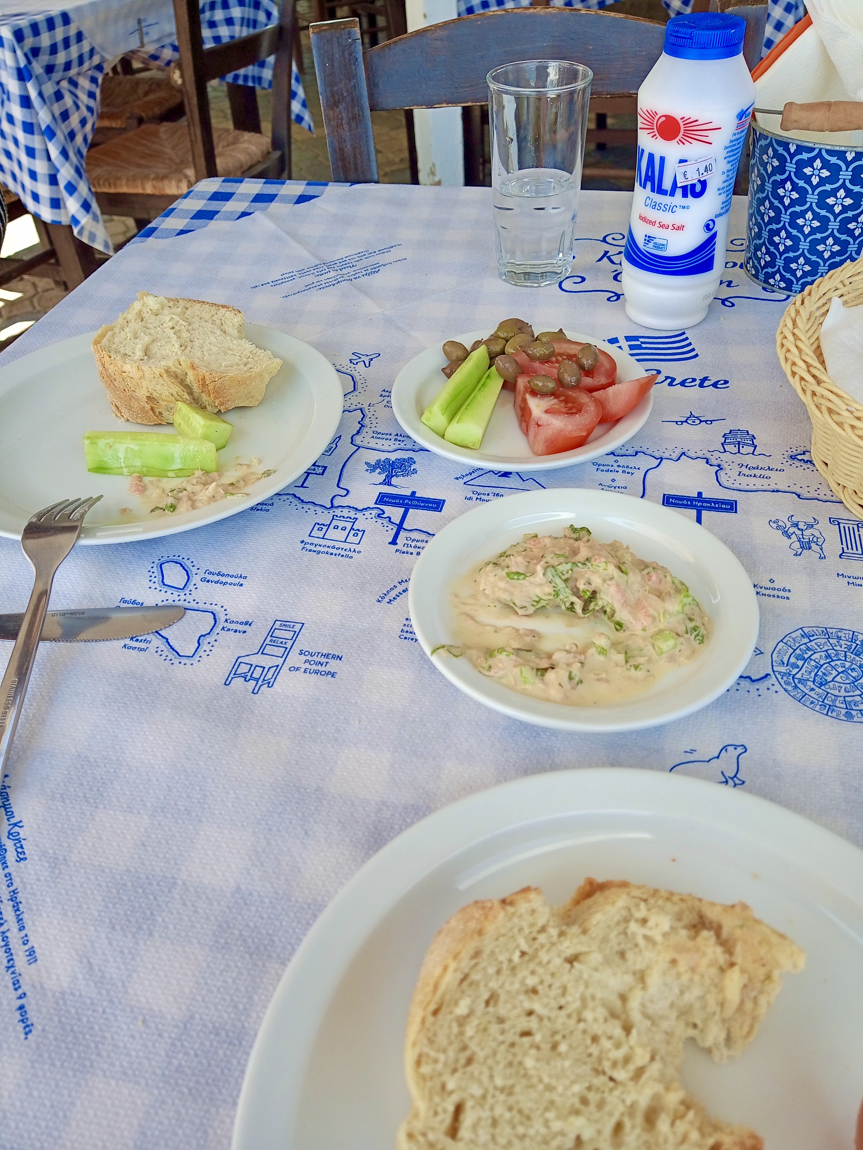 With no hesitation whatsoever, Giannis got his pen and pad ready, grinned and said, “Green salad, gigantes, kolokithokeftedes, and a bottle of Retsina.” Exhibiting a satisfied grin, we affirmed that he was correct and he was soon coming back with a small dish of chopped tomatoes and cucumber, some tiny green olives and a delicious tuna salad dip. One of his nephews (who often wait at table when they’re busy) came along too with a basket of the softest, freshest bread we’ve ever eaten in a restaurant on a Sunday (taverna bread is notoriously often slightly stale on Sundays, as the bakeries aren’t baking), plus a bottle of water and two long glasses. We were all set up for what to us is the perfect light lunch, just a few metres from the gently lapping Mediterranean Sea, and the tantalising prospect of many months to come during which we’ll be doing likewise as often as we can. Small wonder I called this post ‘Appreciation.’