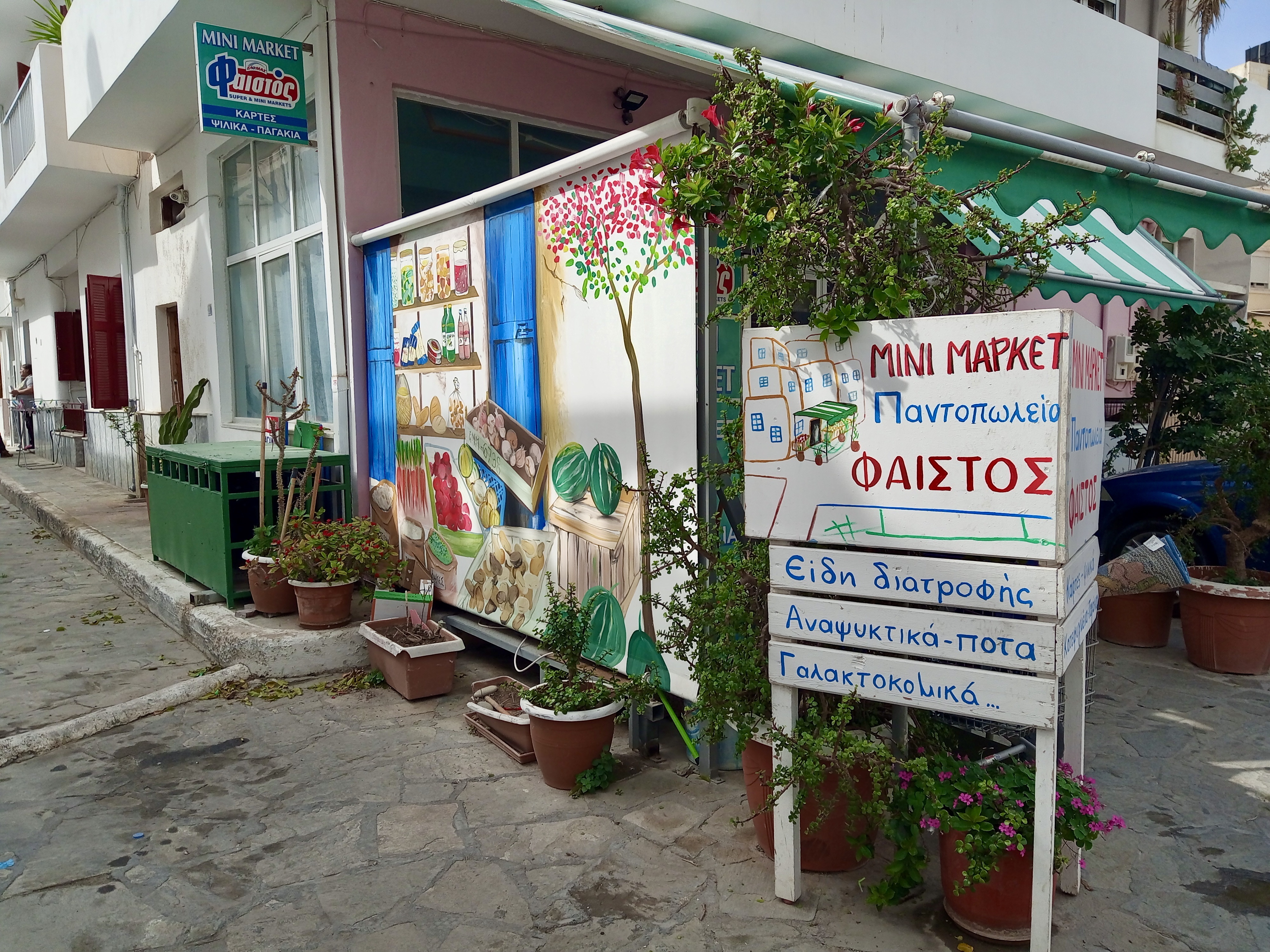 Last but not least, here’s a tiny ‘supermarket’ in a backstreet in the old town of Ierapetra taken Sunday April 2nd at around 11.00am. We liked the way the owner’s painted a lovely ‘general store’ scene on the canvas roller blind on the side…