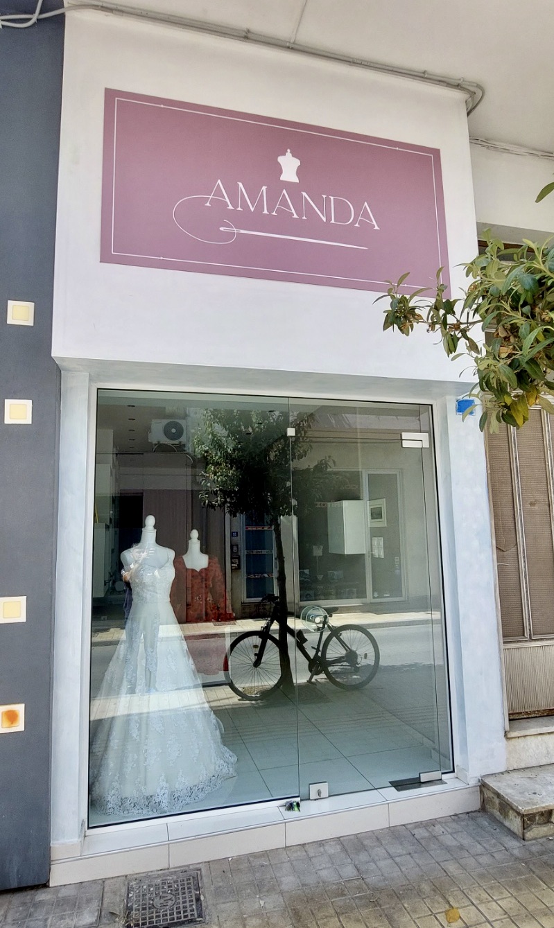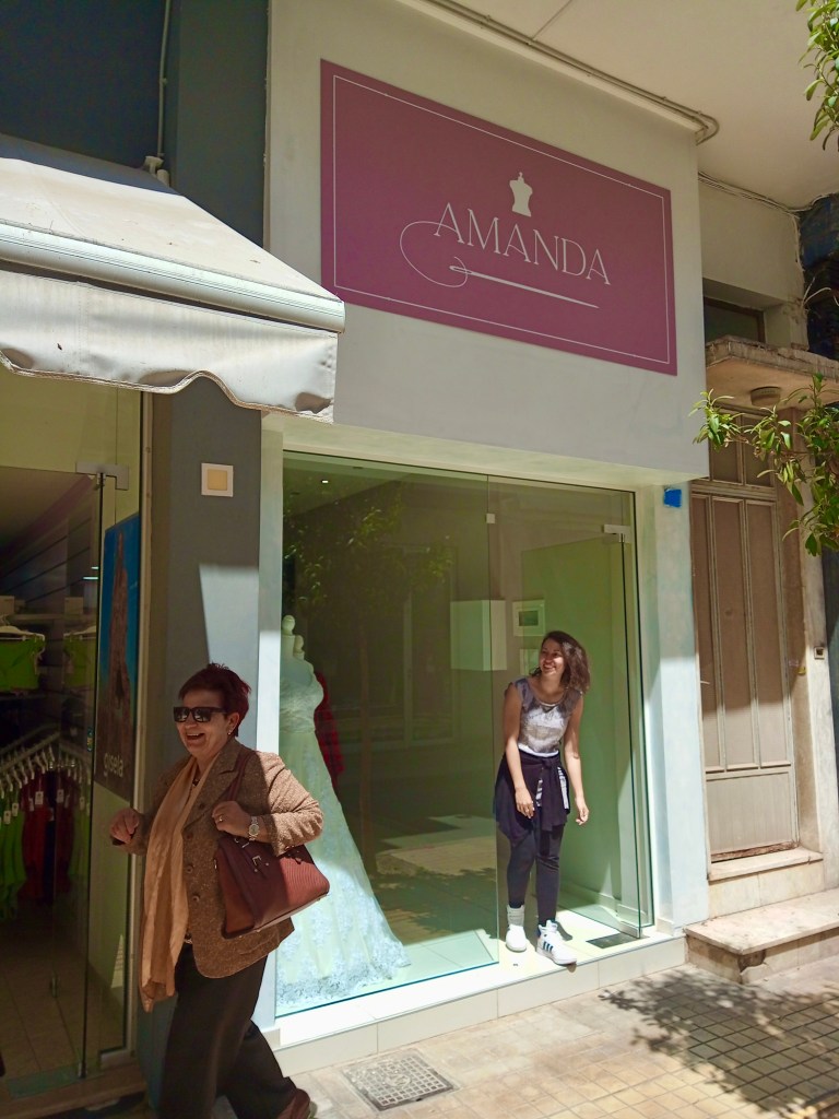 Above:In need of some modernisation‘ would be an estate agent’s description of this house. It’s one of the diminishing number of truly characterful old houses in the Old Town area. Lastly, the photo below is of our young friend Eirini (Amanda), who’s a very talented seamstress and dressmaker. She’s just opened her new shop in the town, offering an alteration and dressmaking service. She can take things in, take things out, and make an entire wedding dress or morning suit from scratch. We wish her the very best of success and I was touched when she and her dad asked me (as a retired graphic designer) for my input in designing the logo. Another friend had come up with the chosen typeface, and I did the rest. The needle below, along with the simplified mannequin above, hopefully conveys to the passer-by what she’s all about. If you live in the area, she’s just along the street from the main Post Office. If you do go there, tell her John sent you!