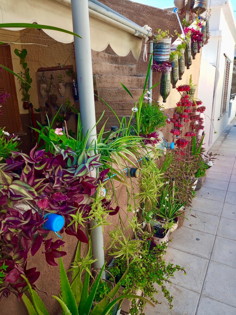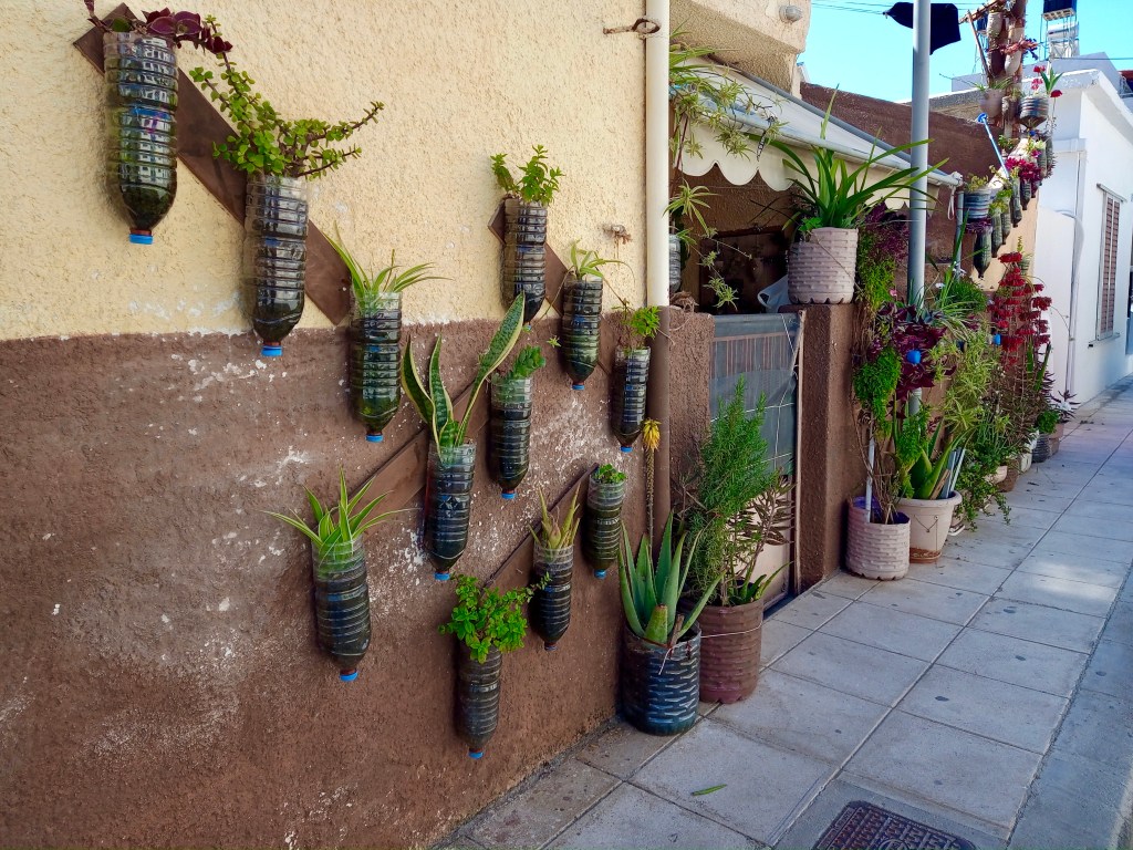 Finally, on an entirely unconnected theme, I mentioned a few posts ago about how the Greeks recycle without even being aware of it. How about this for a wall on the outskirts of town (Ierapetra) that shows how the resident has done wonders with old water bottles to spruce up a drab street…
