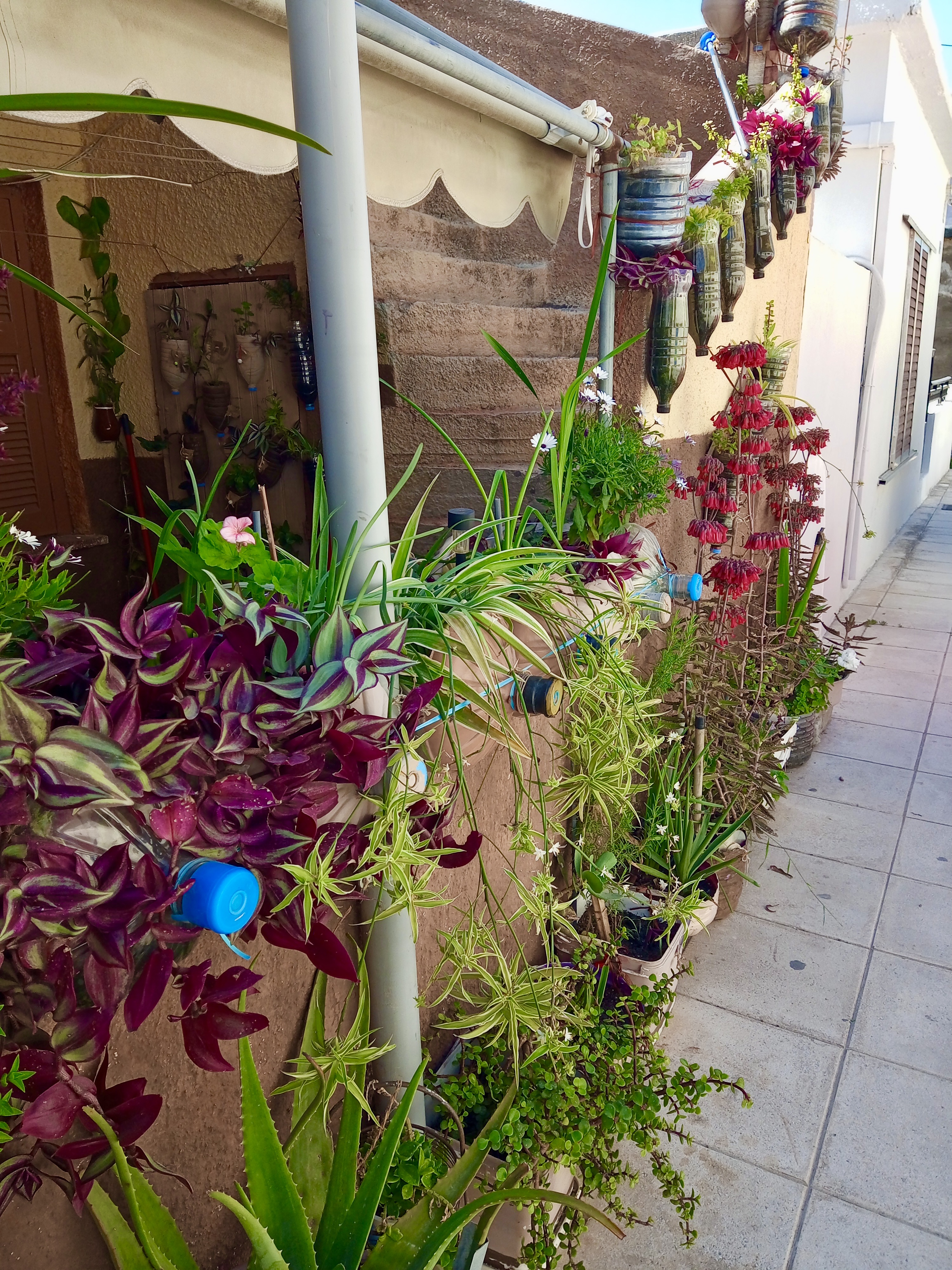Finally, on an entirely unconnected theme, I mentioned a few posts ago about how the Greeks recycle without even being aware of it. How about this for a wall on the outskirts of town (Ierapetra) that shows how the resident has done wonders with old water bottles to spruce up a drab street…