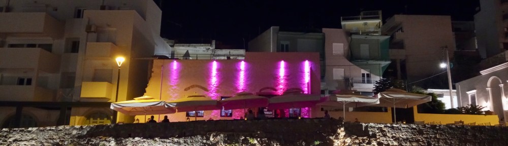 After the usual round of hugs, cheek-kisses and warm pats on the back, accompanied by promises from us to return again as soon as we can, we packed ourselves, our luggage and all the gifts into the car and set off for home. All those kind gifts from old Maria were not only heartwarming, but they also meant that we wouldn’t need to go shopping quite so urgently when we got home. I’ll post a bunch more photos from Sitia, other than those I’ve already posted here on the blog, on my Facebook page after I’ve completed this post, rather than gum up my disk space with WordPress, who are a little careful about how many gb of space we use up with photos on our blog accounts. The photo at the top of this post was taken at 9.06pm in Sitia, the first night that this bar (The Black Hole Music Bar) was open for the season, several weeks later than usual, owing to the weather this year.