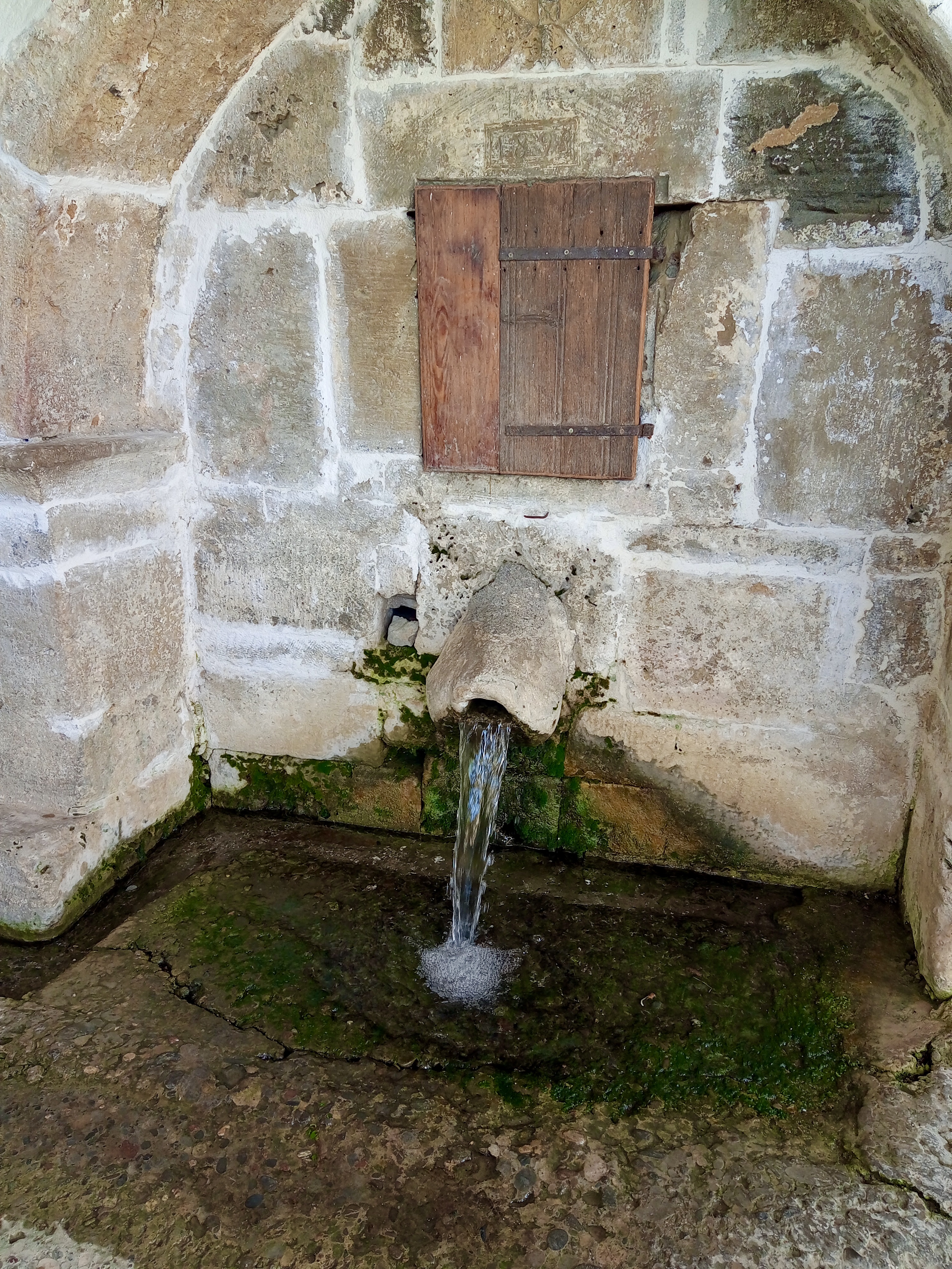 Above: In the village of Prina, next-but-one village up from us, passing Meseleri. This is the well-preserved village communal washing house and water source. You can see from the close-up of the stone lintel above the fountain that it dates from 1893.