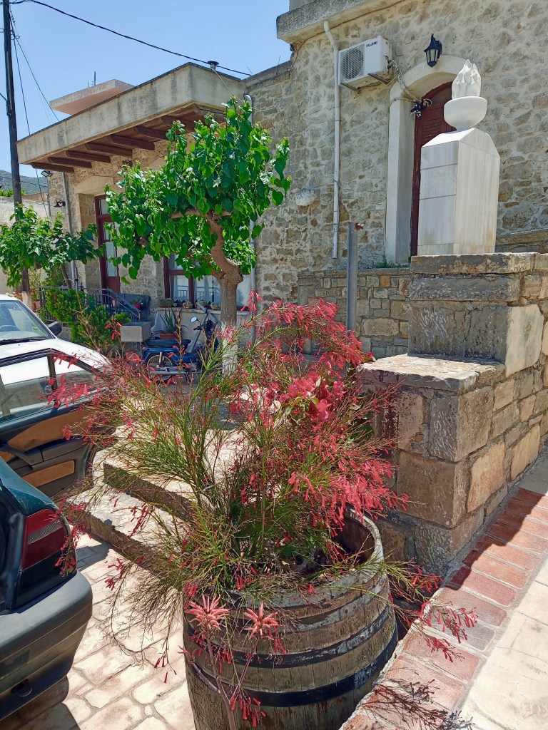Above: This little sign, almost too insignificant to notice as you walk past the doorway, translates as “Christoforos’ kettle [or cauldron].” What does it mean? It means that this is where they make the village ‘raki!’ The link takes you to a Wikipedia page where raki is called ‘tsikoudia‘ (pronounced tsikoudYAH), which is what some Cretans also call Raki (which, incidentally, is properly pronounced with the accent on the last syllable and not on the ‘a.’ It’s the same with the village of Kritsa, which English speakers usually pronounce KRITsa, when it is actually kritSAH. In fact, if you’re serious about pronouncing Greek words correctly, you can always take a safe bet that the syllable you should be stressing isn’t the one you want to stress!).