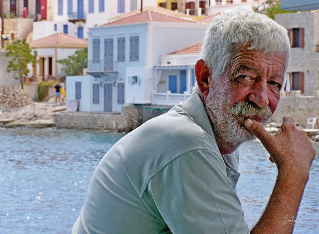 During the almost ten years or so that I did the Halki excursion, Alexandros was a member of the crew on the Nissos Halki, and he looked as old when I first met him as he does now. Many Greek men who work out in the sun for decades, seem to acquire that leathery-look to their skin when still quite young. I’ve never seen a crew member applying suntan cream, that’s for sure. Alexandros still has a good head of grey hair, whereas some lose theirs early and thus may look older than their years. As we’d sit and chat in subdued tones during the crossing, crewmen like Alex would tell us stories about their years doing the back-and-forth trip, plus they’d regale us with anecdotes about island life, since they all had other work that they’d do in wintertime as well. In the course of one season alone, you very quickly became fast friends with the likes of him. After several years on the job, you were very easy in each other’s company.