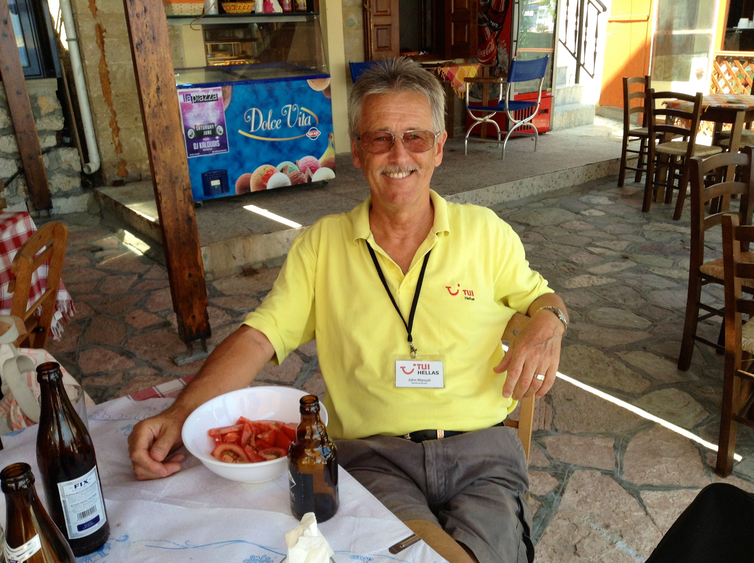 Once we cast off from Kamiros Skala us reps would make a bee-line for the open-air bar on the upper deck and procure ourselves an iced coffee, for which we didn’t ever have to pay, of course. Coffee in hand, we’d make our way back downstairs and either go into the air-conditioned salon, which in good weather was only ever occupied by a few locals, since all the tourists would be as high up on the superstructure as they could get in order to catch a few rays during the crossing, or we’d sit on a couple of plastic patio chairs that the crew kept on the vehicle deck, just near the doorway into the salon. Within ten minutes of having made our departure, we escorts would be nattering about our charges and all the dramas that we’d encountered since we’d last been together. Usually sitting along with us there were a couple of crew members, one of which was always Alexandros, the guy in Betty’s photo (next shot below). He’d be one of those who handled the mooring ropes whenever they tied up, or perhaps he’d operate the electric motor that raised or lowered the side ramp when we were at the quayside, since they hardly ever tied up astern-to-the-quay, but always port-side to it. Occasionally the electric motor would play up, and then a couple of crew would have to raise or lower the very heavy steel-plate ramp by hand pulley. You didn’t want to get in their way when they were doing that.