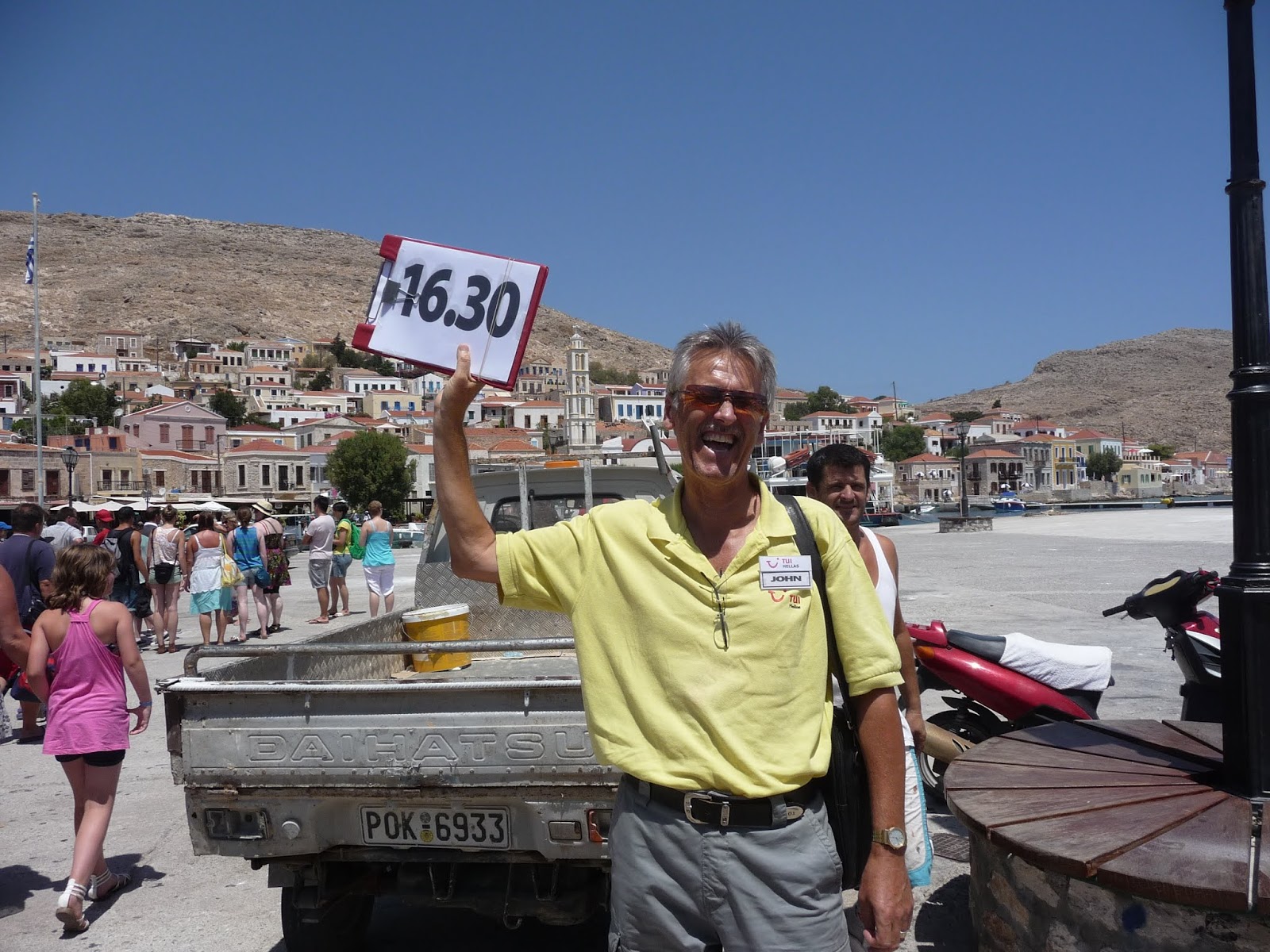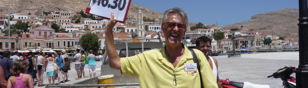 We’d usually do a slight detour to Butterfly Valley before heading down the west coast of Rhodes to the tiny port of Kamiros Skala, quite a few km further south from Ancient Kamiros. Arriving on the quayside, we’d shepherd our guests on board the boats and set out for the crossing of around 75 minutes from there to the picturesque harbour at Halki. While working for TUI, I had to wear a TUI polo shirt, but from the waist down (careful girls) I could wear whatever I wanted, which, inevitably would be a pair of tailored shorts from my own wardrobe. My fellow escorts would do the same (female or male, we all dressed the same) and so, apart from the fact we wore ID badges too, the guests could easily spot us on the quayside, especially for the return trip, when there’d be an almighty scrum to get back aboard before the boat cast off for the return trip, usually around 4.00pm, sometimes 4.15, and sometimes 4.30.