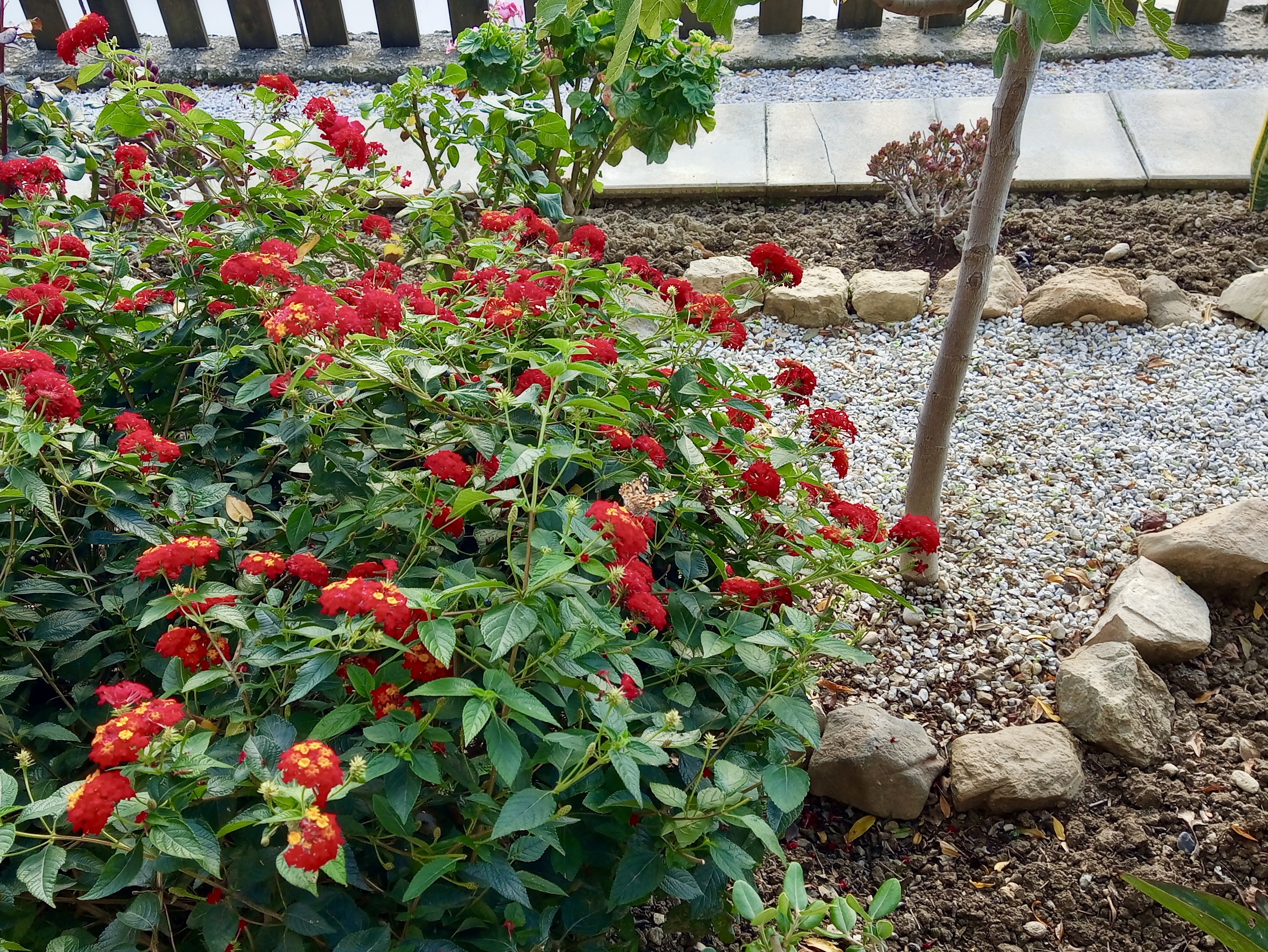 We had a swim just before the rains came, and it may well be the last one for a while, but we’ll see. Had we been in the town yesterday we may well have gone to the beach, as it was a beautifully warm and calm day, but we spent the day at home, pottering, which is something that brings us immense pleasure these days. The largest and most colourful of our lantana plants, as seen in a couple of photos in the previous post too, seems to be a butterfly magnet. This past few days the painted lady butterflies have still been all over it, and I’ve only just discovered, after doing a spot of research, that they actually migrate from Northern Europe to Africa at this time of the year, and make the return journey in springtime. They’re a bit like the poor relation of the magnificent and truly amazing Monarch of Continental America, in fact. How something so petite and delicate as a butterfly can make such an arduous journey is truly one of the marvels of the natural world. We theorised that these in the garden were taking some well-needed sustenance as they sucked the nectar from the bright scarlet flowers, before setting off across the Libyan Sea southwards.