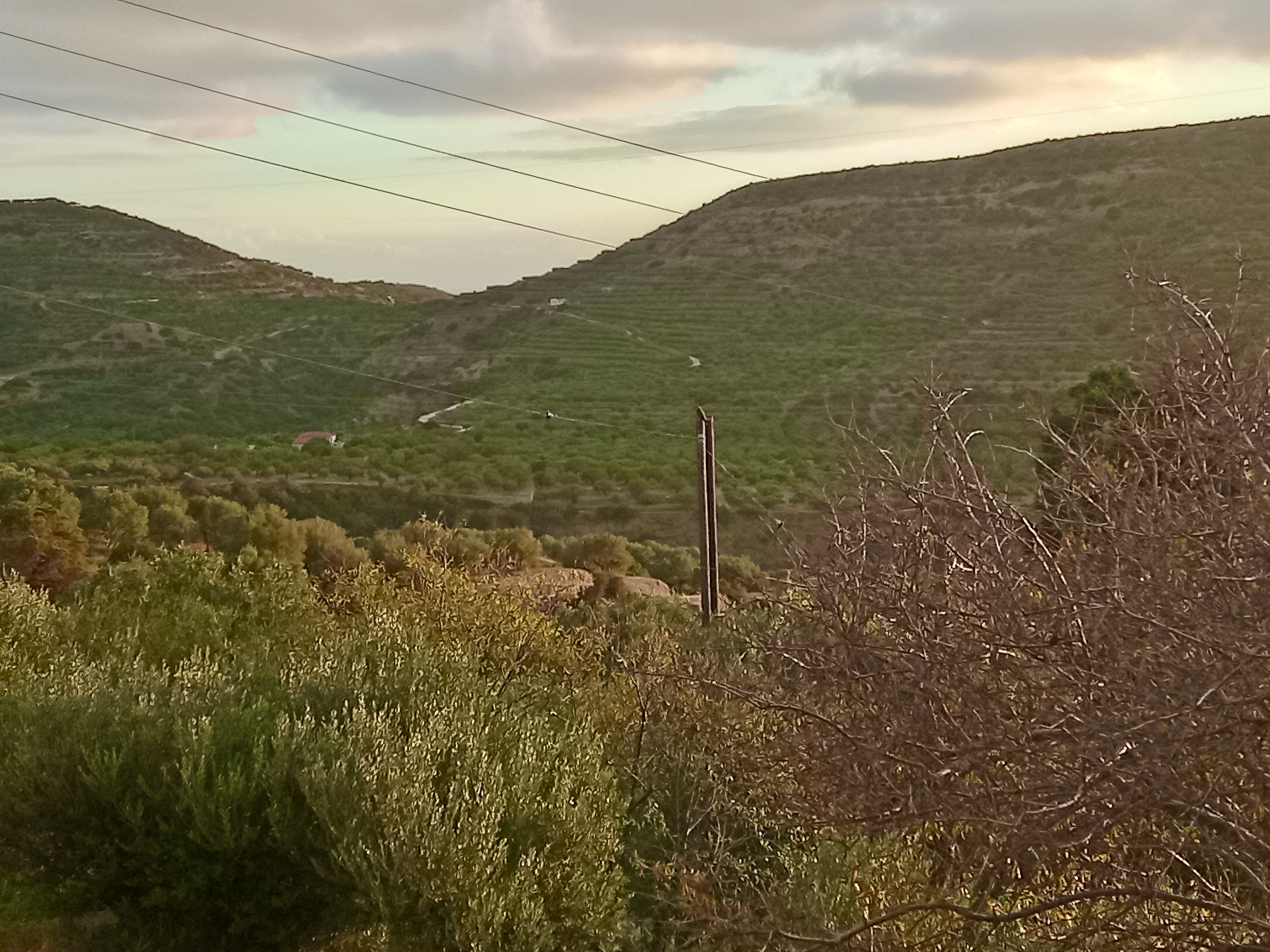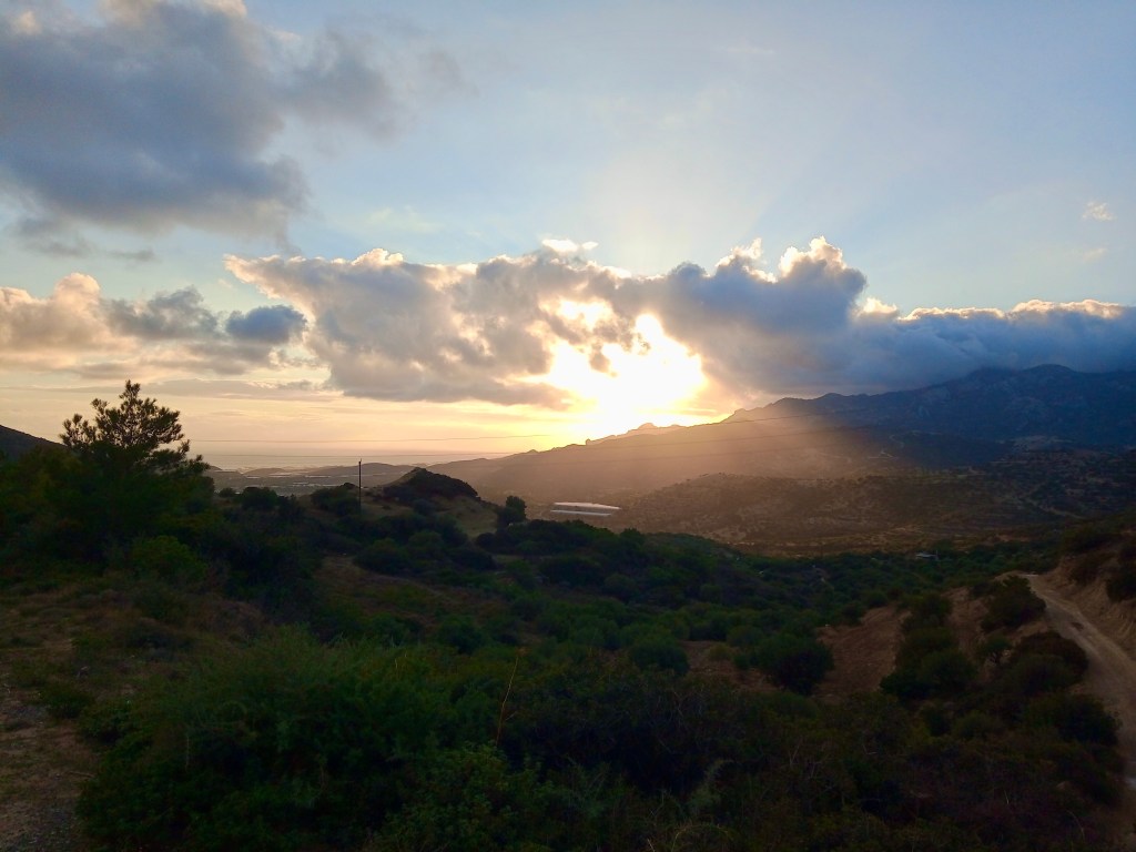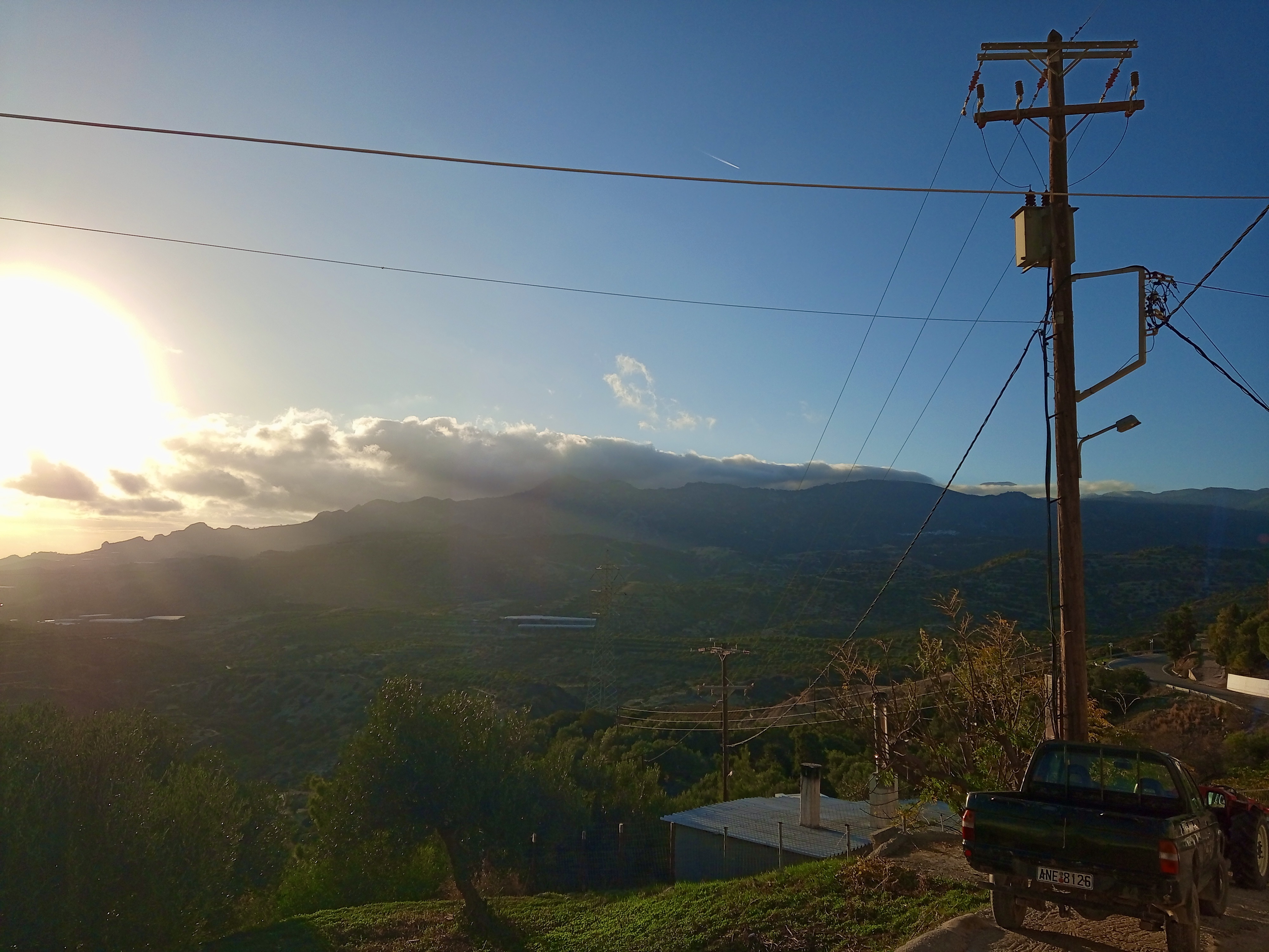 Last evening we went for a 45 minute walk up the lane towards Meseleri just before sunset. Some of the photos below (and the one at the top of this post) were taken during that walk. After a cloudless day we marvelled at the cumulus gathering over the hills bordering the Lasithi Plateau, which are clearly visible twenty kilometres or so across the valley to the west of us. The late afternoon sun’s rays streamed through them to give us a tableau that would have inspired Turner to put paint to canvas, although no artist could do as good a job as the Great One, really.