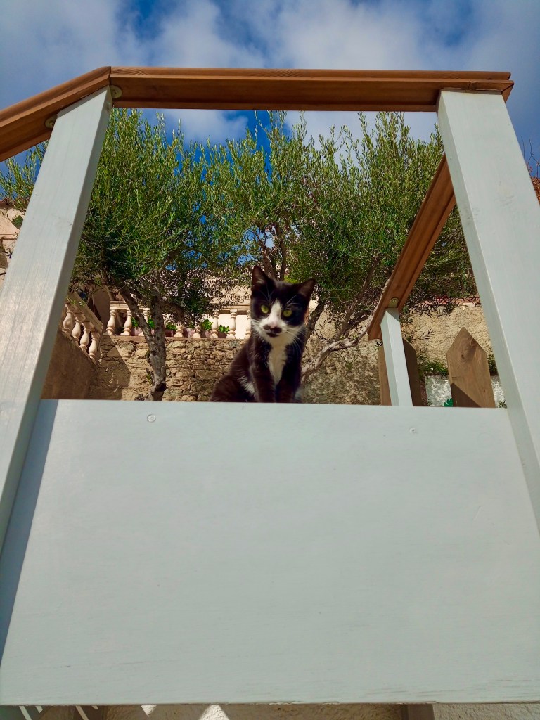 It makes sense to us that those other Mavkos-friendly people must have spent a couple of weeks in their house in the village over the Christmas and New year period, which is why he’s made himself scarce around our house. Maybe they give him things to eat that we’d consider bad for him. After all, cats are like kids, they’ll always eat stuff that’s not particularly good for them if it’s offered, whereas we never give him scraps, always good wholesome nutritious cat food. Anyway, one of these probable ‘sons of Mavkos’ had earned the name ‘Groucho’ from us. Look at the photo and see if you can see why…