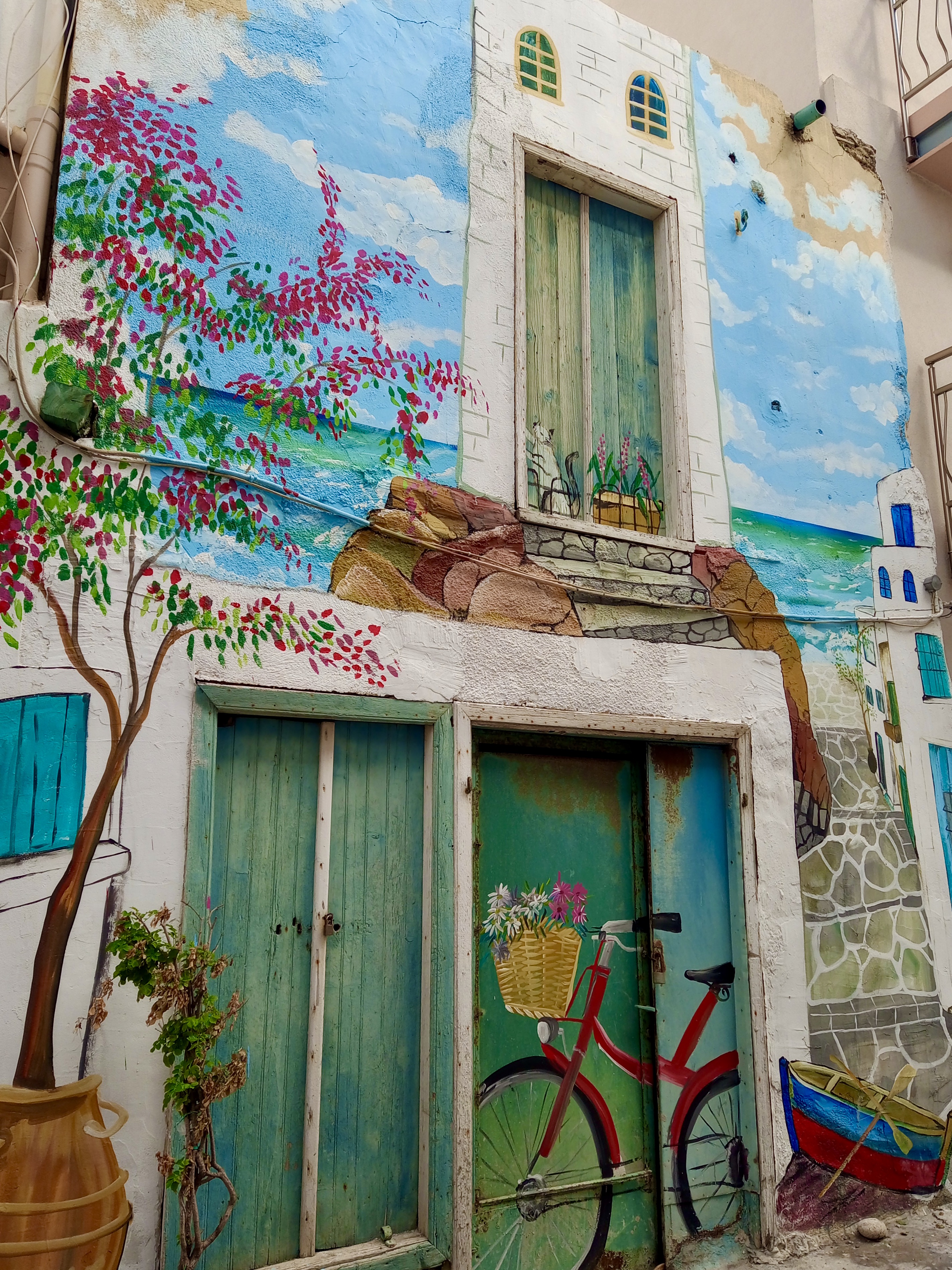 The above photo is of a building in one of the sidestreets of Ierapetra Old Town. It’s nowhere near as pretty as some ‘old towns’ it’s true, but it’s still surprising what it turns up when you go strolling around looking for something photogenic. What I love about the artwork above is the cat on the upstairs shutters. Takes all sorts, I suppose.