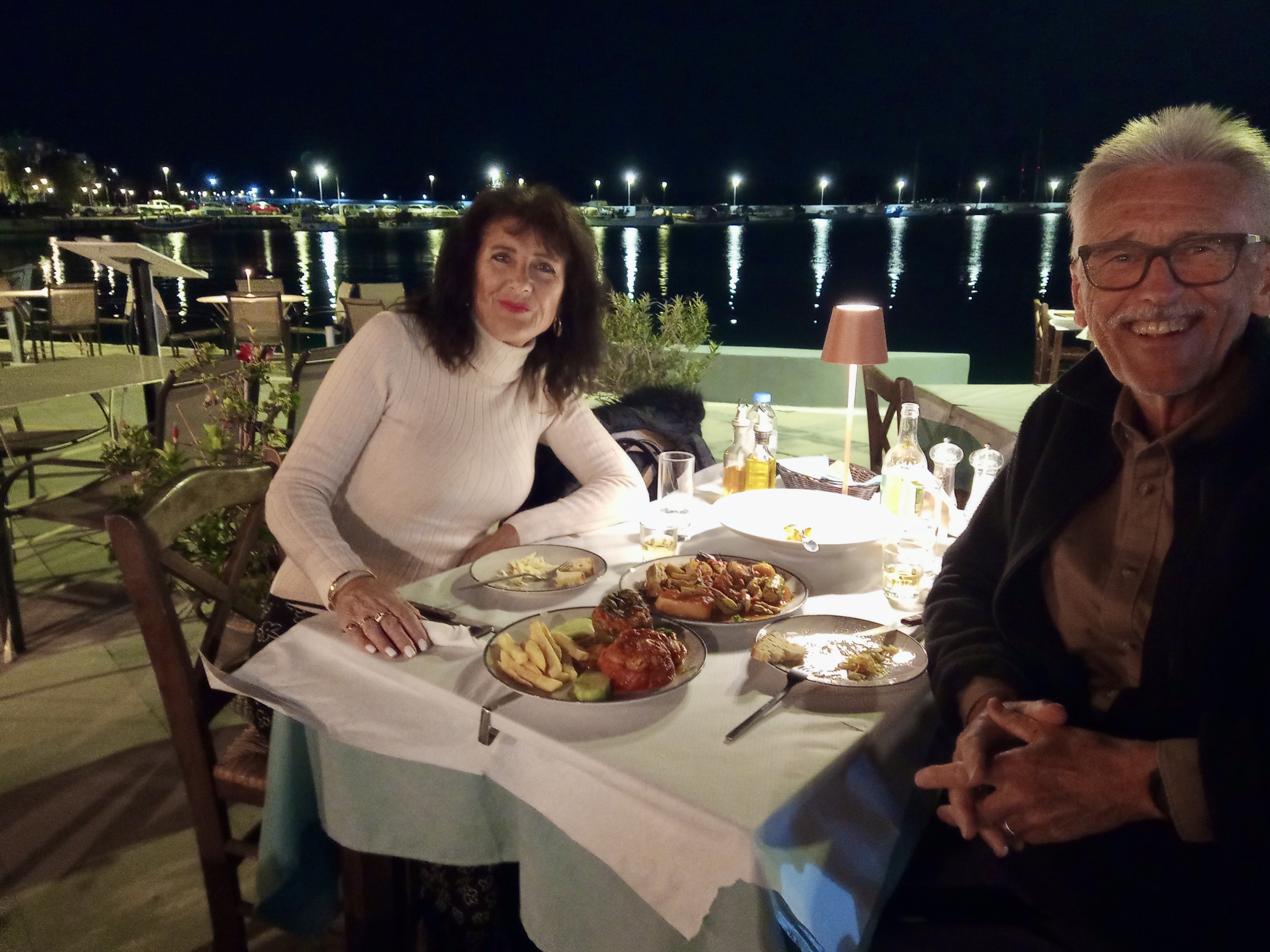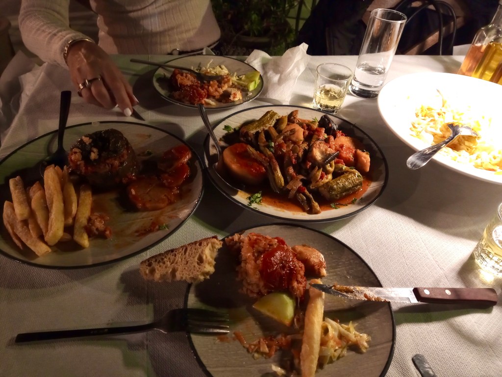 In fact, we’ve made the executive decision that we’re going to the Limani every second evening, and we’ll go elsewhere on the other nights to see what else takes our fancy. Thus, we were there again on Monday, when we ate courtesy of my lovely sister Jane, who gave us a nice anniversary gift of a wad of cash, much of which went on Monday’s meal, when we ordered gemista and fasolakia (arguably the best fasolakia we’ve ever eaten anywhere. The only place that rivals the Limani for fasolakia in my mind is the Odyssey in the Old Town of Rhodes). Here’s Monday’s meal…