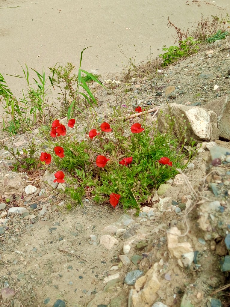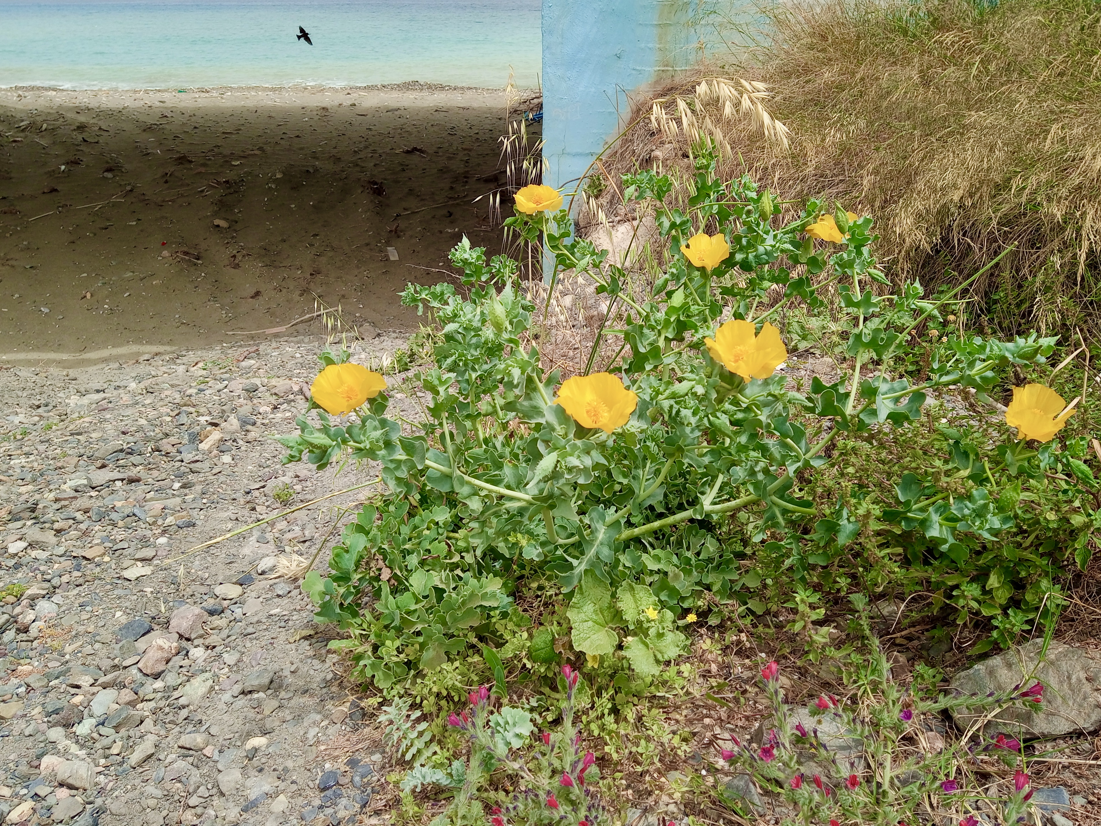 While we’ve been here in Sitia we’ve begun hearing the Bee-Eaters arriving as we sit on our balcony. Their particularly unique ‘whirring’ call is very distinctive, if you know what you’re listening for. Out for a walk the other day, I took the following photos, and unwittingly, while photographing a very lovely yellow-flowering plant that I haven’t as yet identified, I was amazed to see that I’d unwittingly captured a Bee-Eater in the background. See if you can spot it. I have to say, it is a bit far away, but they have a very distinctive silhouette too, and anyone who knows their shape will spot it instantly (I’m sure you’re aware that you can click on any individual photo to get a larger view. Once there you can even right-click to get it larger still, I think!) …