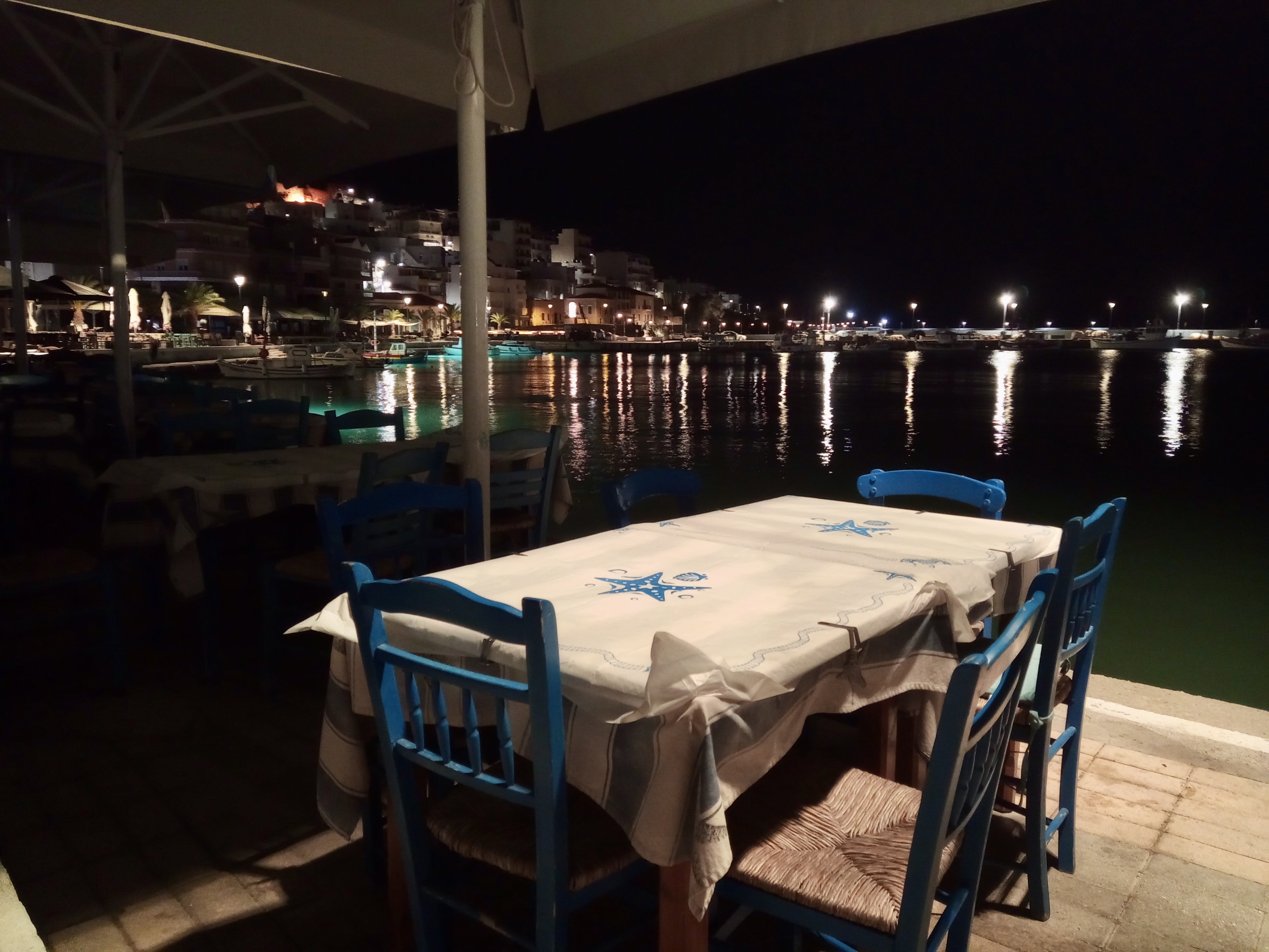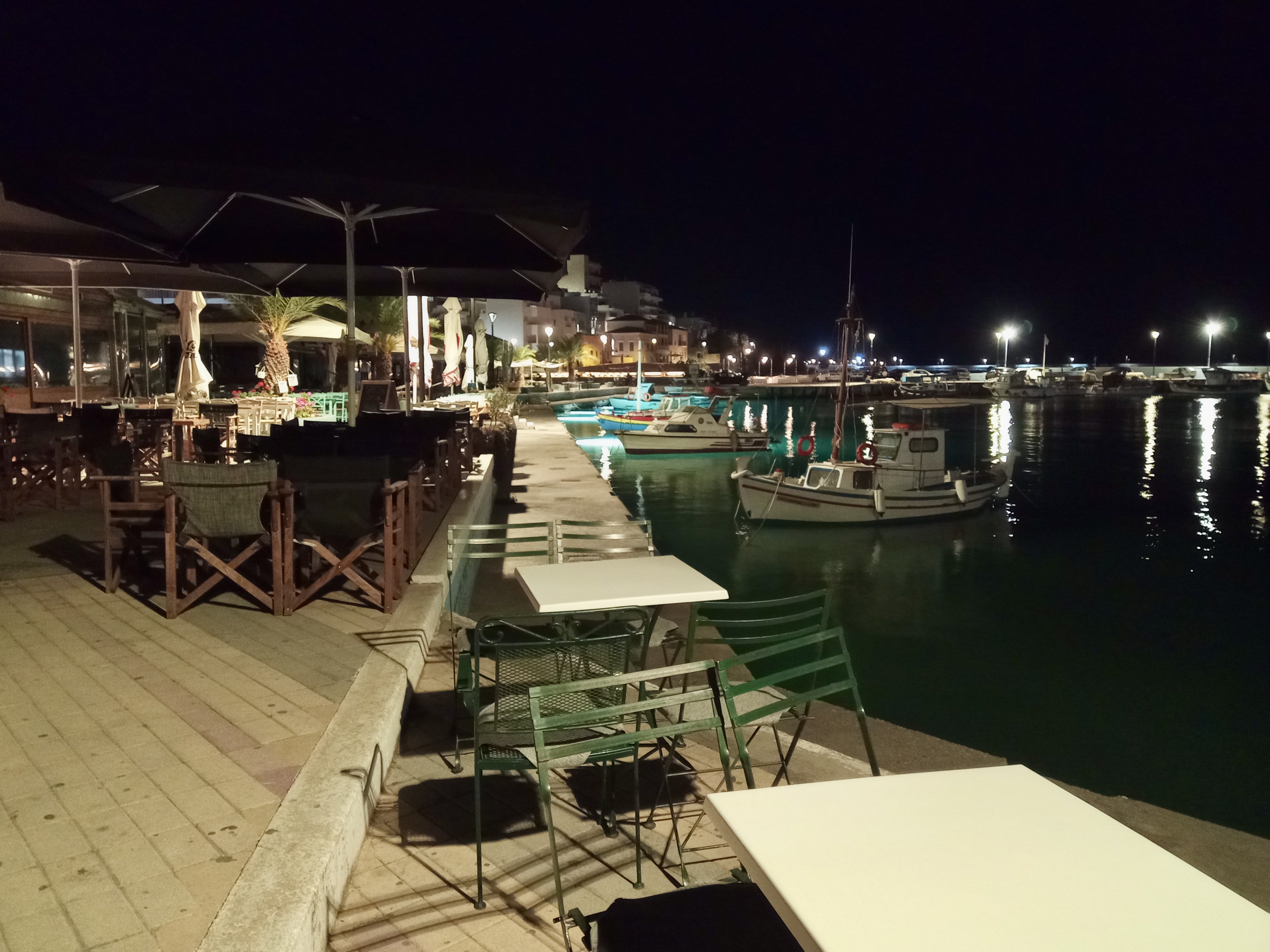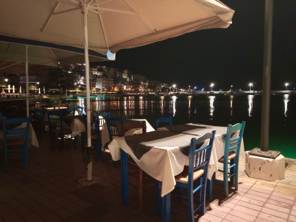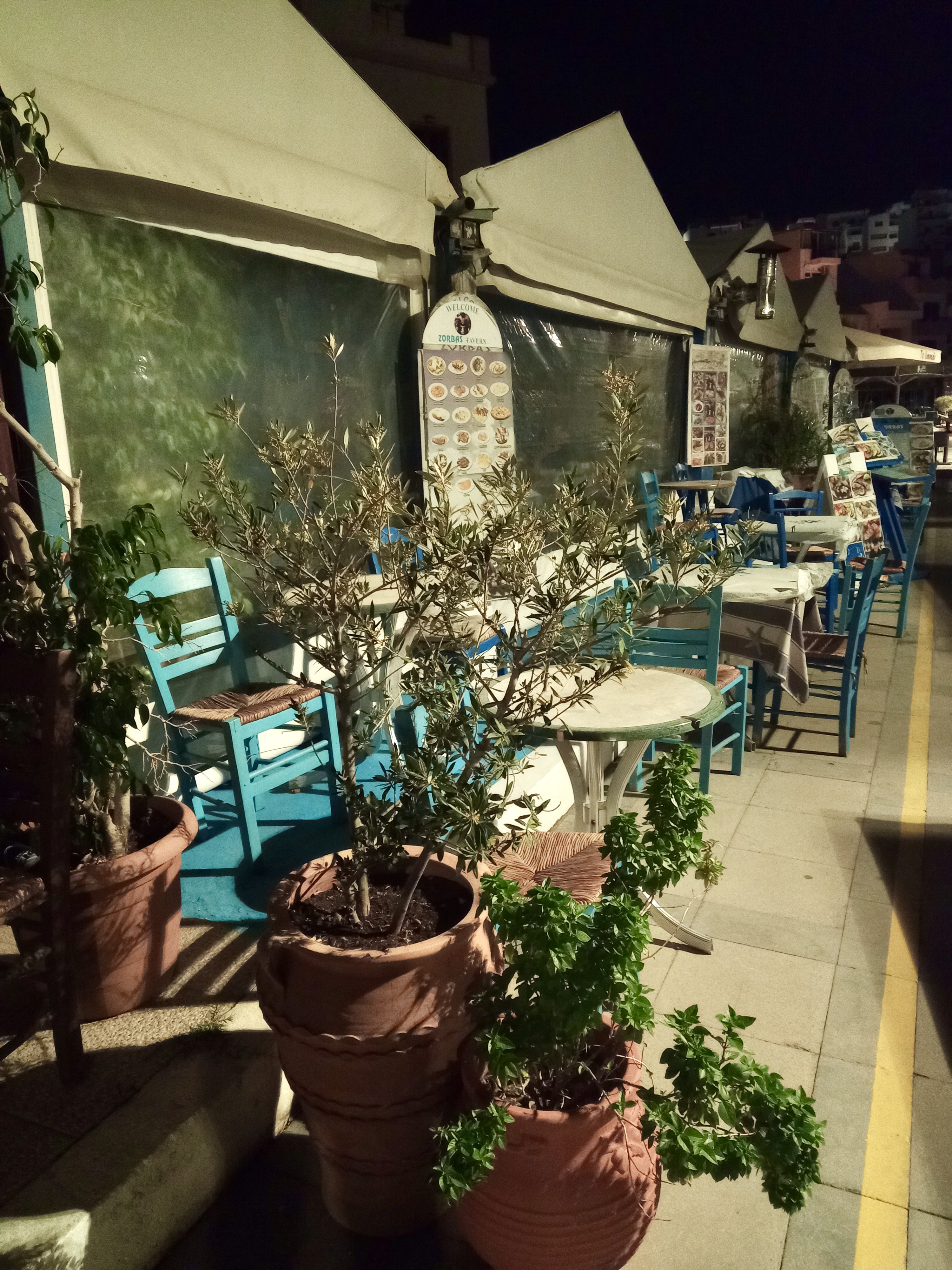 Something else which says a lot about life in this little corner of the world, and once again I know I’ve probably laboured this point before, is the fact that everywhere you go in the dead of night, all the cafés and restaurants have left their tables and chairs in situ outdoors. Come on, let’s be honest, can you imagine anywhere in the UK (and a few other European countries besides) where businesses could do that? Even wandering the narrow shopping streets of Sitia (and this also applies to Ierapetra) you pass stores with large areas of glass, both windows and doors, that are only secured by a small security bolt at the bottom of the door. The store may be an electrical store selling computer accessories, a clothes or shoe shop, or whatever, but in most UK cities there would have to be roller shutters drawn down and closed tight during the night hours, surely. I walked those streets alone and in a complete sense of security, a blessing indeed.